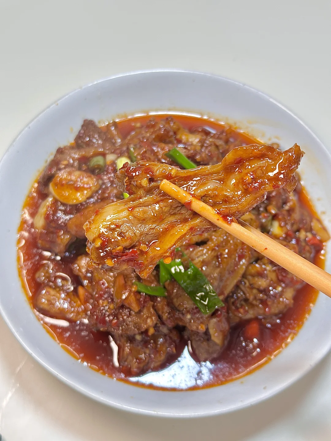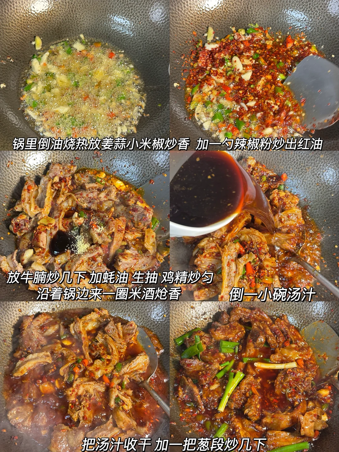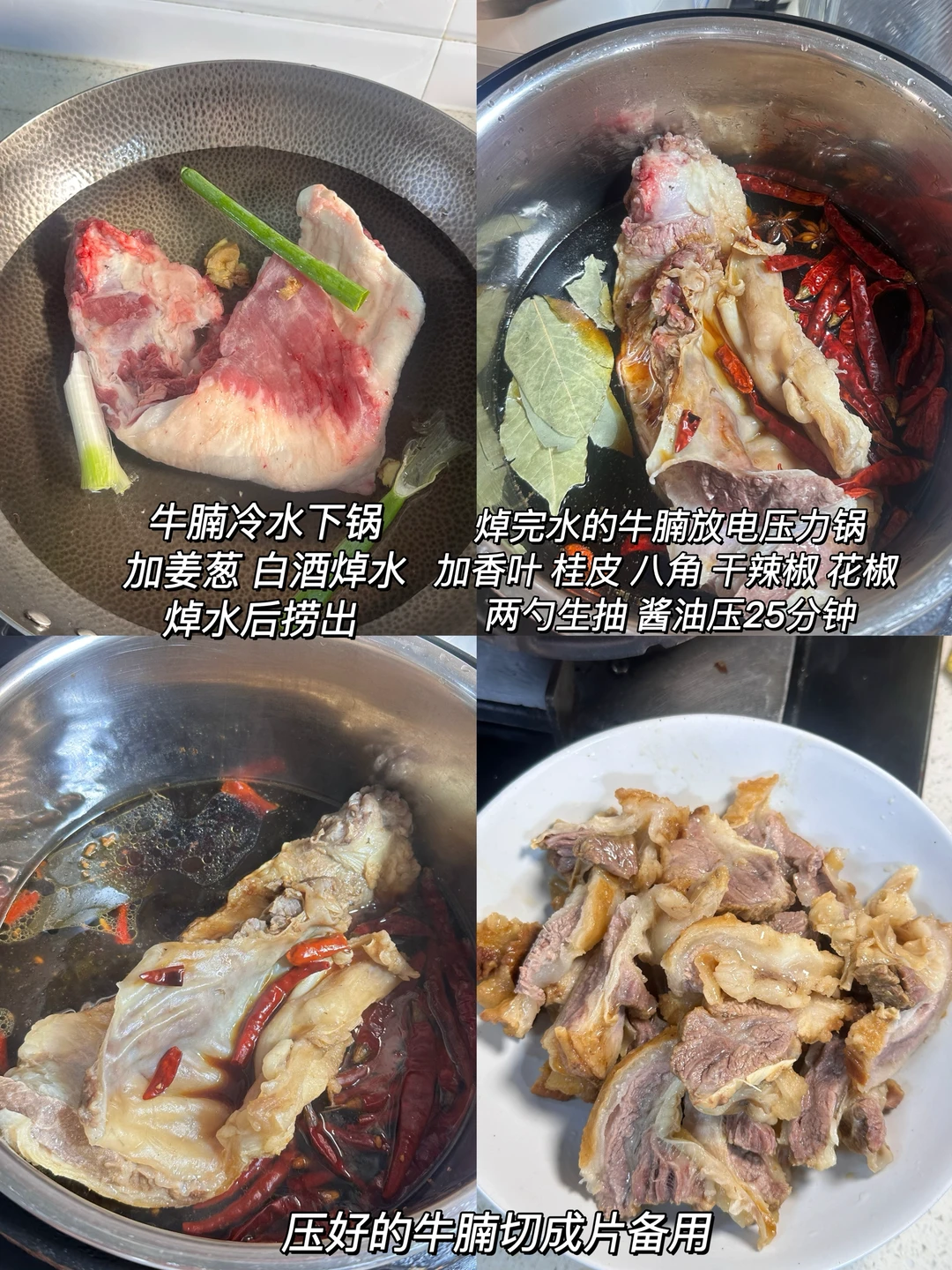 爆炒香辣牛腩 有筋有肉 巨入味,这个菜炫了两碗饭。吃习惯了炖的试试爆炒吧[偷笑R]很惊艳~ ✨食材:牛腩 姜蒜 葱 小米椒 桂皮 八角 香叶 花椒 干辣椒 1️⃣:牛腩整块冷水下锅,加姜葱 白酒煮开后夹出来放电压力锅,加桂皮八角 香叶 花椒 多多的干辣椒,两勺生抽 两勺酱油压25分钟。压好的牛腩切片备用。盛一小碗汤汁出来。 2️⃣:锅里倒油 放姜蒜 小米椒碎炒香,再加一勺辣椒粉炒出红油,倒入牛腩,加蚝油 生抽,鸡精炒匀,沿着锅边来一圈米酒增香,倒入汤汁煮几分钟,汤汁收干后放葱段炒几下。