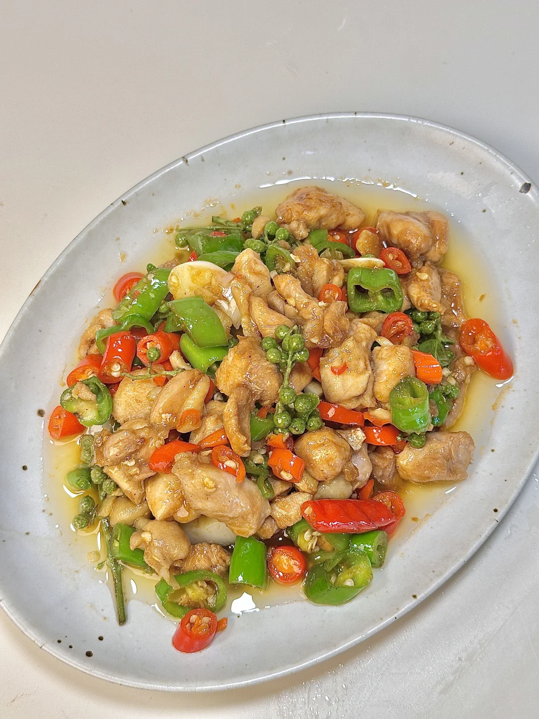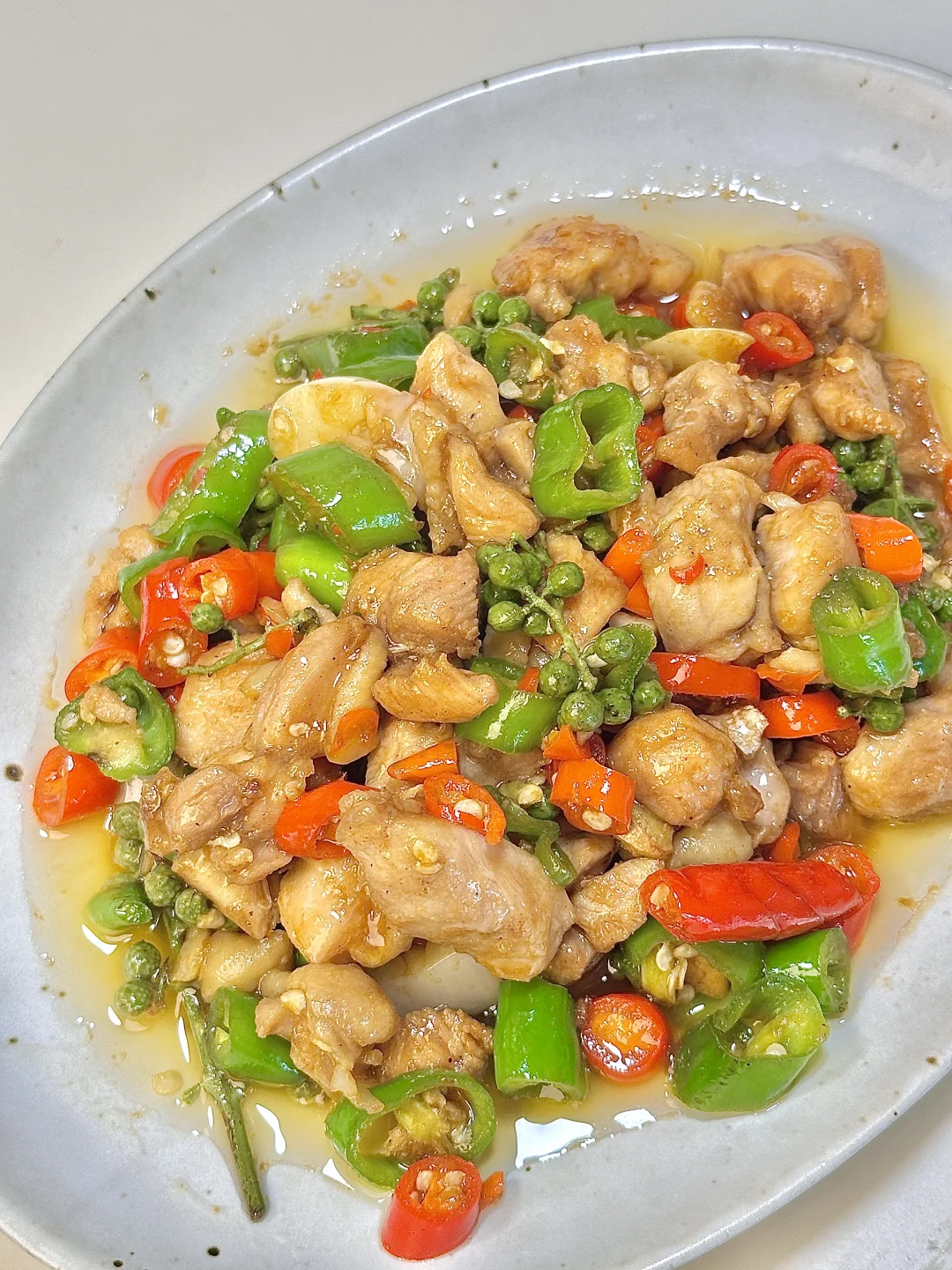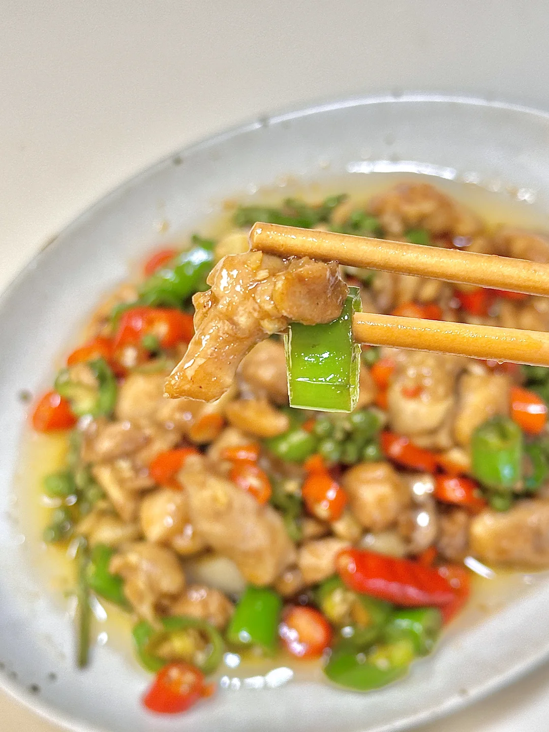 双椒鸡丁 加了些青花椒一起炒 更下饭~麻辣鲜嫩 能吃三碗饭[哇R]鸡腿肉嫩滑入味 青椒都炫光了~热气腾腾的三餐 ✨食材:鸡腿四个 青椒 小米椒 姜蒜 青花椒 1️⃣:鸡腿去骨切成小块加白胡椒粉 一丢酱油 生抽 淀粉拌匀腌制10分钟。锅里倒油烧热 放腌制好的鸡腿肉大火翻炒 炒干水分盛出。就着锅里的底油 放姜蒜 辣椒 青花椒炒出香味 把鸡肉倒回锅里,放生抽 蚝油 鸡精大火炒入味。想吃再麻点的可以淋半圈花椒油炒会儿。 好好吃饭呀🖖🏻