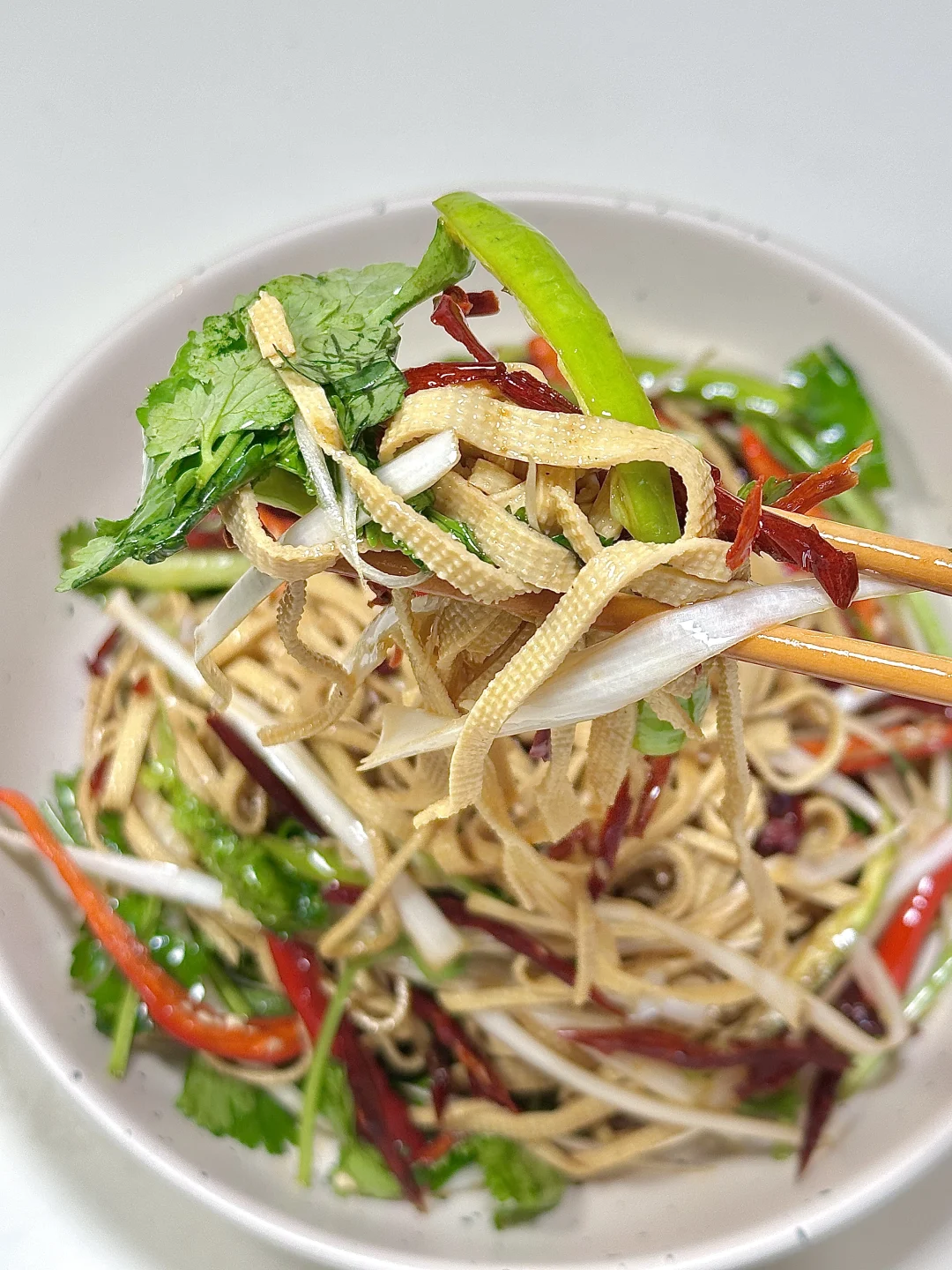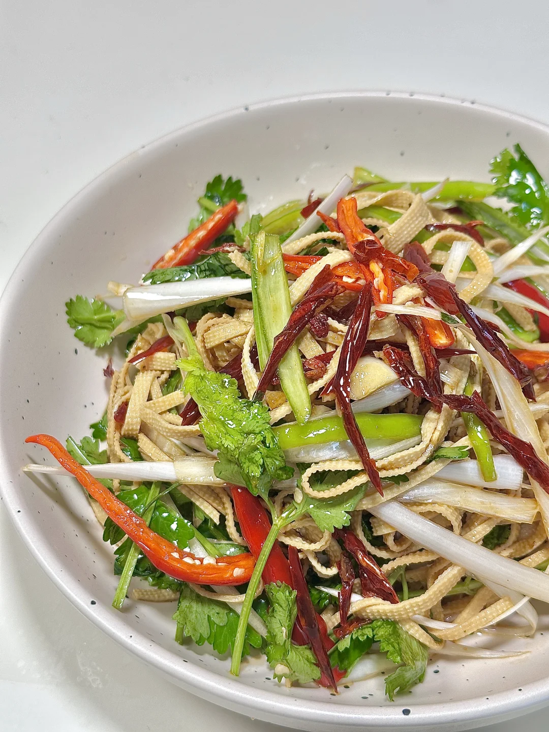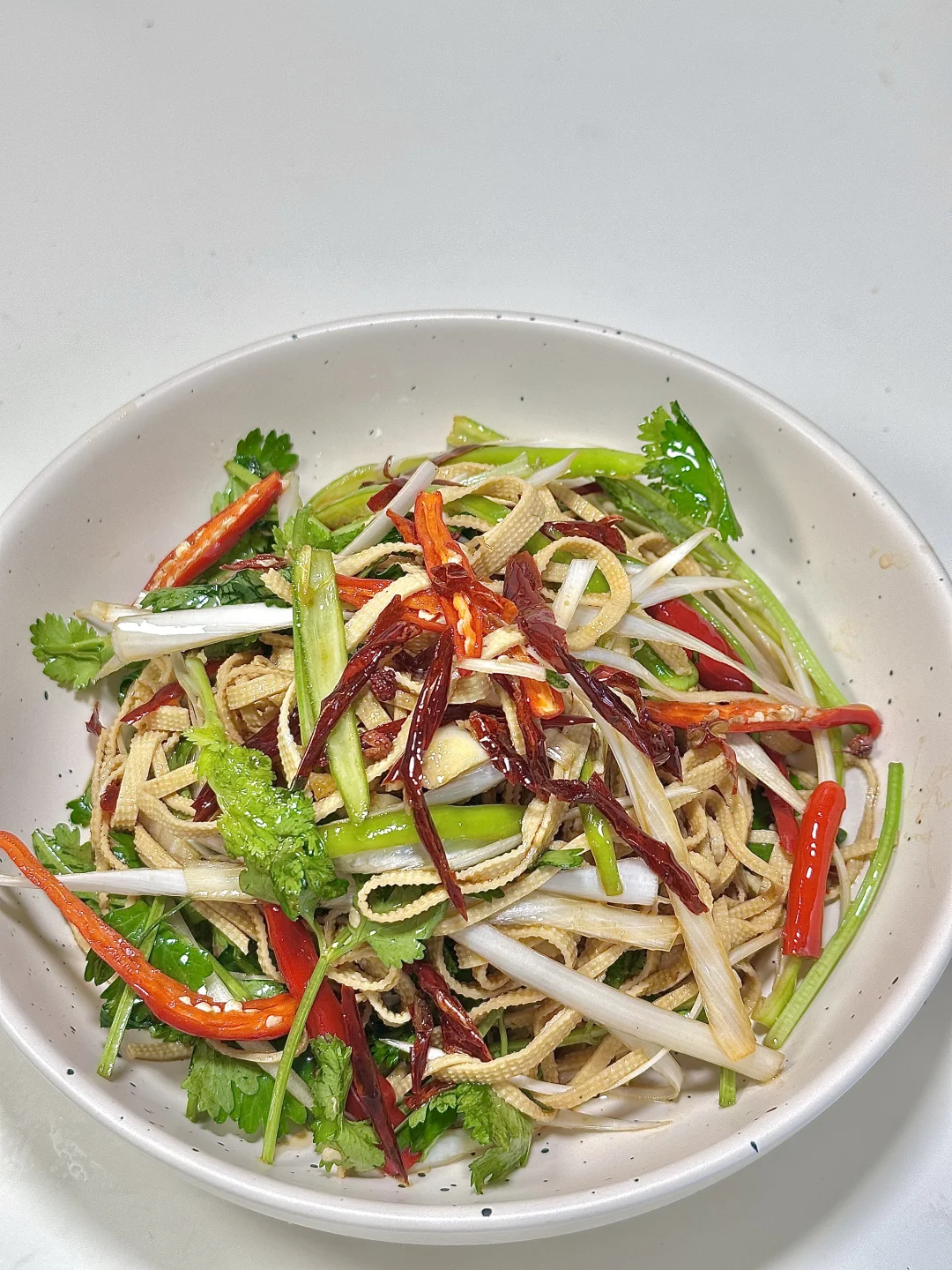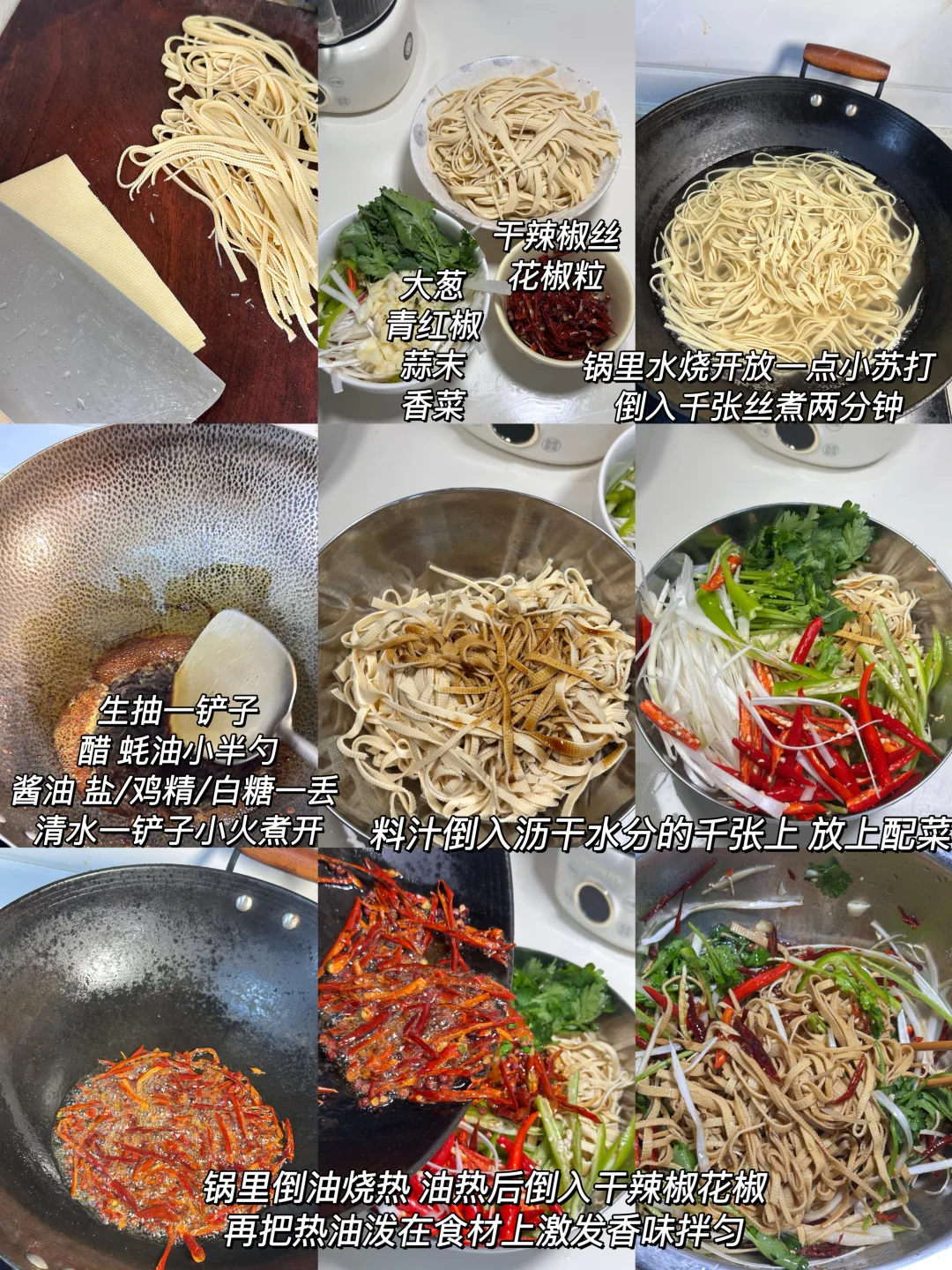 ✨食材:千张 大葱 青椒 小米椒 香菜 蒜末 干辣椒 花椒