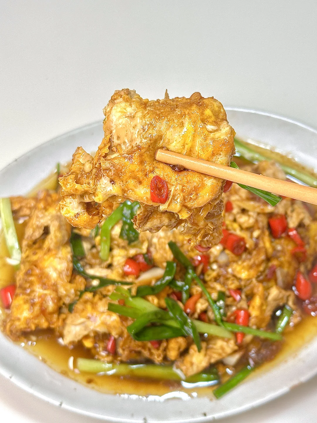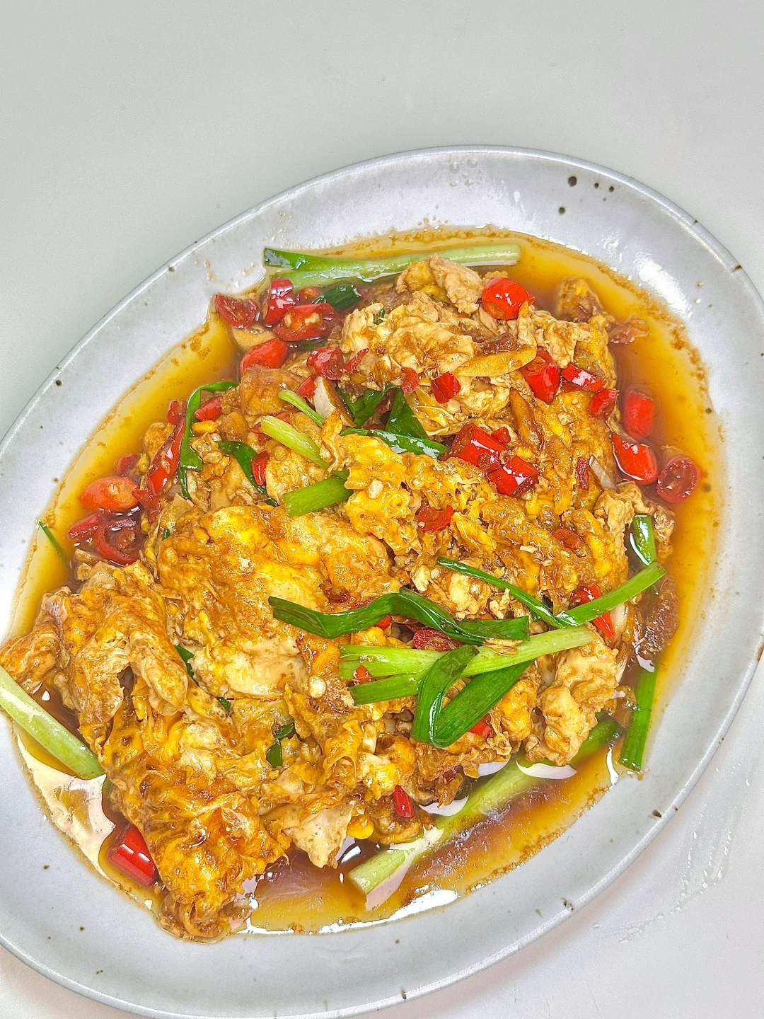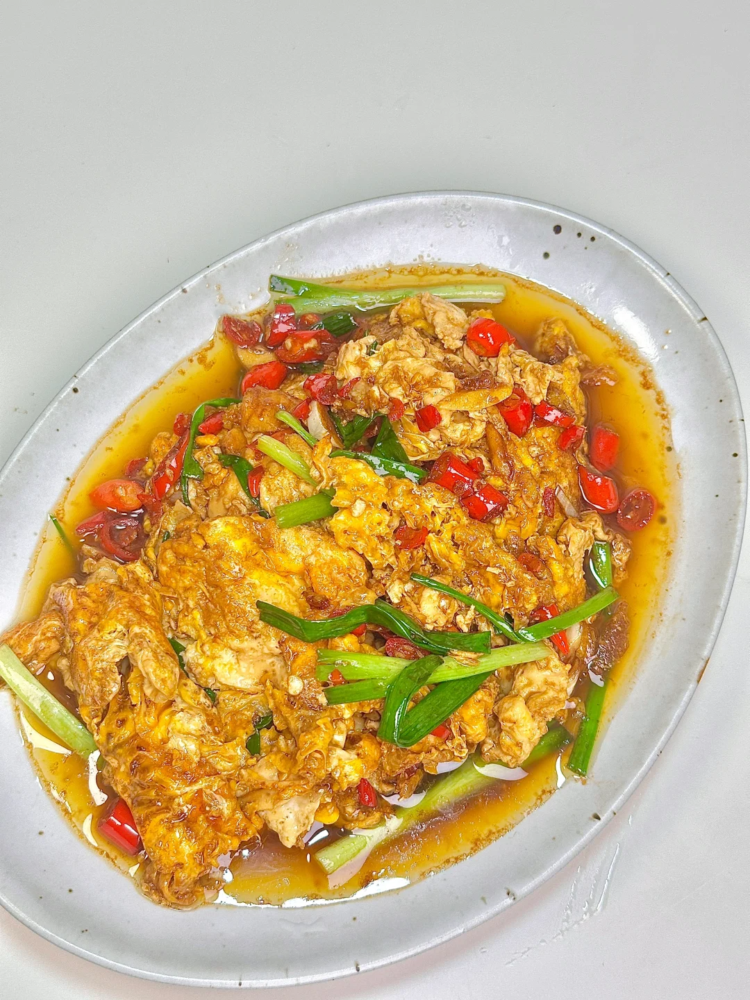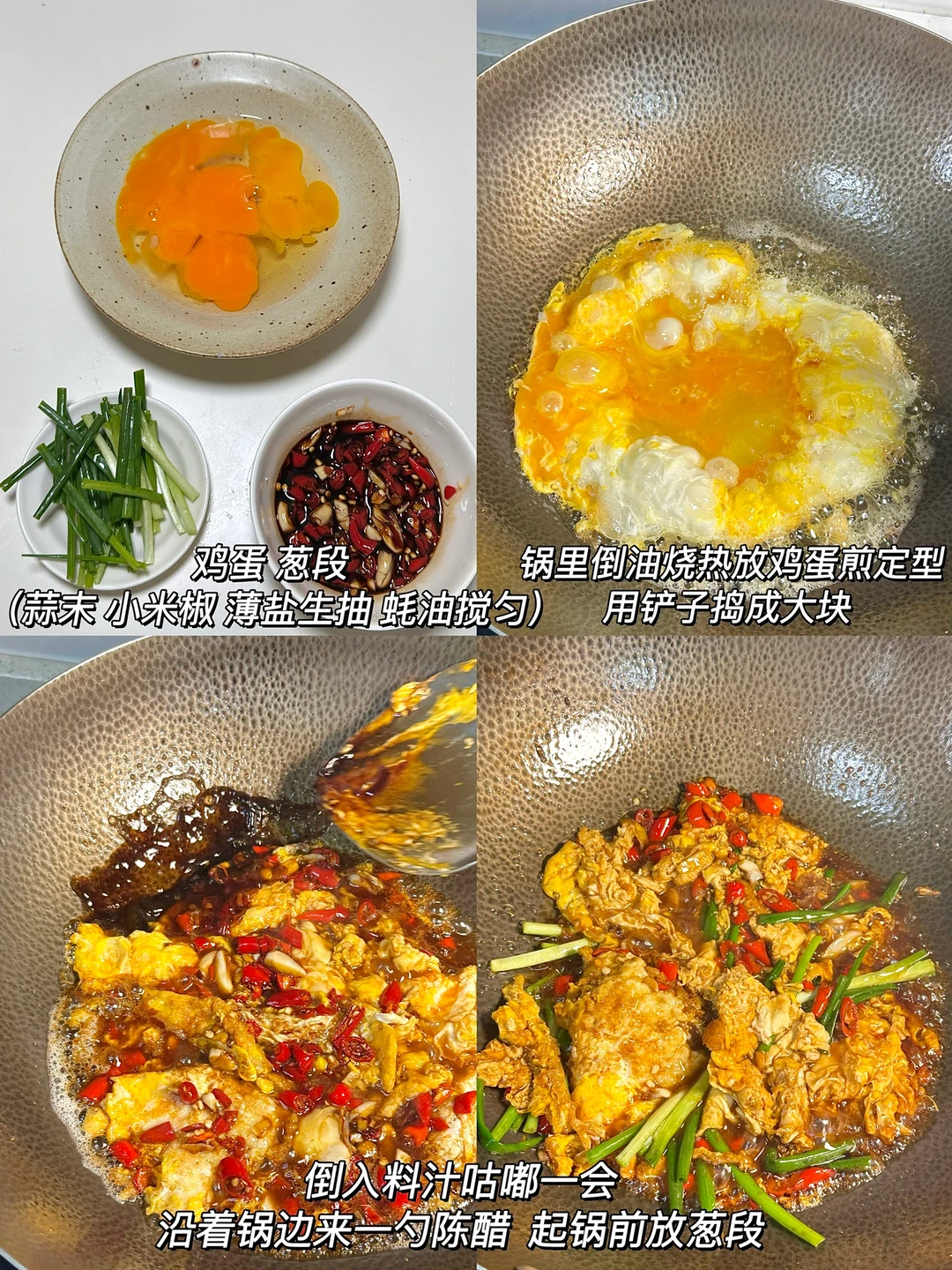 油爆醋炒蛋 简单下饭菜,吃不腻的做法。一定要试试! ✨食材:鸡蛋 葱 蒜 小米椒 1️⃣:鸡蛋4个敲碗里 用筷子戳破蛋黄。另外一个碗放蒜 小米椒 薄盐生抽 一丢蚝油搅匀。锅里倒油烧热 放鸡蛋煎到定型后铲成大块。倒入料汁小火咕嘟一会 沿着锅边来一小勺陈醋,加入葱段增香。 好好吃饭呀🖖🏻