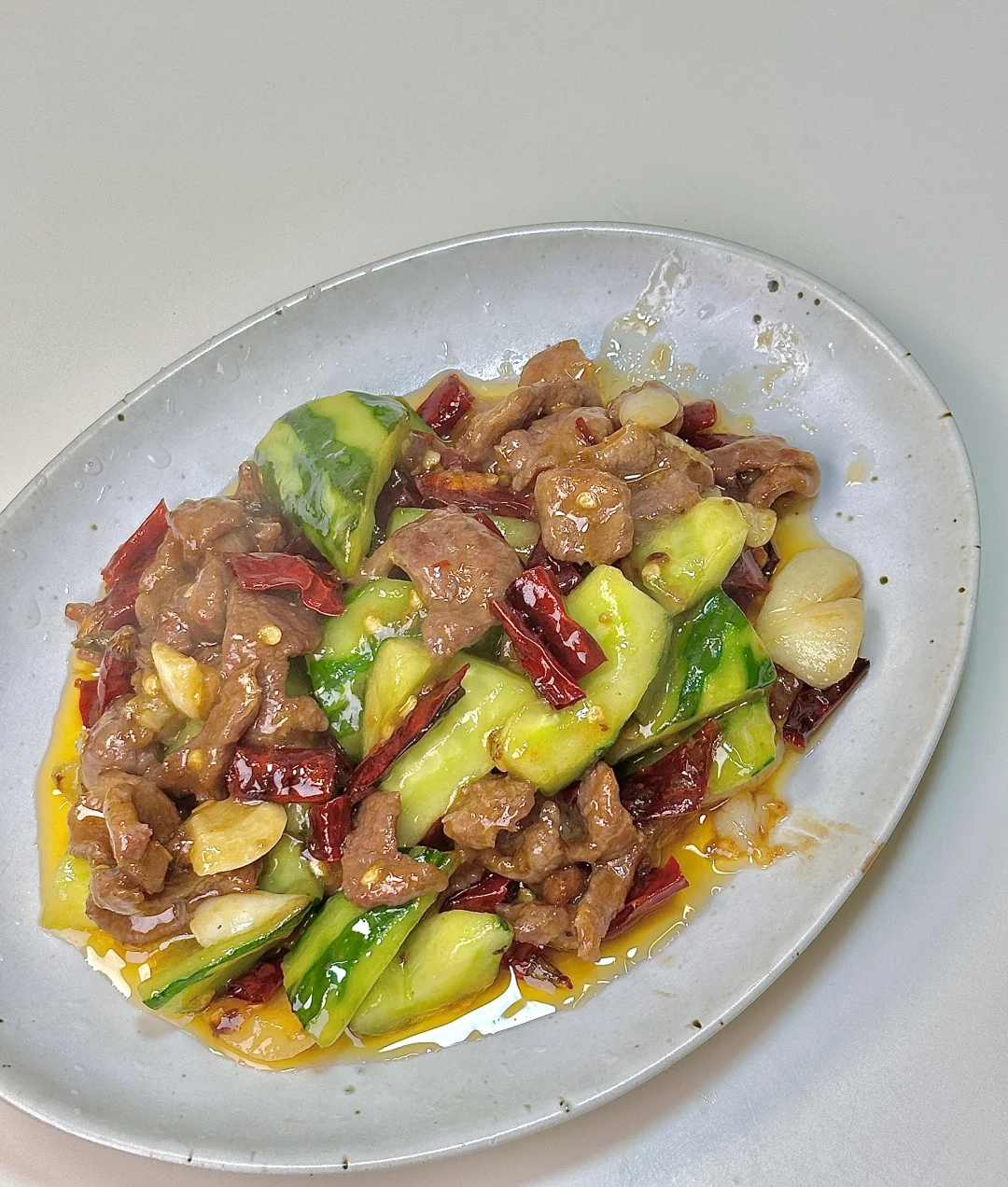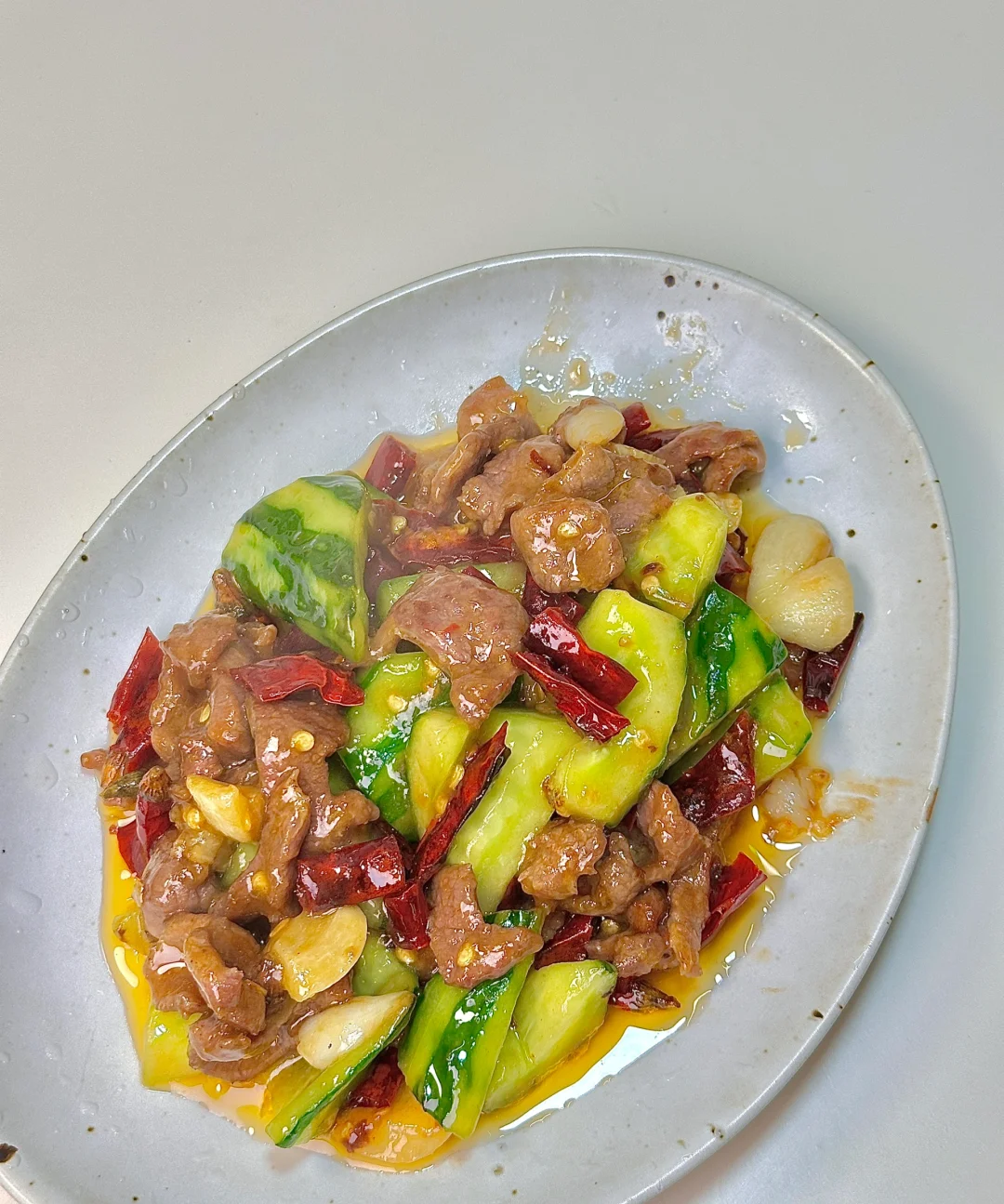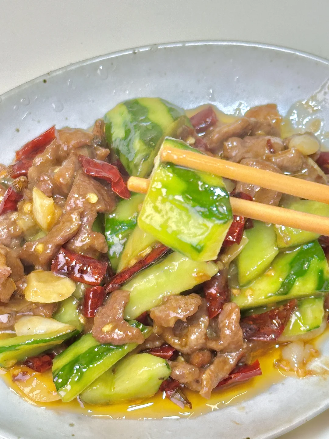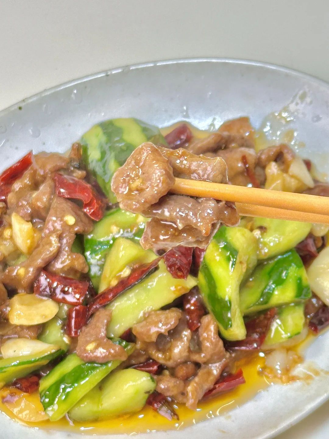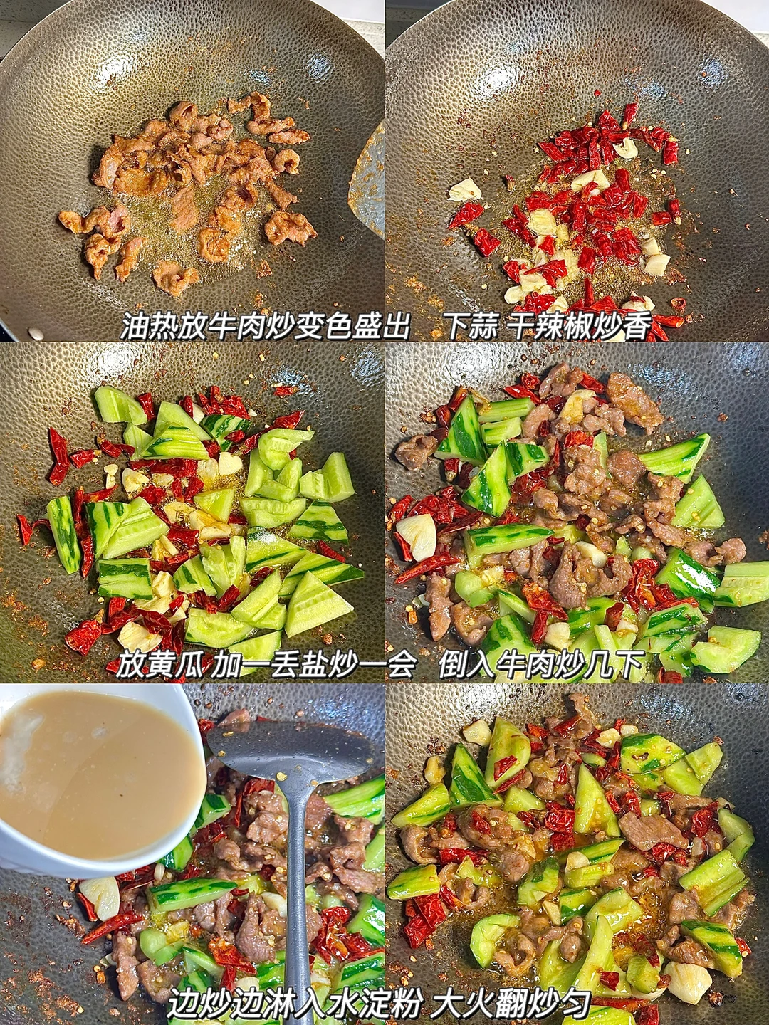 黄瓜炒牛肉🥒 锅气十足 清脆爽口又解腻~黄瓜去瓤炒完不出水,特别脆 干辣椒炝锅的香味混合食材真的太赞了!我的宅家美食日记 ✨食材:黄瓜 牛肉 干辣椒段 蒜末 淀粉水(蚝油 鸡精 猪油 生粉 三勺清水) 1️⃣:黄瓜削皮的时候留一部分,一分为二 瓜瓤切掉,再切块备用。牛肉加生抽 蚝油 胡椒粉 红薯粉抓匀上浆后倒食用油锁住水份腌制10分钟。 2️⃣:锅里倒油烧热下牛肉平铺煎变色盛出,放蒜 干辣椒炒出香辣味,再倒入黄瓜 一丢丢盐炒几下,倒入牛肉炒两下,再边炒边淋入淀粉水炒匀。 好好吃饭呀🖖🏻