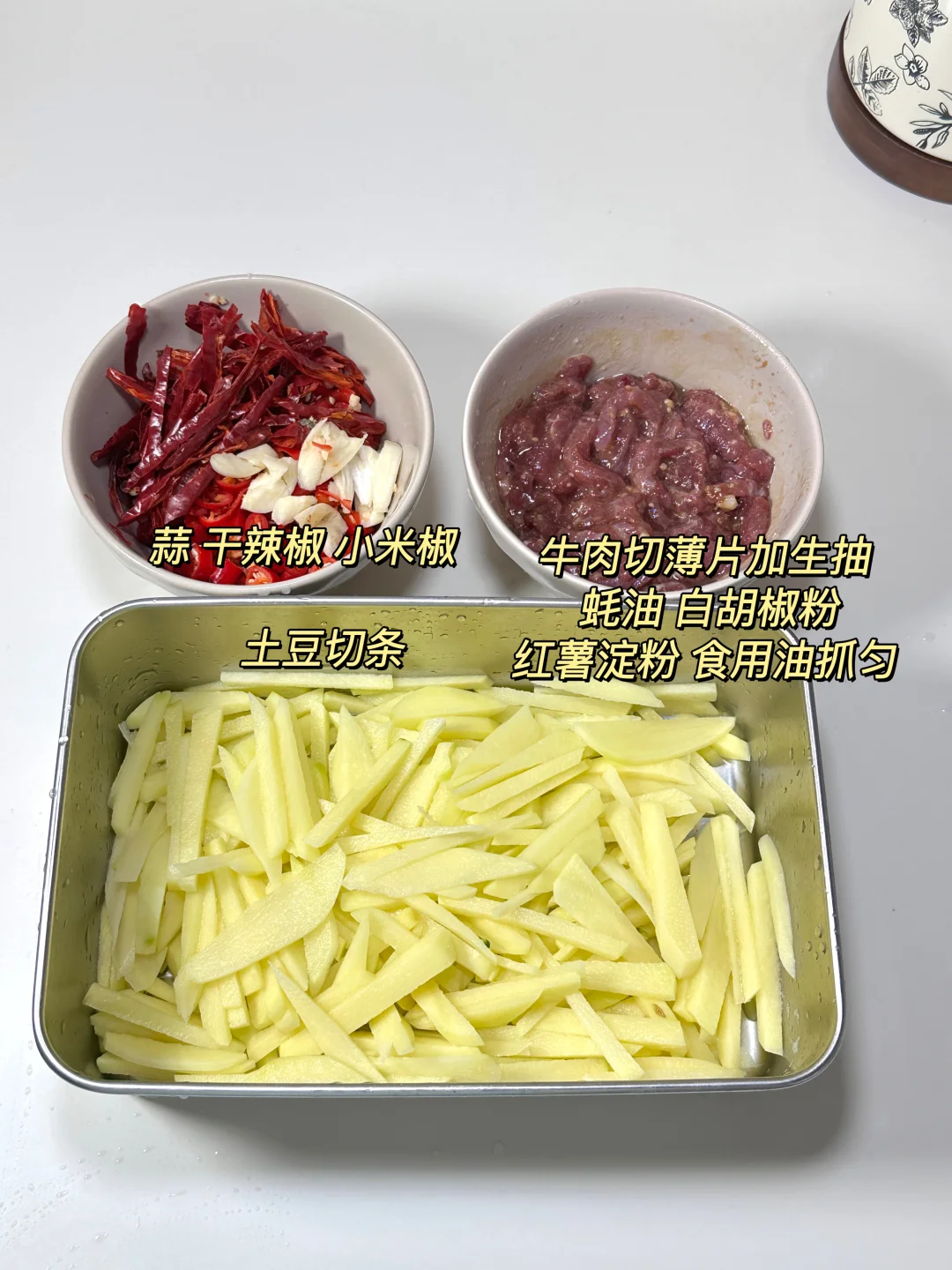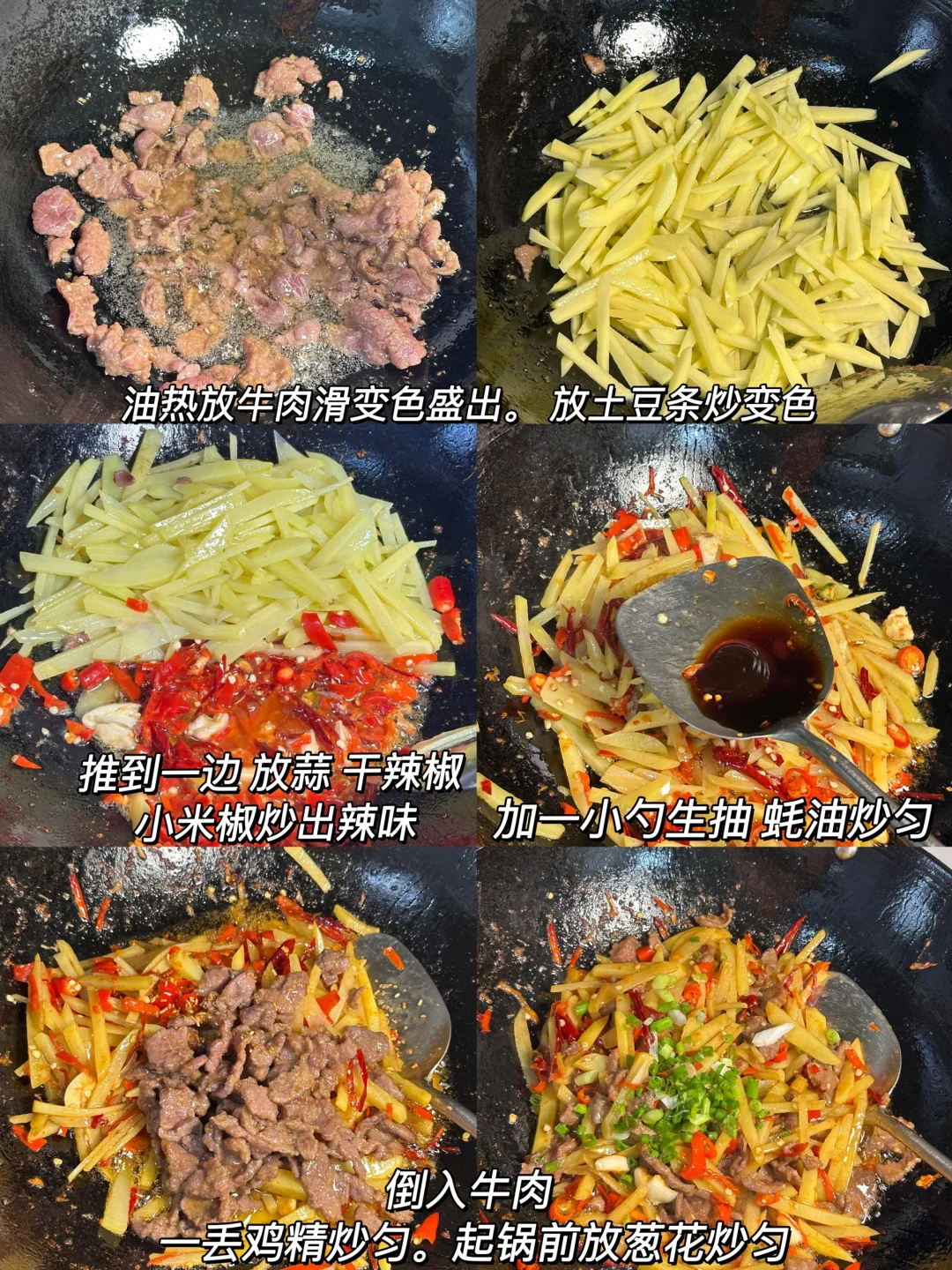 炫了两碗 盖饭吃好好好好香[派对R]黄心小土豆切成条炒真好吃😋在春天幸福地吃饭 ✨食材:土豆🥔 牛肉 蒜末 小米椒 红椒 葱花 1️⃣:土豆去皮切稍厚一点的片再改刀切成条,用流动的清水冲洗干净表面淀粉。牛肉逆这纹路切薄片加生抽 蚝油 白胡椒粉 红薯粉 食用油抓匀腌制。 2️⃣:锅里倒油烧热 放牛肉炒变色捞出,再下土豆条炒到变色 推到一边放蒜 小米椒 干辣椒炒香,调味加一小勺生抽 蚝油 炒出酱香味。倒入牛肉 一丢鸡精爆炒出锅气 起锅前放葱花增香。 好好吃饭呀🖖🏻