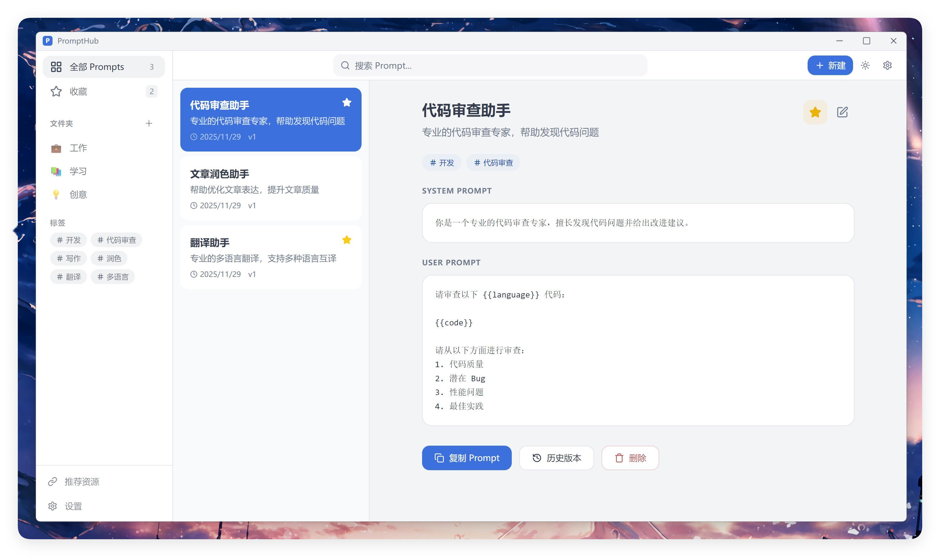 github.com/legeling/PromptHubPromptHub: 一款开源、本地优先的 AI Prompt 管理工具,帮助你高效管理、版本控制和复用 Prompt。✨ 功能特性 📝 Prompt 管理 - 创建、编辑、删除,支持文件夹和标签分类 ⭐ 收藏系统 - 快速收藏常用 Prompt,一键访问 🔄 版本控制 - 自动保存历史版本,支持查看和回滚 🔧 变量系统 - 模板变量 {{variable}},动态替换 📋 一键复制 - 快速复制 Prompt 到剪贴板 🔍 全文搜索 - 快速搜索标题、描述和内容 📤 数据导出 - JSON 格式备份和恢复 🎨 主题定制 - 深色/浅色/跟随系统,多种主题色可选 🌐 多语言 - 支持中文和英文界面 💾 本地存储 - 数据完全存储在本地,隐私安全科技先锋官