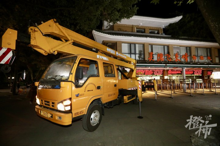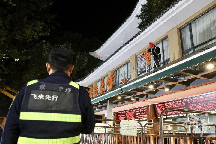 今晚6点,工作人员对灵隐飞来峰景区售票处的“售票处”标牌进行拆卸,并更换为“综合服务中心”标牌。