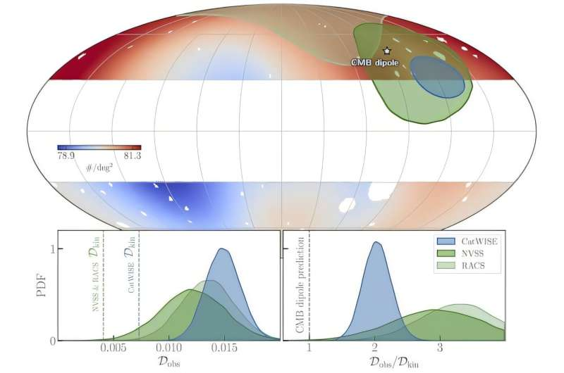 物质与CMB偶极子不匹配——方向一致(上面板),但振幅不一致(下面板)。图:现代物理评论