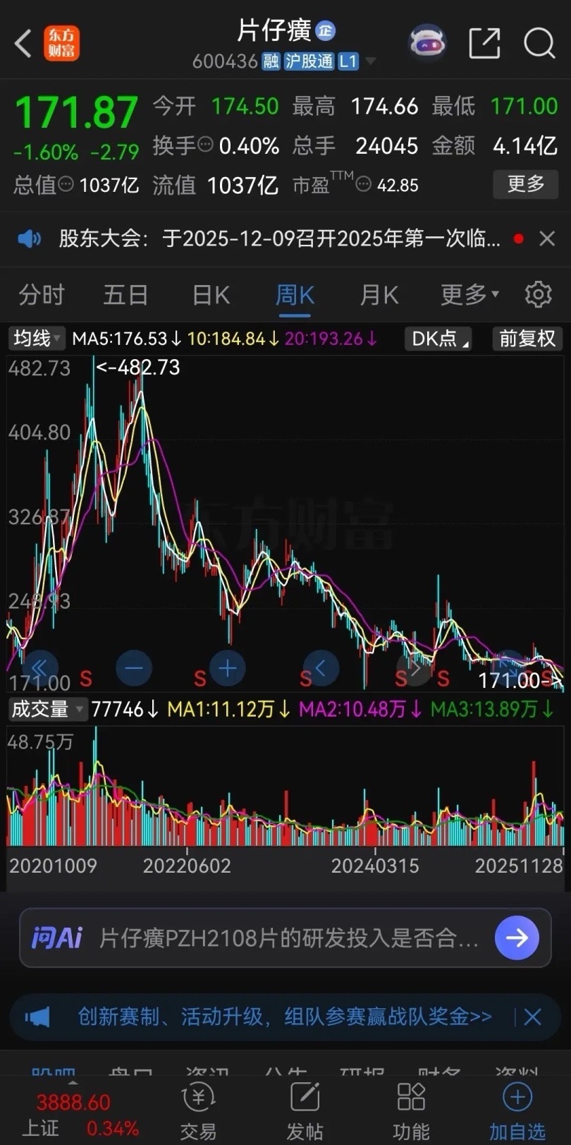 片仔癀这走势,让股民们泪奔!周五片仔癀盘中最低跌到了最低171元,收盘股价报收于171.87元,创出了今年以来新低,并且比去年9月份大盘2600多点时的最低价还要低,相当于大盘2500点以下了,至少落后大盘1500点。不但如此,也创出了近四年的新低,目前已经较高位下跌了65%,可以说近四年进场做价值投资的股民,目前全部被套,无一幸免!有一点不明白,从走势上看,近一年来股价一路崩盘式下跌,典型的下降通道,为何还有那么多股民奋不顾身的去抄底呢?