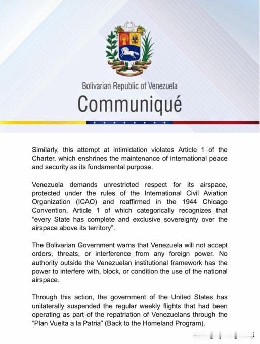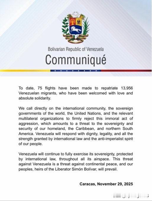 🇻🇪🇺🇸委内瑞拉外交部谴责特朗普宣布关闭委内瑞拉领空,称其为侵犯委内瑞拉主权的侵略行为。 11月29日,委内瑞拉外交部就美国总统唐纳德·特朗普宣布对委内瑞拉实施飞行限制措施发表官方声明。加拉加斯方面将此举定性为旨在破坏委内瑞拉领空主权的“殖民主义威胁”,并称其为针对委内瑞拉人民的新型“非法且无理的侵略”。 委内瑞拉方面认为,美国此举意在使从第三国或美国海军航母上动用空天武器进行进攻性行动合法化。 与此同时,美国海军和空军正迅速向委内瑞拉边境附近部署兵力,并以打击贩毒集团为借口威胁要袭击委内瑞拉的军事基础设施。
