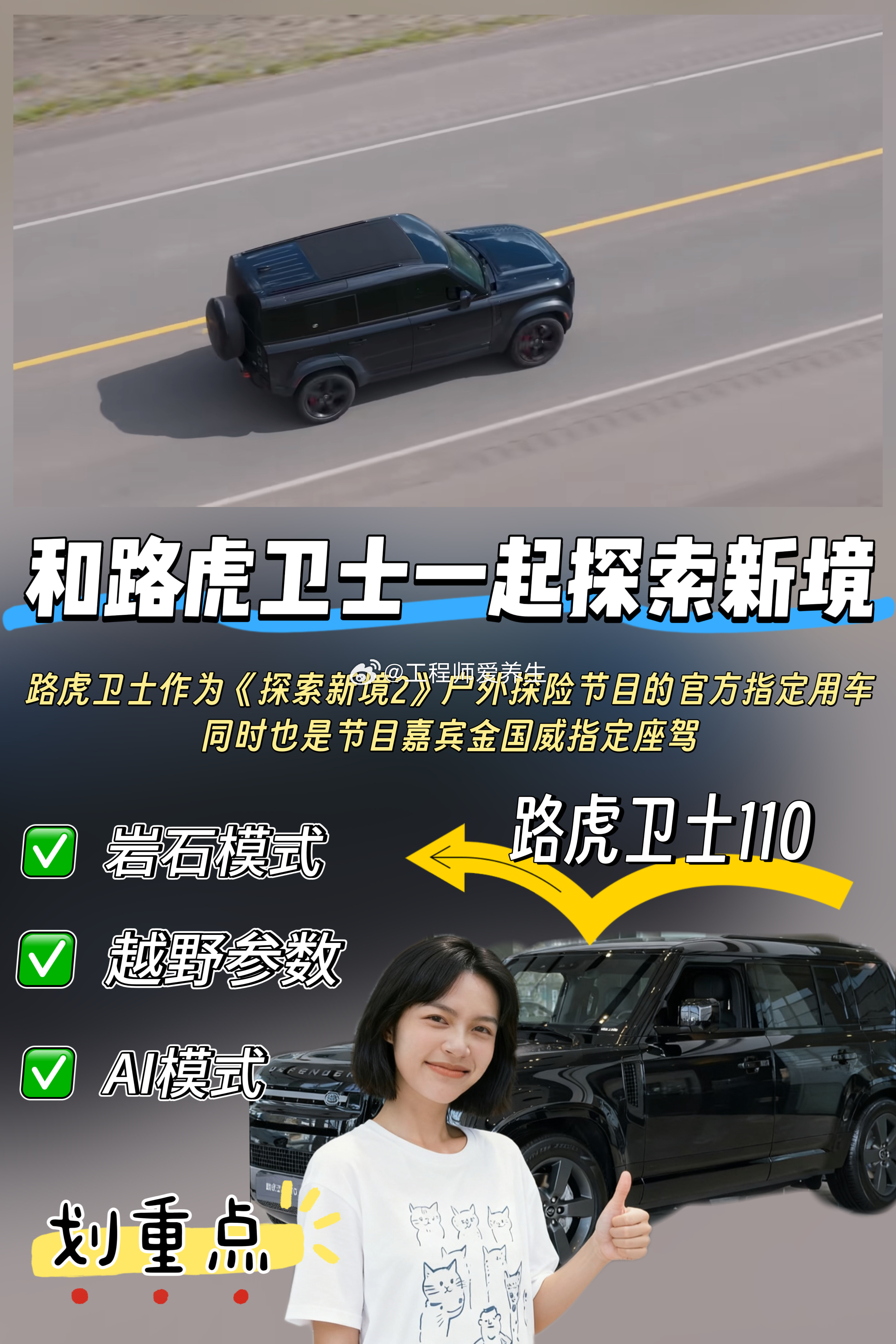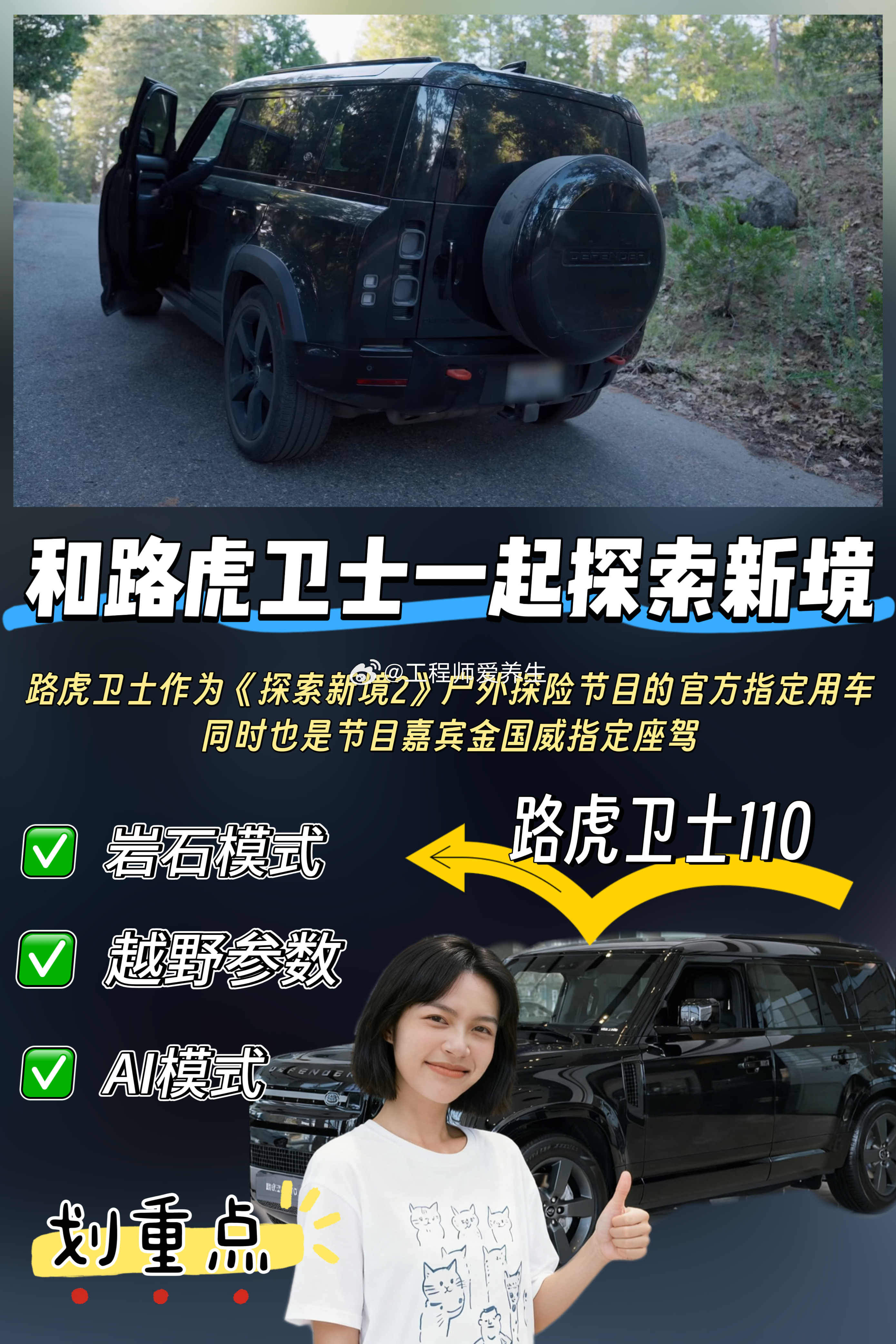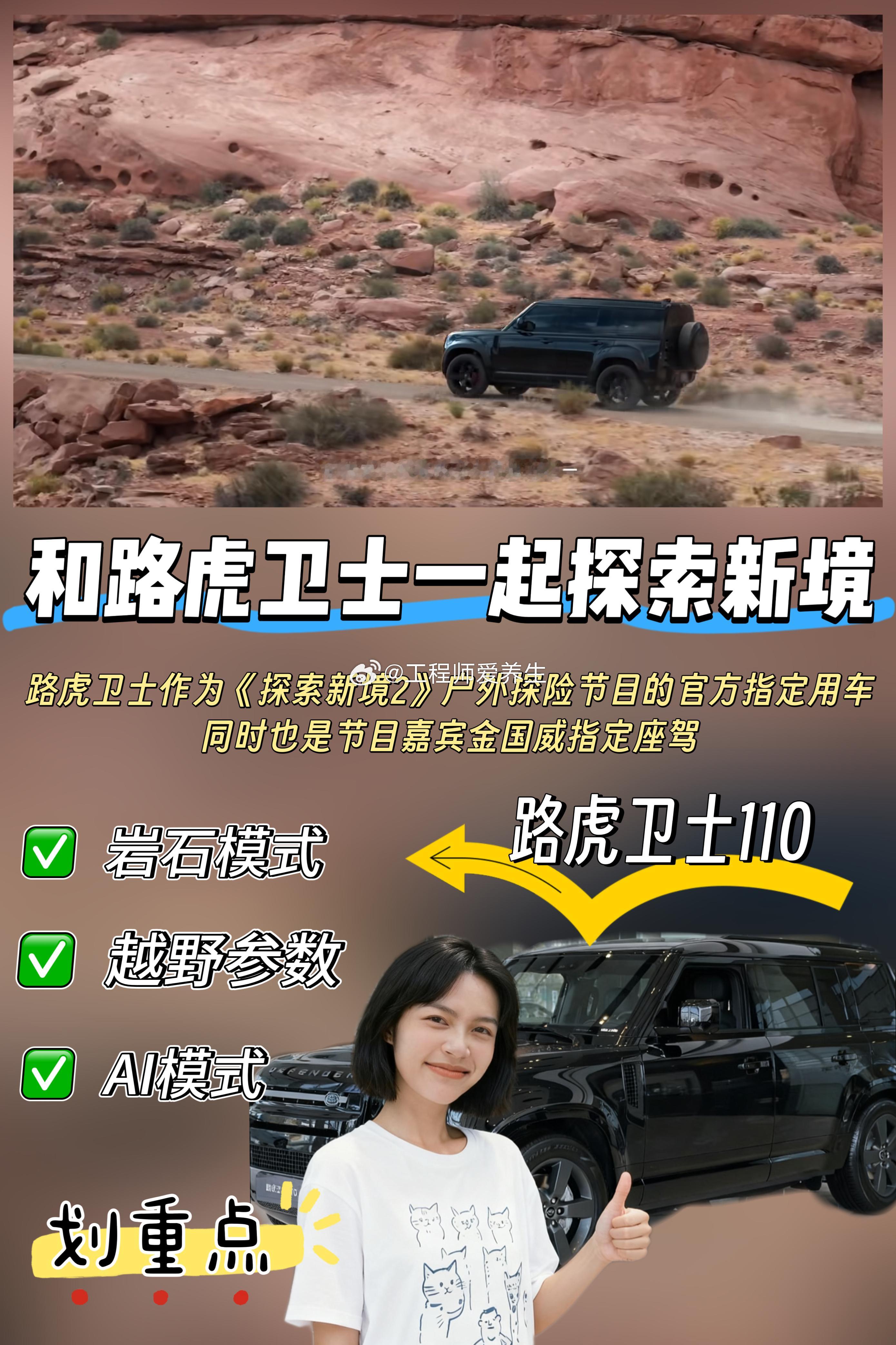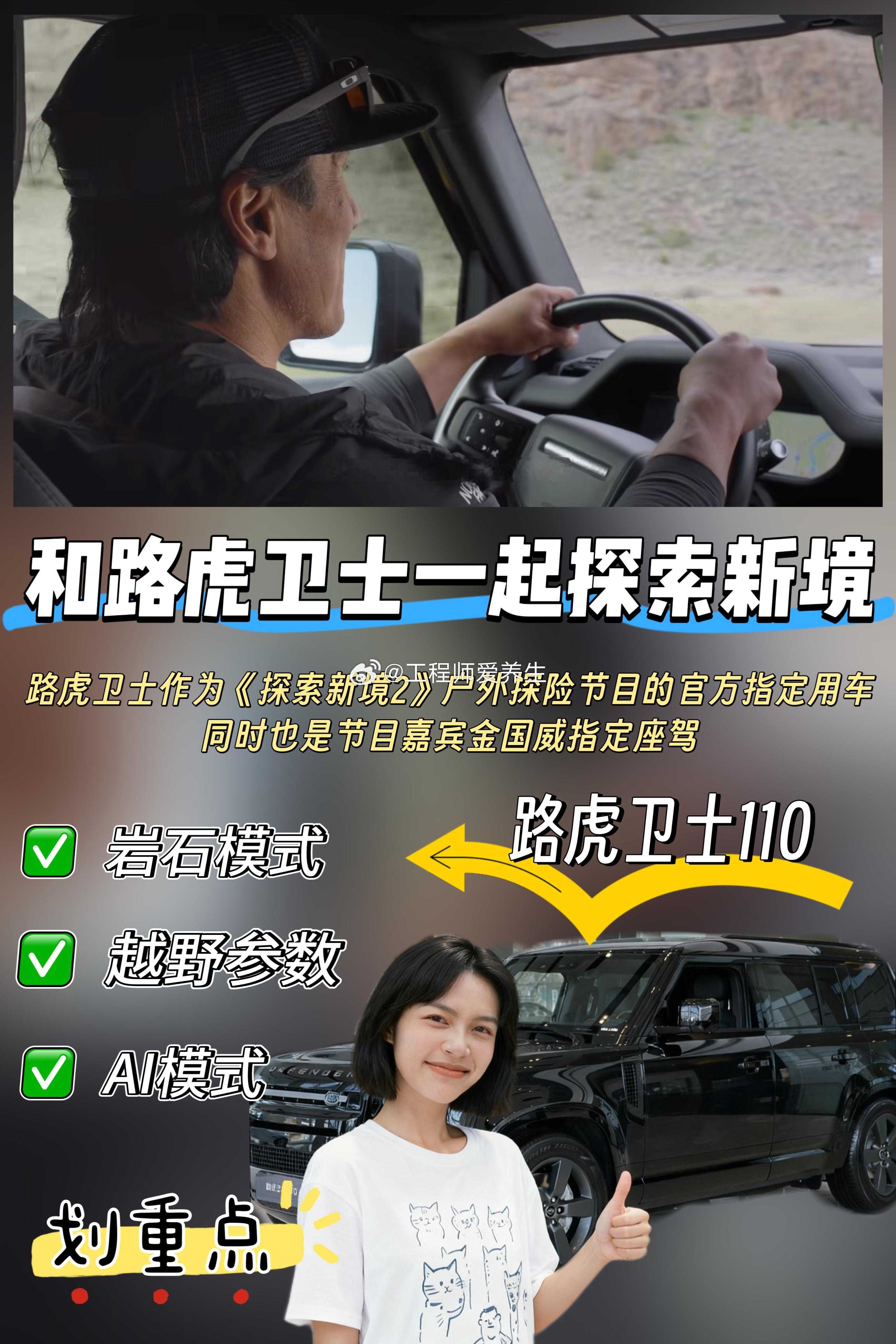 探索新境路虎卫士 ❓朋友们你们看《探索新境2》了吗,有没有看到节目嘉宾金国威指定座驾——路虎卫士。🎉🎉路虎卫士是《探索新境2》户外探险节目的官方指定用车!节目中那陡峭岩壁上,路虎卫士的车轮稳稳咬住每一寸崎岖,如同行走在自家后院般从容 🚙💨漫天黄沙中,一曲交响乐在车内流淌——这是《探索新境2》中路虎卫士带给我的魔幻体验🎵。作为节目的忠实观众,我见证了奥斯卡导演金国威驾驶这头钢铁猛兽,征战北美极限地形的每一个瞬间。当屏幕中金国威启动全地形反馈适应系统,一键切换至“岩石模式”,精准的低速控制让车辆在嶙峋岩壁上稳如磐石时,我不禁想起了自己与卫士的初次邂逅✨。🚗🚗🚗🚗🚗👉硬核实力:征服自然的“越野之王” 🏆金国威作为业内公认的“装备专家”,对每个环节都力求极致。在如此严苛的标准下,他选择路虎卫士作为探索北美极限地形的唯一座驾,本身就是对产品实力的顶级背书👍。✅节目中有一个令我惊叹的画面当险峻的岩石攀爬路段出现,金国威启动路虎卫士专有的全地形反馈适应系统,一键切换至“岩石模式”🗻。精准的低速控制让车辆在嶙峋岩壁上稳如磐石,四轮驱动系统则稳稳掌控每一处崎岖💪。✅更令人惊喜的是,卫士的第二代全地形反馈系统新增了AI模式🤖节目中,当金国威的车辆通过交叉轴,他正打算手动锁差速器时,系统已经自动完成了动力分配。这种智能化的越野体验,彻底改变了传统越野车对驾驶员专业能力的高要求🎯。✅卫士的越野参数同样令人印象深刻接近角37.4°、离去角40°、通过角27.9°、离地间隙293mm,以及高达900毫米的涉水深度(选装高位进气口后可达1200mm)🌊。当水深达到轮毂位置时,中控屏会自动弹出实时水深动画,开着它过小河就像逛自家后花园🏞️。🚗🚗🚗🚗🚗👉探索精神,王一博与卫士的默契共鸣 🌟在《探索新境2》中,路虎卫士展现的不仅是征服野外的能力,更是一种探索未知的精神🚀。这种精神与节目嘉宾王一博的探索基因高度契合。✅节目中有一个高光时刻当车队行驶在壮丽的北美原野上,王一博驾驶着卫士110穿越复杂地形,车身稳健而从容,仿佛与自然融为一体🌅。卫士的D7x全铝整合式车身架构带来30000牛·米/度的抗扭刚性,是非承载式车身的3倍,同时也是路虎迄今为止打造的最强抗扭车身,这让它在任何崎岖路面上都能保持从容不迫的姿态💎。王一博在节目中提到,探索不是为了证明什么,而是为了遇见未知的自己。这句话与卫士的设计理念不谋而合🌈。✅卫士的内饰将"粗中有细"玩到了极致镁合金横梁裸露的铆钉充满机械美感,而温莎真皮座椅又时刻提醒你这是台豪华车💺。这种兼具野性与豪华的特质,与探索者们追求自由又不放弃品质的生活态度完美契合🎨。✅可冲洗的耐用橡胶地板、前排中央通道集成冰箱、剧院级Meridian™高级音响系统……这些精心设计的细节,让探索之旅既刺激又舒适🎭。🚗🚗🚗🚗🚗👉梦想座驾:我的路虎卫士110种草清单 🌱看完《探索新境2》,我立刻前往路虎官方平台,深入了解了我心中的梦想座驾——路虎卫士110。它让我心动的原因如此之多💖✅卫士110是最均衡的尺寸90自己开很好,小巧灵活,但是有家人,有拉人的需求,130感觉又太长。而刚刚5米出头的卫士110不论是从耐看程度还是实用性来说,都是平衡的最完美的⚖️。✅强悍的越野性能令人折服37.4°接近角、40°离去角、27.9°通过角、293mm离地间隙,组成强悍的越野三角,轻松征服各种复杂地况。主动式电子后差速锁、全时四驱系统,提供卓越越野性能🚀。✅舒适性完全超乎预期这一代的卫士舒适性做的是真好,对于一台硬派越野来说真的超乎了预期🎪。就算跑高速的噪音也很低,平时城区驾驶也感觉很安静。✅个性化的可能性无限从外观套件到精装附件,个性化配置使路虎卫士110更契合您的生活方式🎯。✅小书包和爬梯是必须要有的,虽然平时也用不到,但这样看着才饱满好看🎒。看到有的车友把后面的备胎改成冲浪板的,玩偶的,都很好看。在我的想象中,开着卫士110,带着家人穿越戈壁滩,车窗外是漫天黄沙,车内却播放着交响乐——这种魔幻般的体验,正是我梦寐以求的生活🌟。🚗🚗🚗🚗🚗去年冬天,我驾驶朋友的卫士110前往内蒙古❄️。在零下20度的环境中,卫士的远程启动让我提前调节好了车内温度🌡️。在茫茫雪原上,我启动全地形反馈适应系统中的草地/沙砾/雪地模式,车辆自动调整了动力输出和牵引力控制,稳稳地在积雪路上行驶⛷️。每当夜幕降临,打开700瓦Meridian™高级音响系统,14个扬声器和双通道低音炮让整个座舱萦绕着清脆嘹亮的高音与层次丰富的浑厚低音,那种体验令人终身难忘🎶。回望节目中金国威驾驶卫士征服北美大陆的英姿,我更加确信,路虎卫士不只是一辆车,更是通往自由的钥匙🗝️。它让我们相信,这个世界上没有无法抵达的远方,只有等待被探索的新境🌍。
