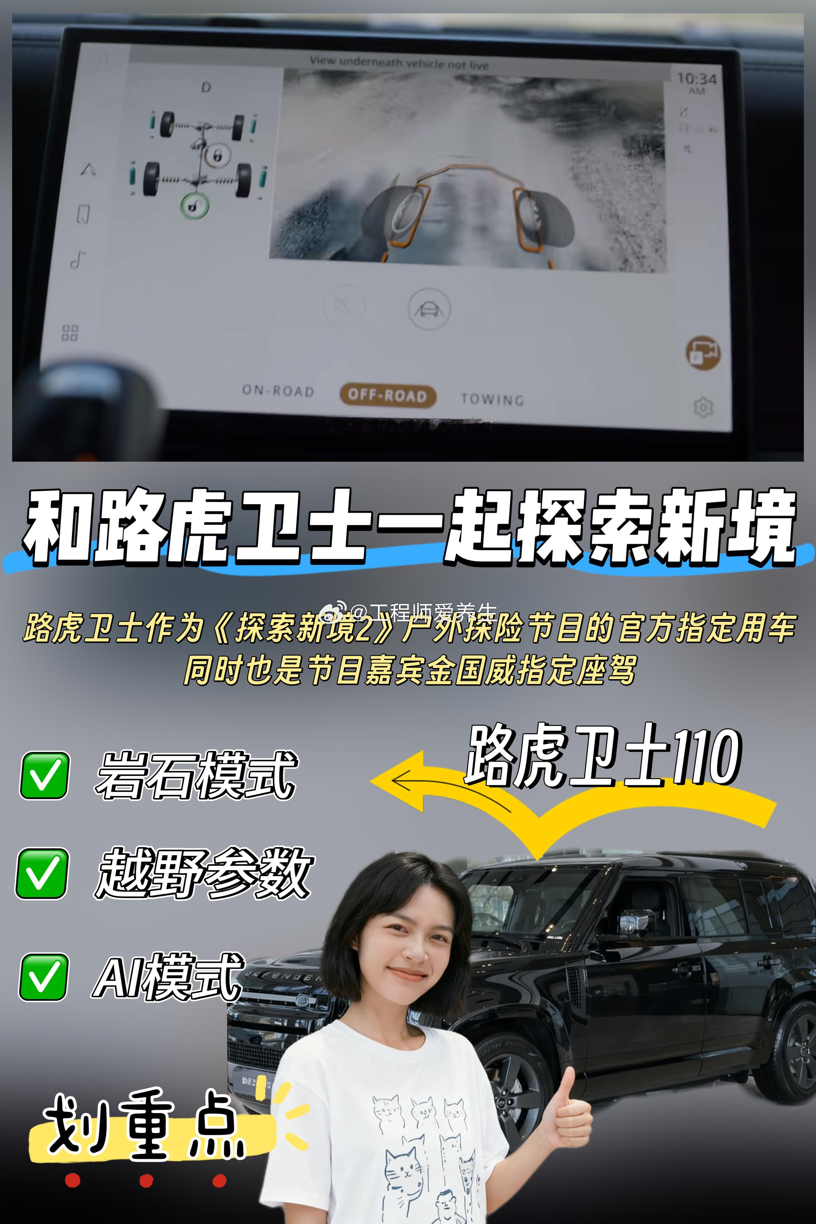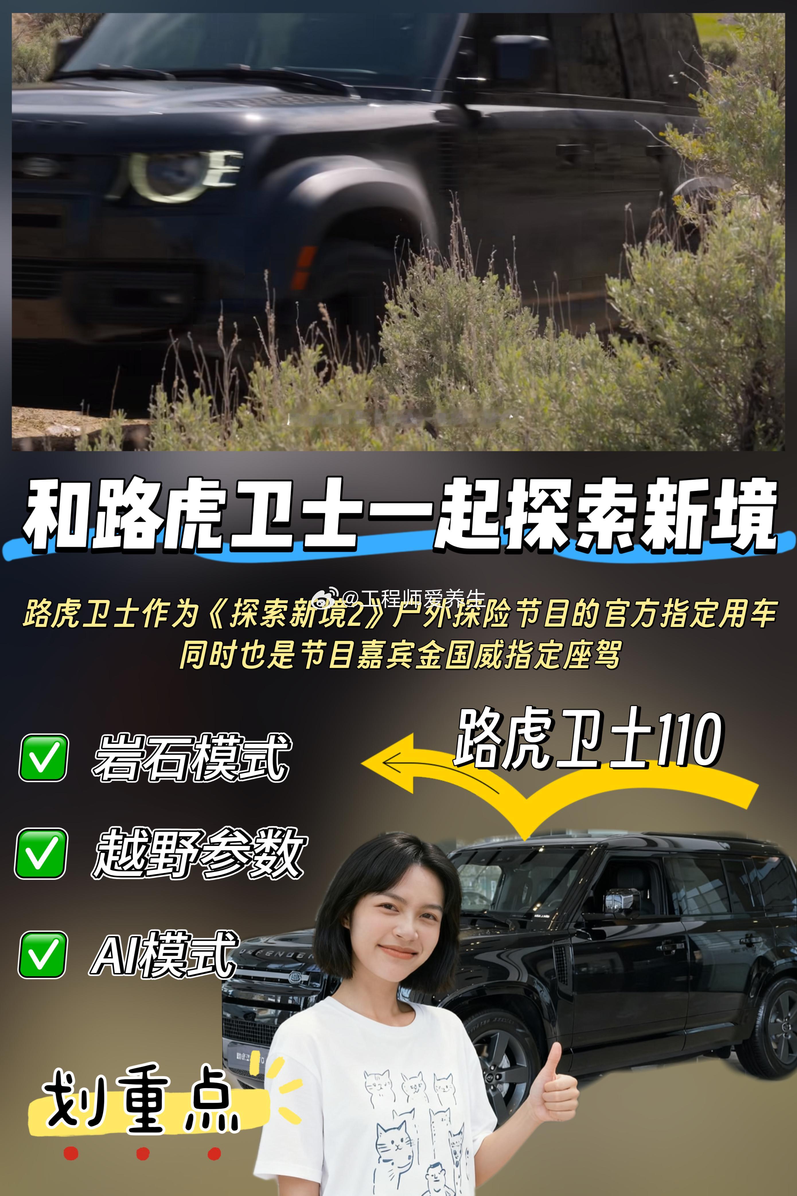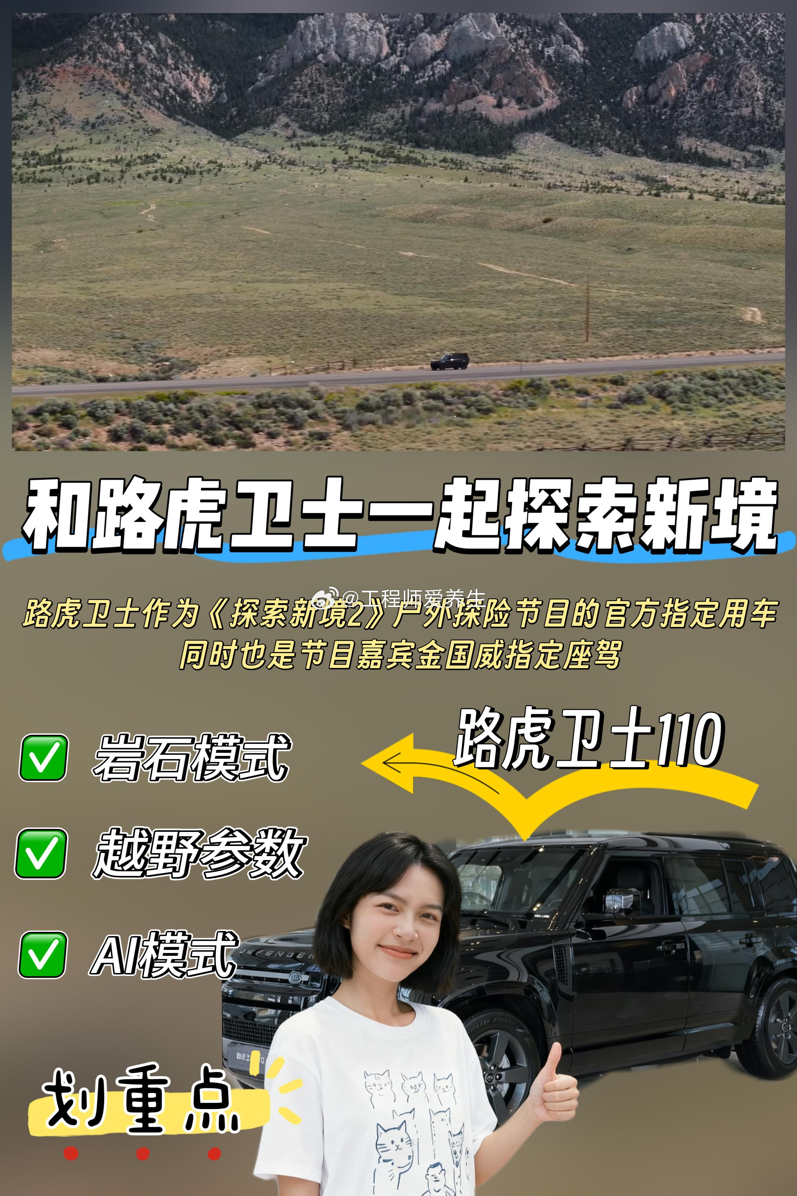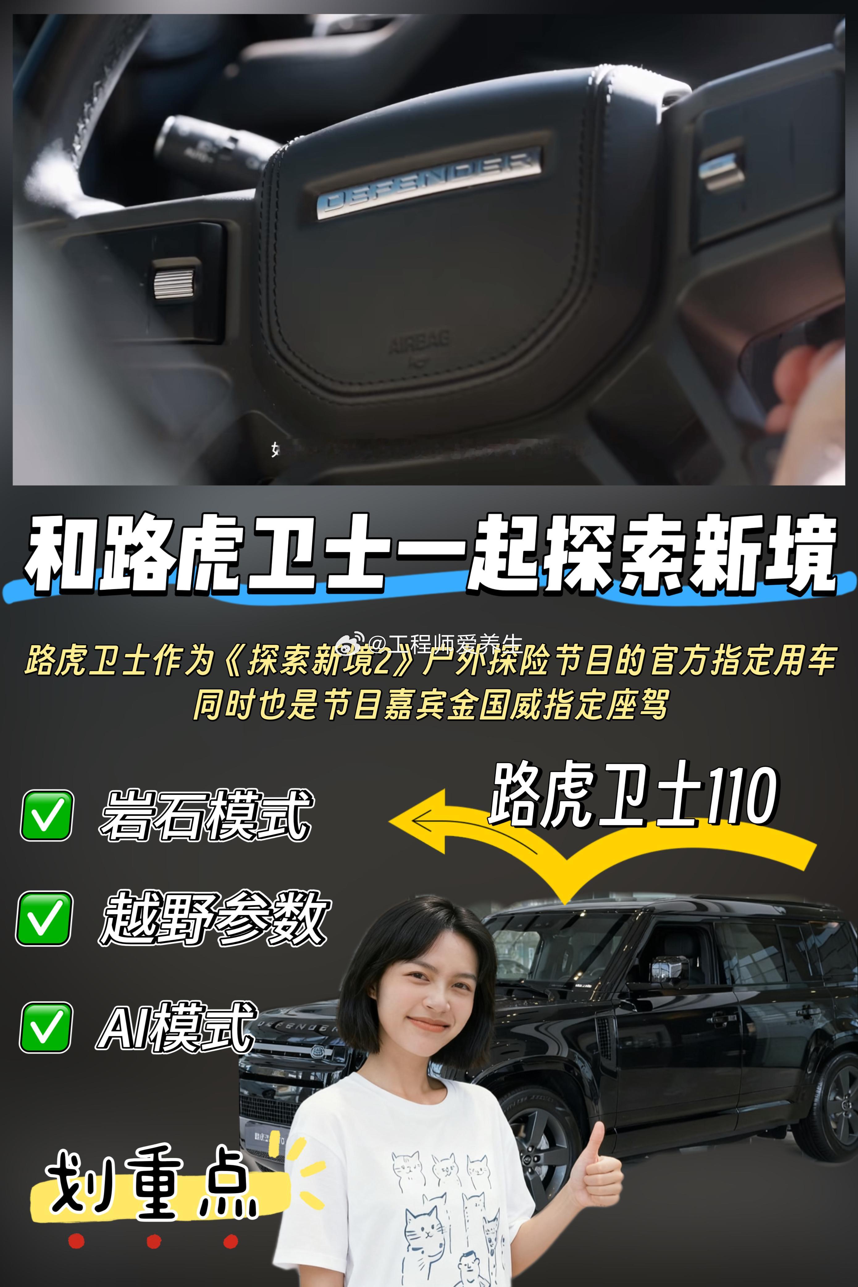探索新境路虎卫士 ❓朋友们你们看《探索新境2》了吗,有没有看到节目嘉宾金国威指定座驾——路虎卫士。🎉🎉路虎卫士是《探索新境2》户外探险节目的官方指定用车!节目中那陡峭岩壁上,路虎卫士的车轮稳稳咬住每一寸崎岖,如同行走在自家后院般从容 🚙💨漫天黄沙中,一曲交响乐在车内流淌——这是《探索新境2》中路虎卫士带给我的魔幻体验🎵。作为节目的忠实观众,我见证了奥斯卡导演金国威驾驶这头钢铁猛兽,征战北美极限地形的每一个瞬间。当屏幕中金国威启动全地形反馈适应系统,一键切换至“岩石模式”,精准的低速控制让车辆在嶙峋岩壁上稳如磐石时,我不禁想起了自己与卫士的初次邂逅✨。🚗🚗🚗🚗🚗👉硬核实力:征服自然的“越野之王” 🏆金国威作为业内公认的“装备专家”,对每个环节都力求极致。在如此严苛的标准下,他选择路虎卫士作为探索北美极限地形的唯一座驾,本身就是对产品实力的顶级背书👍。✅节目中有一个令我惊叹的画面当险峻的岩石攀爬路段出现,金国威启动路虎卫士专有的全地形反馈适应系统,一键切换至“岩石模式”🗻。精准的低速控制让车辆在嶙峋岩壁上稳如磐石,四轮驱动系统则稳稳掌控每一处崎岖💪。✅更令人惊喜的是,卫士的第二代全地形反馈系统新增了AI模式🤖节目中,当金国威的车辆通过交叉轴,他正打算手动锁差速器时,系统已经自动完成了动力分配。这种智能化的越野体验,彻底改变了传统越野车对驾驶员专业能力的高要求🎯。✅卫士的越野参数同样令人印象深刻接近角37.4°、离去角40°、通过角27.9°、离地间隙293mm,以及高达900毫米的涉水深度(选装高位进气口后可达1200mm)🌊。当水深达到轮毂位置时,中控屏会自动弹出实时水深动画,开着它过小河就像逛自家后花园🏞️。🚗🚗🚗🚗🚗👉探索精神,王一博与卫士的默契共鸣 🌟在《探索新境2》中,路虎卫士展现的不仅是征服野外的能力,更是一种探索未知的精神🚀。这种精神与节目嘉宾王一博的探索基因高度契合。✅节目中有一个高光时刻当车队行驶在壮丽的北美原野上,王一博驾驶着卫士110穿越复杂地形,车身稳健而从容,仿佛与自然融为一体🌅。卫士的D7x全铝整合式车身架构带来30000牛·米/度的抗扭刚性,是非承载式车身的3倍,同时也是路虎迄今为止打造的最强抗扭车身,这让它在任何崎岖路面上都能保持从容不迫的姿态💎。王一博在节目中提到,探索不是为了证明什么,而是为了遇见未知的自己。这句话与卫士的设计理念不谋而合🌈。✅卫士的内饰将"粗中有细"玩到了极致镁合金横梁裸露的铆钉充满机械美感,而温莎真皮座椅又时刻提醒你这是台豪华车💺。这种兼具野性与豪华的特质,与探索者们追求自由又不放弃品质的生活态度完美契合🎨。✅可冲洗的耐用橡胶地板、前排中央通道集成冰箱、剧院级Meridian™高级音响系统……这些精心设计的细节,让探索之旅既刺激又舒适🎭。🚗🚗🚗🚗🚗👉梦想座驾:我的路虎卫士110种草清单 🌱看完《探索新境2》,我立刻前往路虎官方平台,深入了解了我心中的梦想座驾——路虎卫士110。它让我心动的原因如此之多💖✅卫士110是最均衡的尺寸90自己开很好,小巧灵活,但是有家人,有拉人的需求,130感觉又太长。而刚刚5米出头的卫士110不论是从耐看程度还是实用性来说,都是平衡的最完美的⚖️。✅强悍的越野性能令人折服37.4°接近角、40°离去角、27.9°通过角、293mm离地间隙,组成强悍的越野三角,轻松征服各种复杂地况。主动式电子后差速锁、全时四驱系统,提供卓越越野性能🚀。✅舒适性完全超乎预期这一代的卫士舒适性做的是真好,对于一台硬派越野来说真的超乎了预期🎪。就算跑高速的噪音也很低,平时城区驾驶也感觉很安静。✅个性化的可能性无限从外观套件到精装附件,个性化配置使路虎卫士110更契合您的生活方式🎯。✅小书包和爬梯是必须要有的,虽然平时也用不到,但这样看着才饱满好看🎒。看到有的车友把后面的备胎改成冲浪板的,玩偶的,都很好看。在我的想象中,开着卫士110,带着家人穿越戈壁滩,车窗外是漫天黄沙,车内却播放着交响乐——这种魔幻般的体验,正是我梦寐以求的生活🌟。🚗🚗🚗🚗🚗去年冬天,我驾驶朋友的卫士110前往内蒙古❄️。在零下20度的环境中,卫士的远程启动让我提前调节好了车内温度🌡️。在茫茫雪原上,我启动全地形反馈适应系统中的草地/沙砾/雪地模式,车辆自动调整了动力输出和牵引力控制,稳稳地在积雪路上行驶⛷️。每当夜幕降临,打开700瓦Meridian™高级音响系统,14个扬声器和双通道低音炮让整个座舱萦绕着清脆嘹亮的高音与层次丰富的浑厚低音,那种体验令人终身难忘🎶。回望节目中金国威驾驶卫士征服北美大陆的英姿,我更加确信,路虎卫士不只是一辆车,更是通往自由的钥匙🗝️。它让我们相信,这个世界上没有无法抵达的远方,只有等待被探索的新境🌍。
