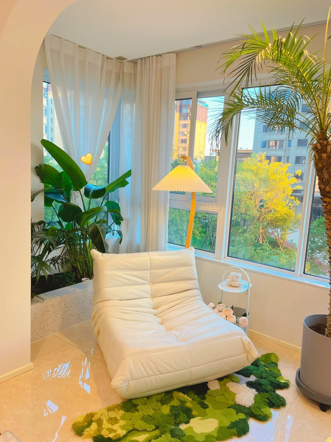 旁边放上小沙发,铺上一块很有质感的苔藓地毯