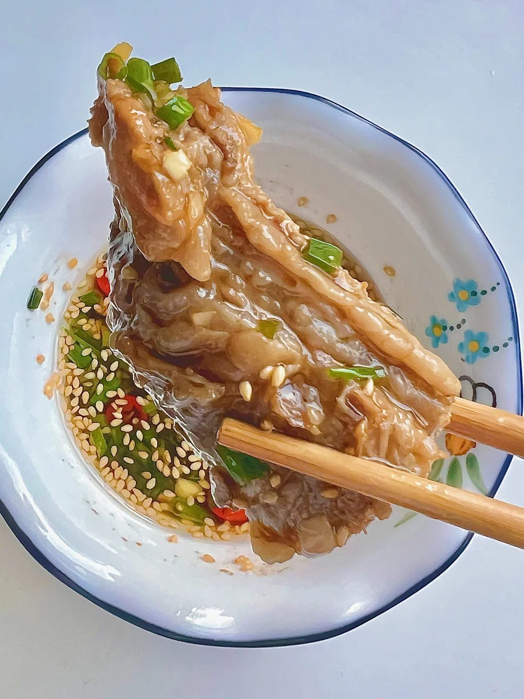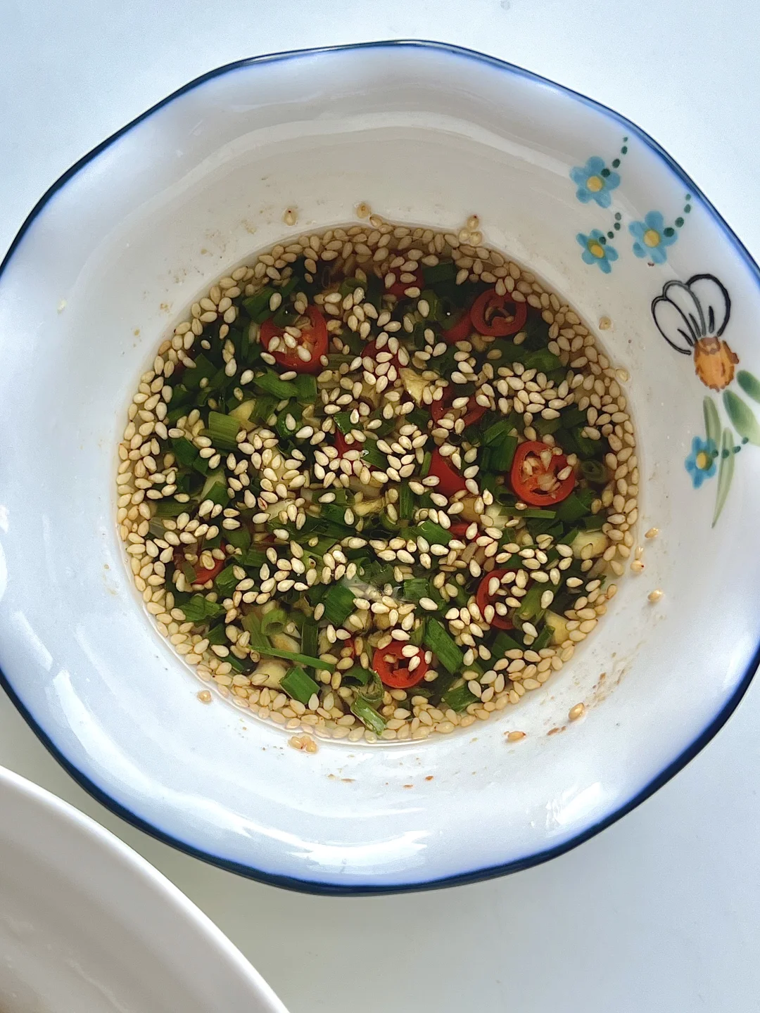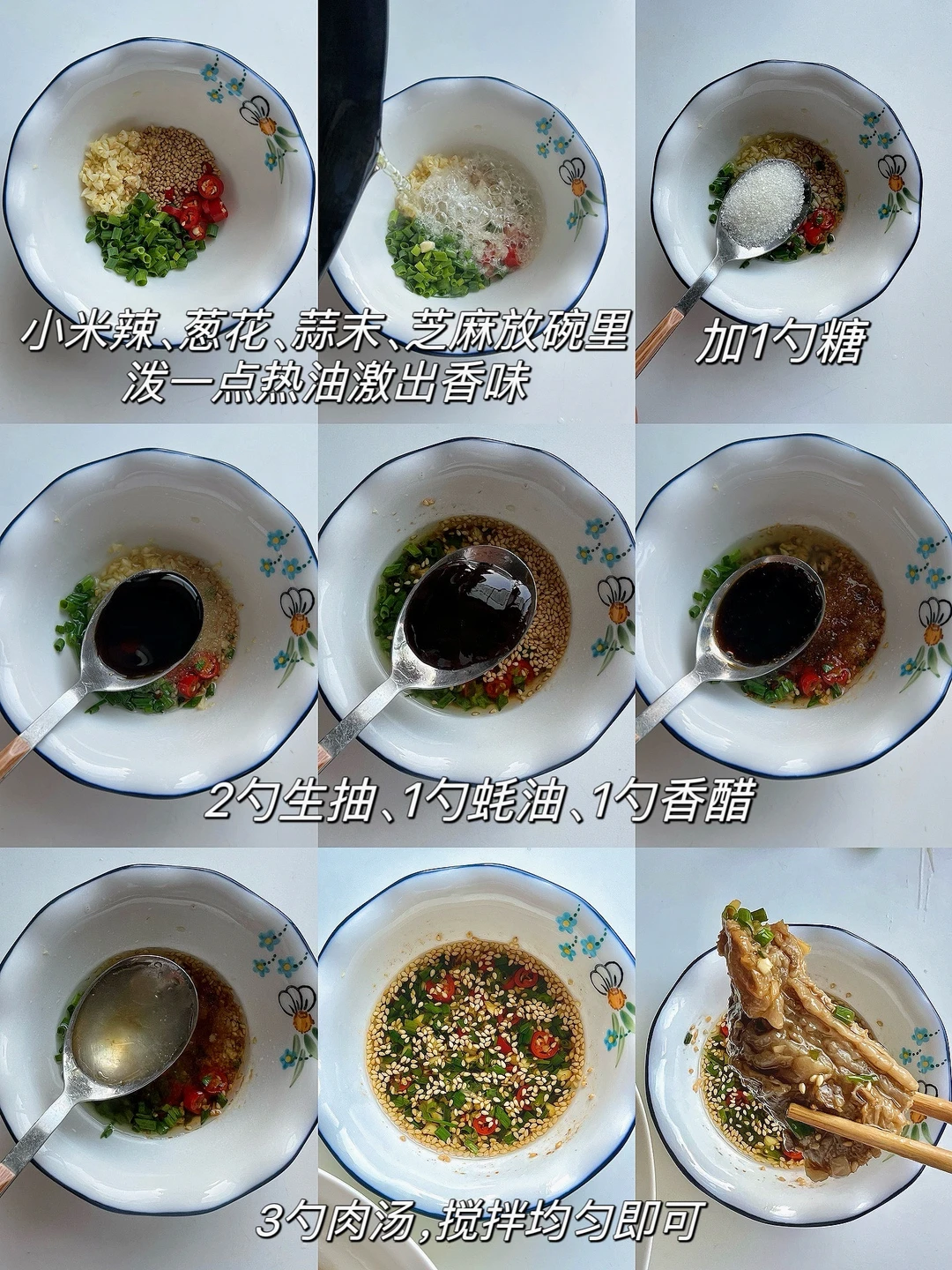 小米辣、葱花、蒜末、芝麻放碗里,烧一点热油激出香味,加入两勺生抽酱油、1勺蚝油、1勺香醋、3勺肉汤搅拌均匀即可