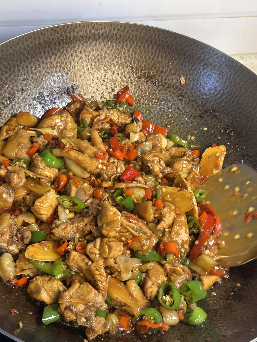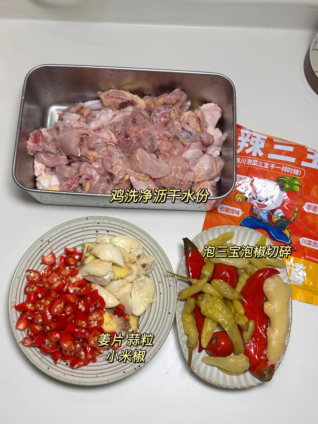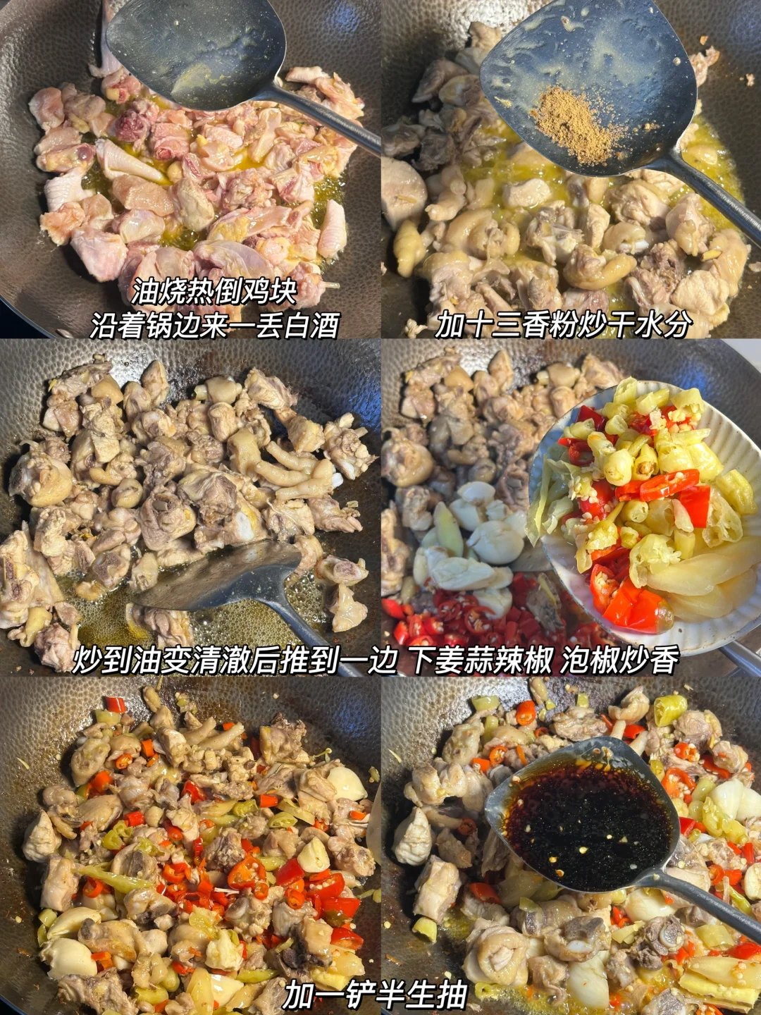 泡椒小炒鸡 香辣开胃 🤤你能炫几碗🥣 舒服的一餐[大笑R]家里的饭菜最好吃 ✨食材:半只三黄鸡 姜 蒜 小米椒 青椒 泡三宝泡椒 1️⃣:把所有食材洗净切好备用。锅里倒油烧热倒入沥干水份的鸡块翻炒几下 沿着锅边来一丢白酒 一小勺十三香粉翻炒到油变清澈(炒干水分才不腥)把炒好的鸡推到一边 下姜蒜 小米椒 泡椒炒几下。 2️⃣:调味加一铲半生抽 小半铲酱油 蚝油炒两分钟炒出酱香味。加入一小碗水加一丢丢白糖小火煮五分钟 起锅前加鸡精 青椒转大火翻炒到青椒断生。 好好吃饭呀🖖🏻