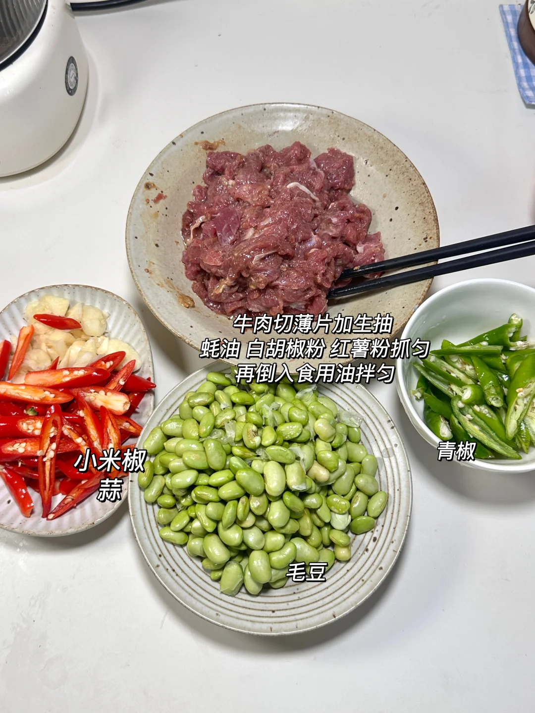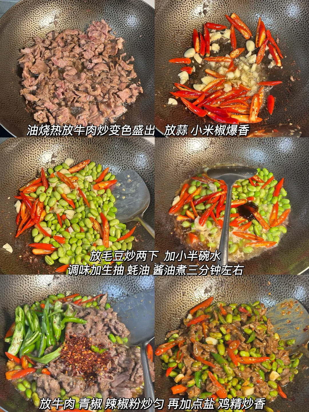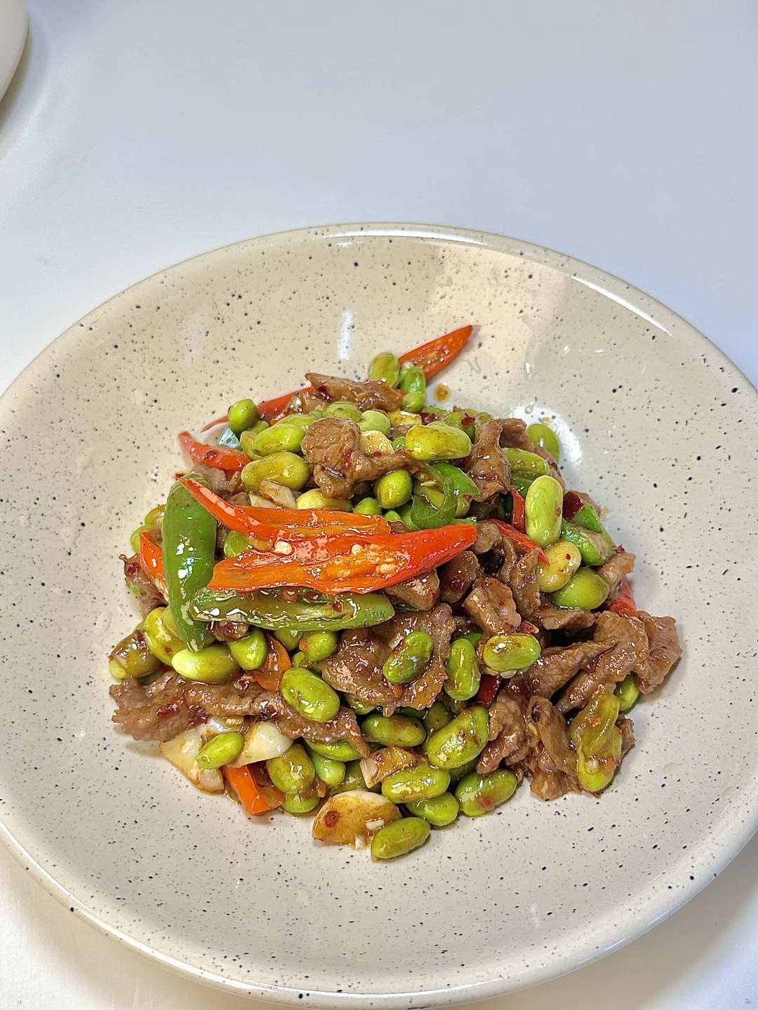 香辣毛豆炒牛肉 从小吃不腻的家常菜 简单好吃😋 ✨食材:毛豆 牛肉 蒜 小米椒 青椒 1️⃣:牛肉逆着纹理切薄片加生抽 蚝油,白胡椒粉 红薯粉抓匀,再倒入食用油拌匀腌制10分钟。锅里倒油烧热 放牛肉炒散炒变色盛出,放蒜 小米椒爆香,倒入毛豆炒几下,加大概小半碗清水 调味加生抽 蚝油 酱油煮3.4分钟 2️⃣:倒入牛肉 青椒 辣椒粉炒几下,加盐 鸡精炒匀炒出锅气。 好好吃饭呀🖖🏻