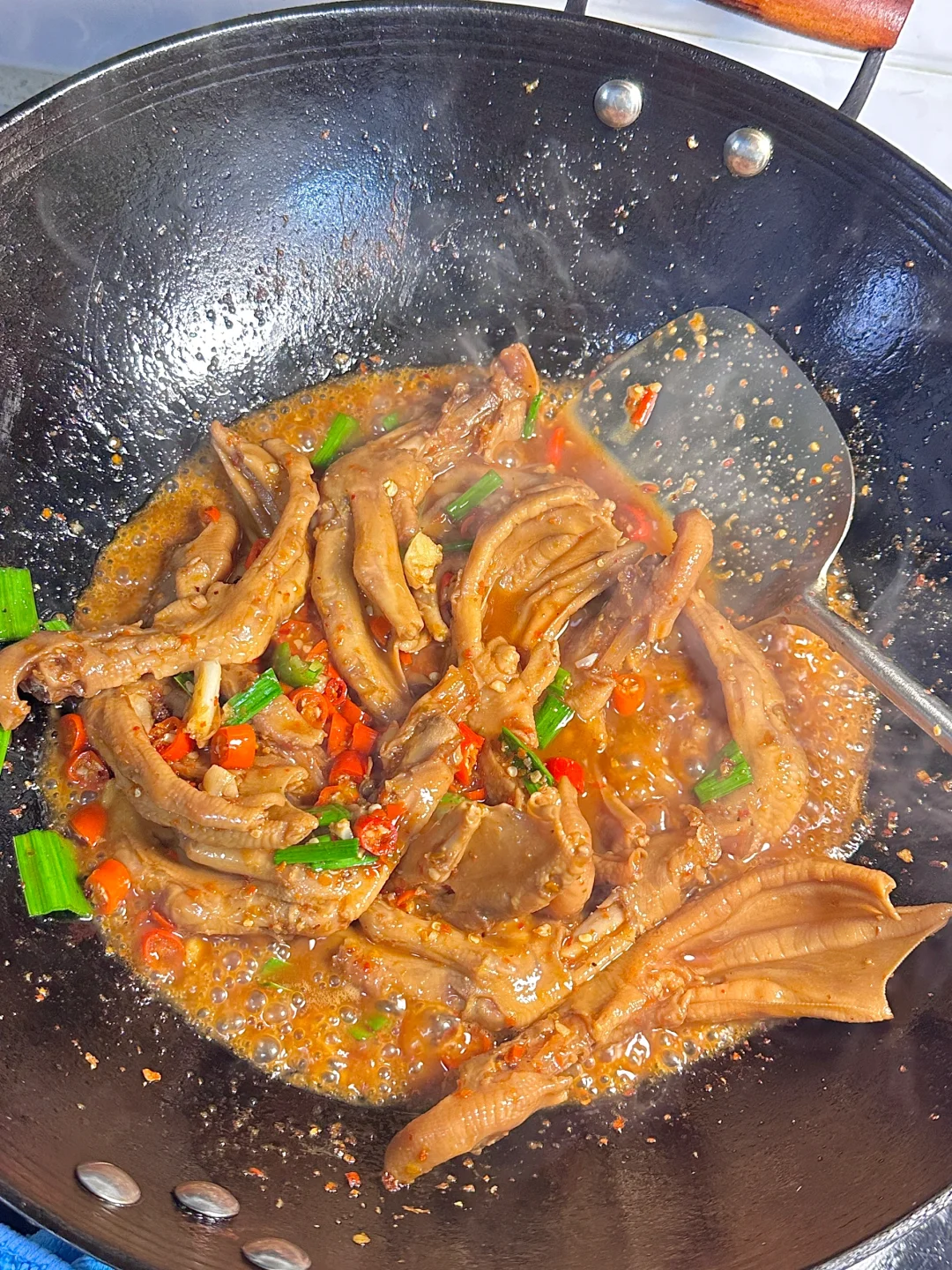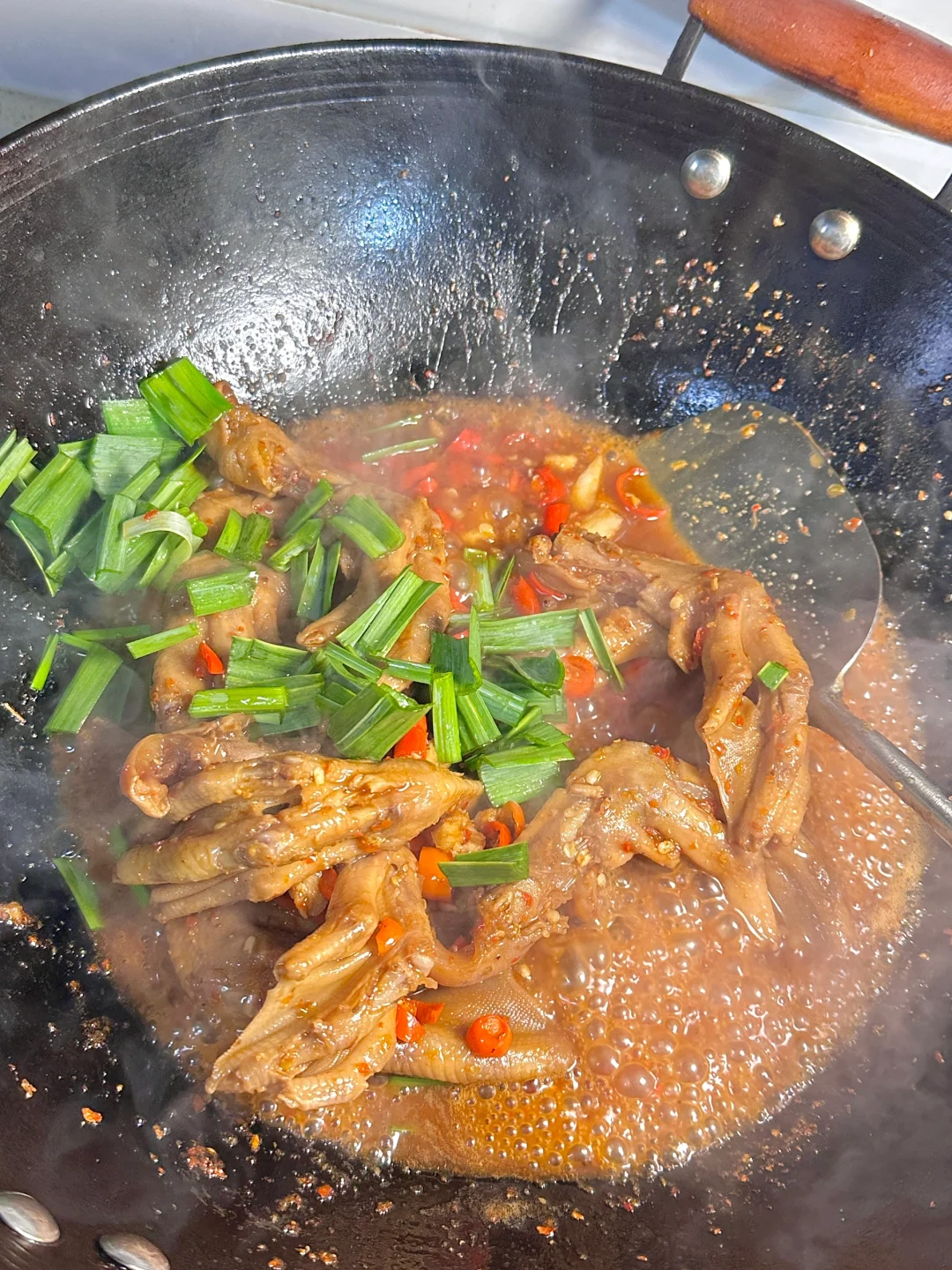 2️⃣:锅里倒油烧热 放蒜子 小米椒 辣椒粉小火炒香出红油(大火怕辣椒粉糊了)倒入鸭爪 一小勺米酒 蚝油翻炒一分钟。倒刚刚准备好的汤汁 一小勺鸡精 一丢盐焖煮几分钟。起锅前撒蒜苗叶增香。