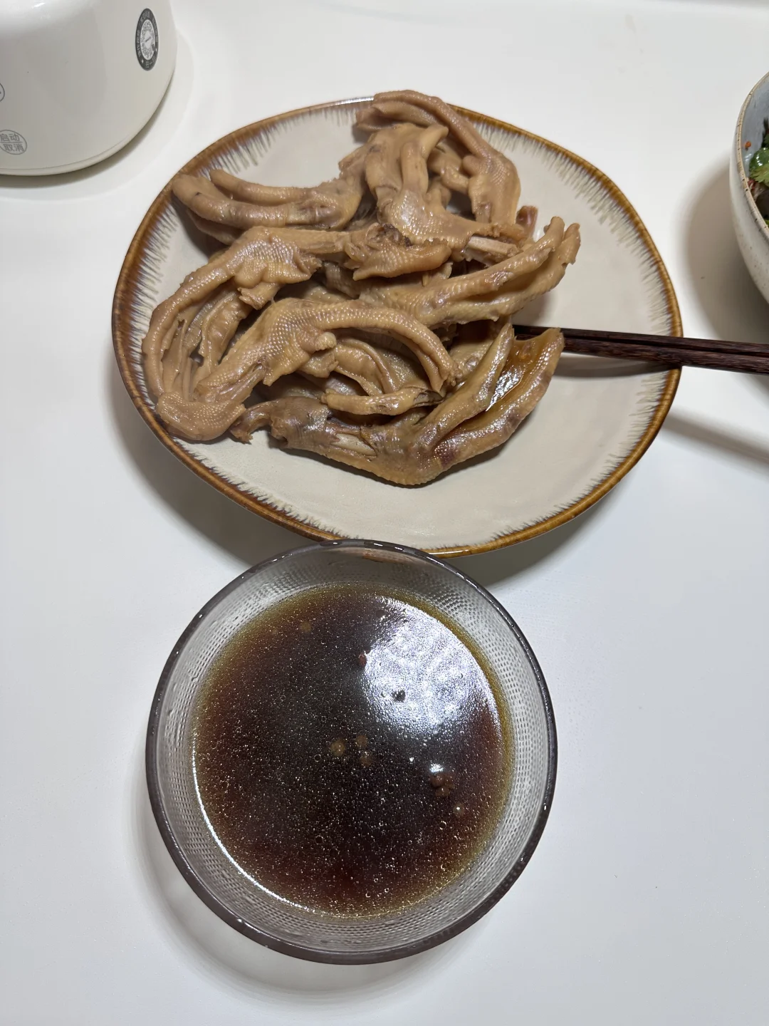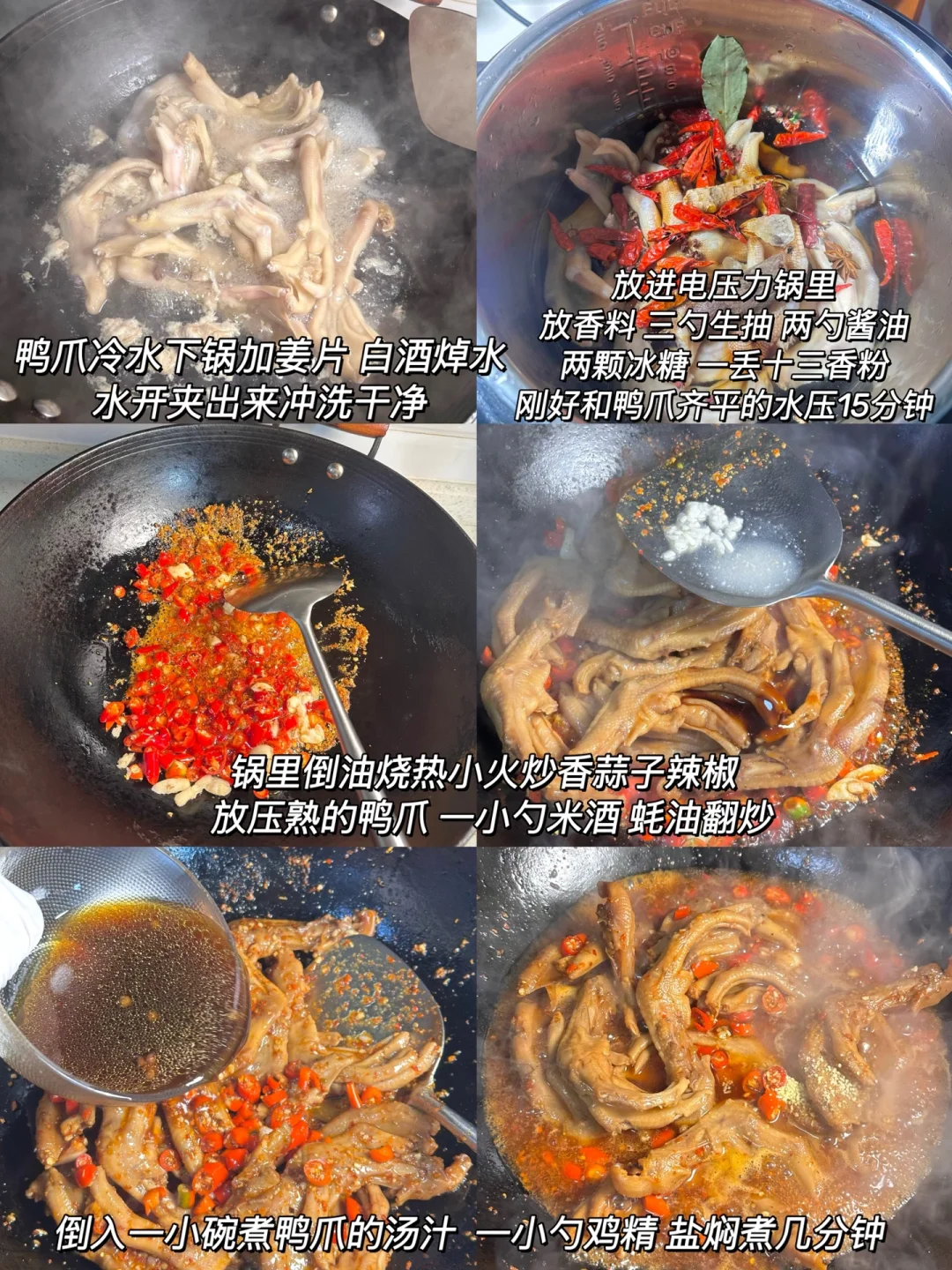 1️⃣:鸭爪清洗干净冷水下锅加姜片 白酒(或料酒)焯水,水开后夹出来洗干净。放入电压锅里加香料 三勺生抽 两勺酱油,一丢十三香粉。再加刚好和鸭爪齐平的水压15分钟。压熟后把鸭爪夹出来,盛一碗汤汁备用。
