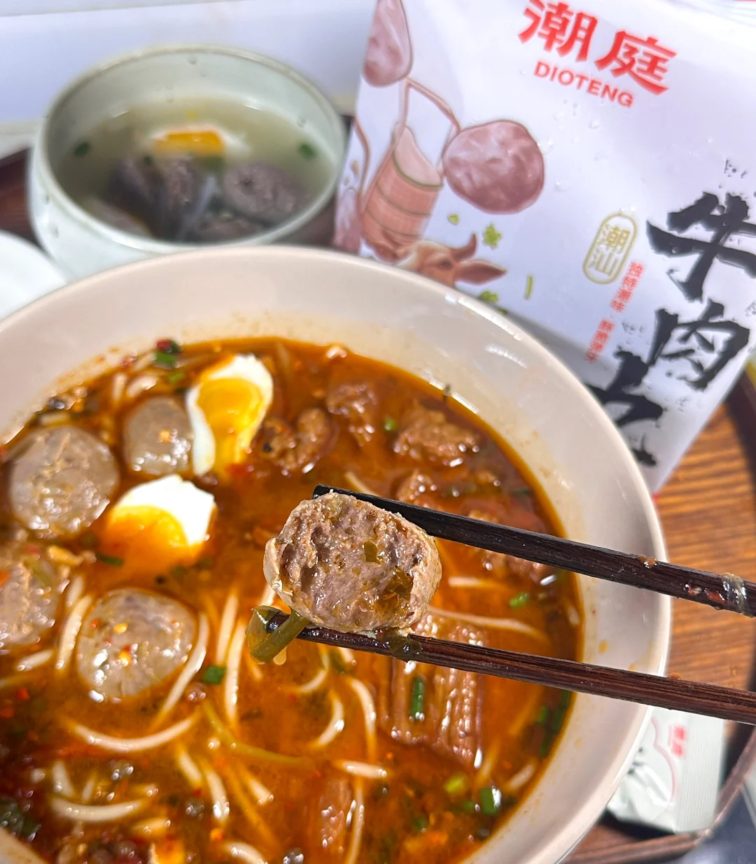 3️⃣:锅里接水煮潮庭牛肉丸 再放煮熟的米粉烫一下。