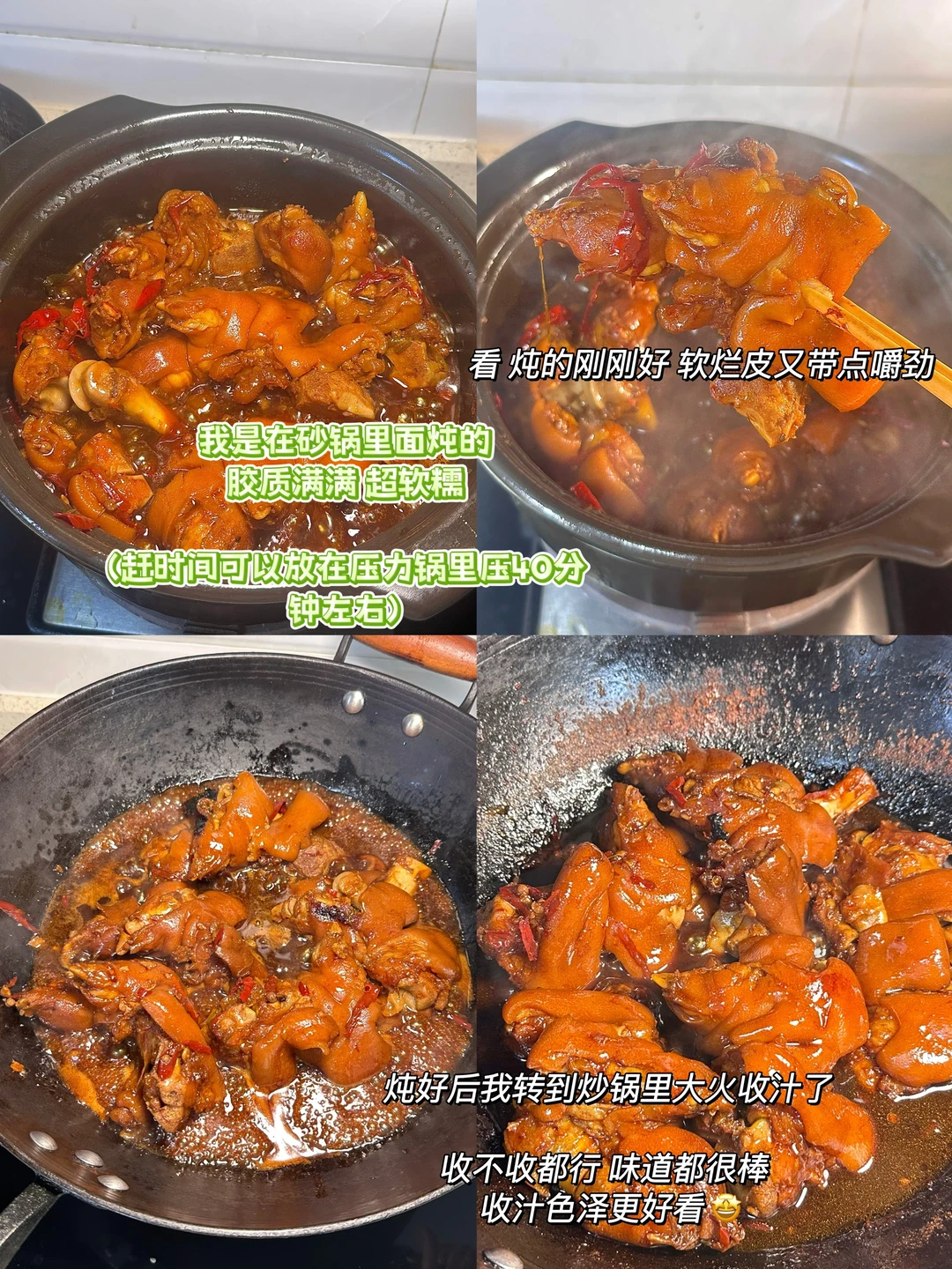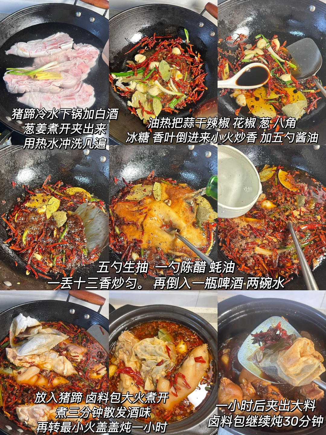1️⃣:猪蹄先用面粉抓细几遍去掉腥味,再冷水下锅加姜葱 白酒焯水 水开后再煮两分钟 把猪蹄夹出来用热水清洗干净。锅里倒油烧热 把蒜 干辣椒 花椒 葱 白角 冰糖 香叶倒进去小火炒香 ,加五勺酱油 生抽 一勺陈醋 蚝油 一丢十三香炒匀