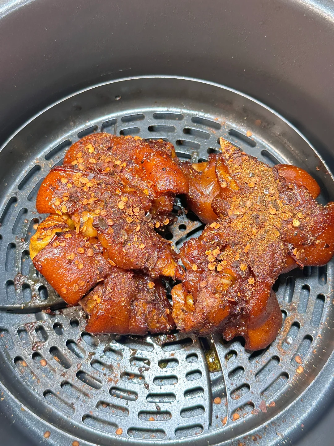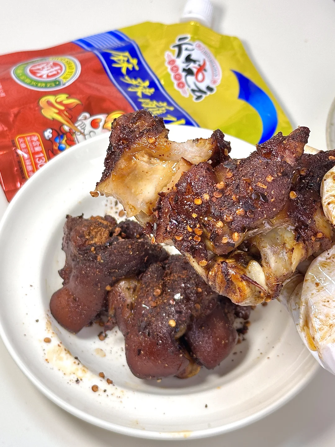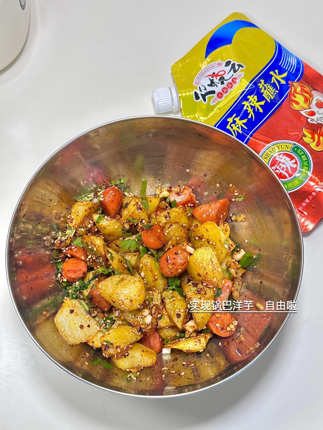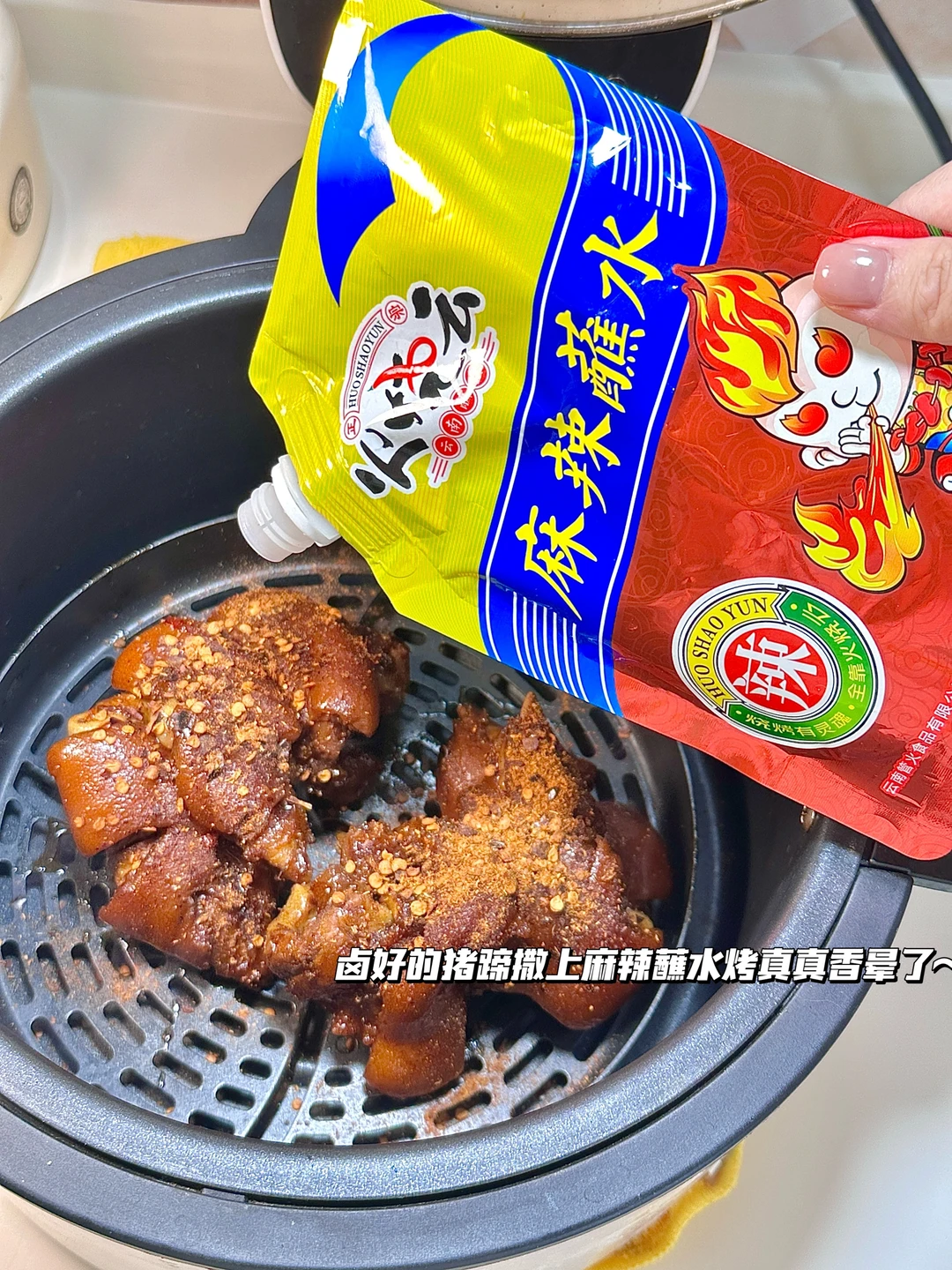 最近种草了朋友推荐的麻辣蘸水 ,卤好的猪蹄放空气炸锅里180度烤了8分钟 再撒上火烧云麻辣蘸水烤三分钟 云南辣椒混合花椒 胡椒粉等香料烤猪蹄太够味啦 。拌了个锅巴土豆 好方便,不用各种料分开撒 麻辣蘸水一倒,那个味儿就上来了[赞R][赞R]下次安排一顿烤肉 香~