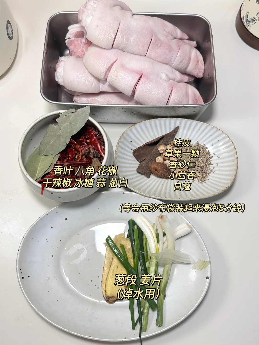 ✨食材:猪蹄 葱 姜 香叶 八角 花椒 干辣椒 冰糖 蒜 啤酒 (桂皮 草果 香砂仁 小茴香 白蔻 这些香料用纱布袋装起来)