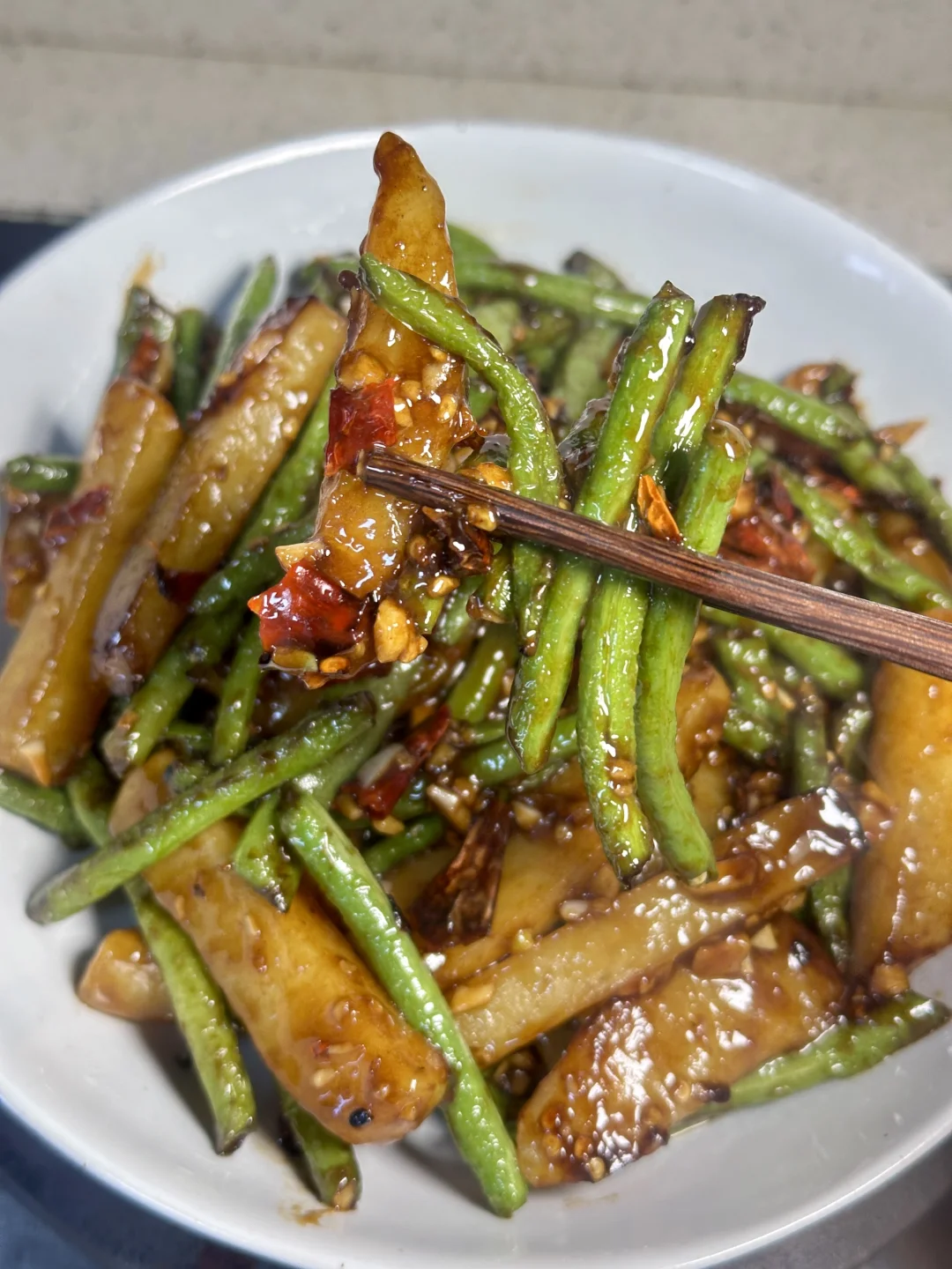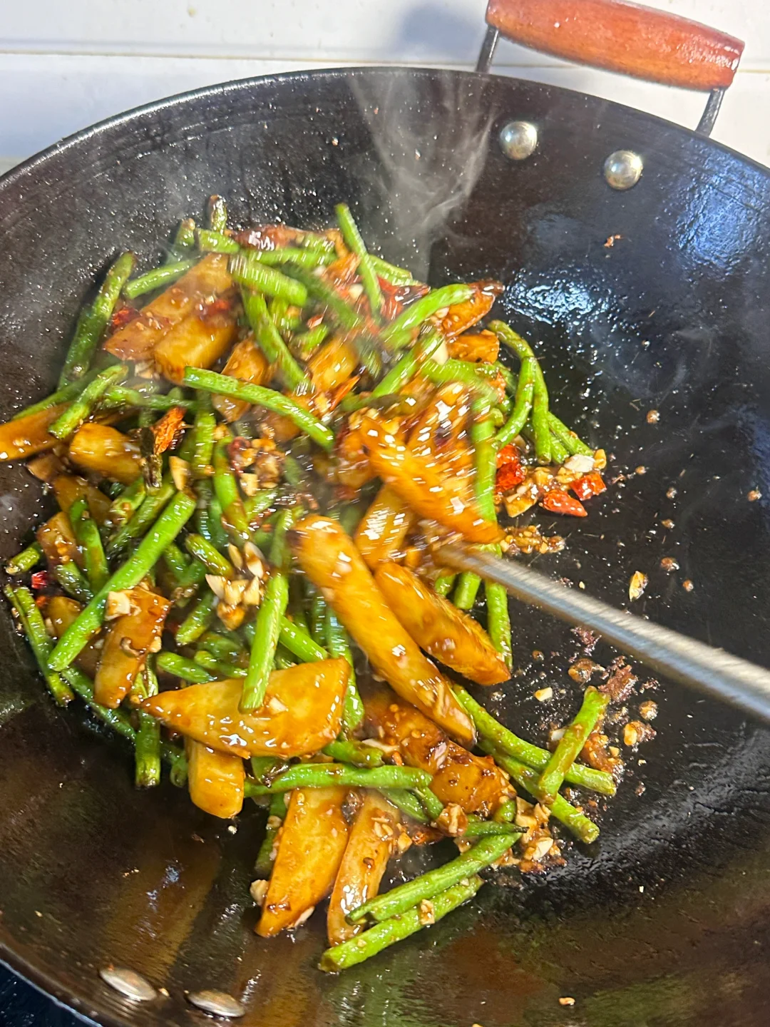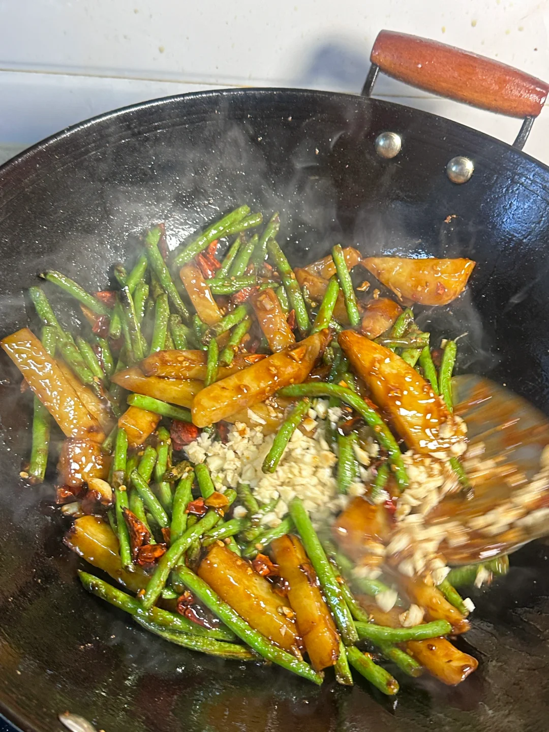 2️⃣:就着锅里底油炒香姜蒜干辣椒,把豆角土豆放进去大火翻炒几下,倒入酱汁(倒之前再次搅匀)转中火翻炒入味。起锅前放一大把蒜末炒两下 超香的!!