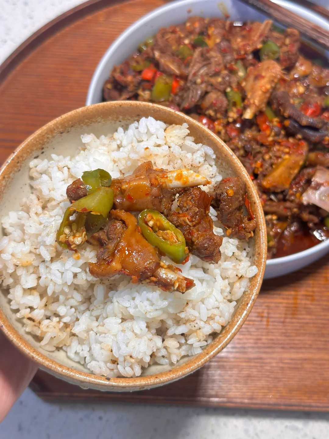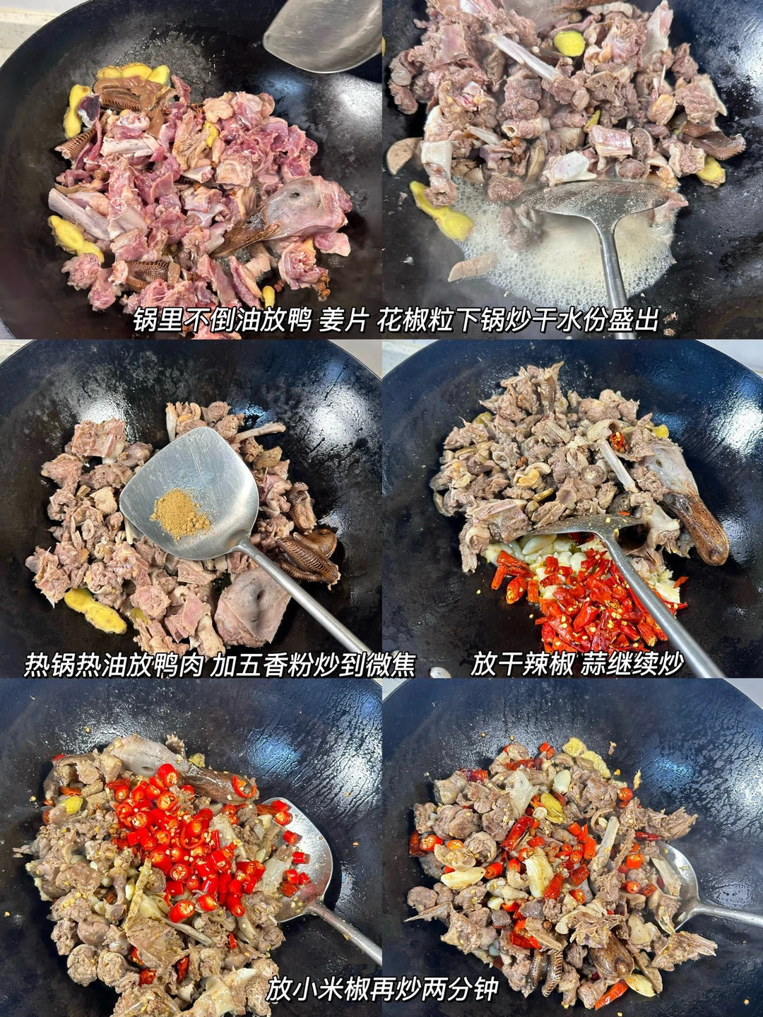 2️⃣:热锅热油放鸭肉,加五香粉(或十三香)大火炒到微焦。推到一边 爆香蒜 干辣椒 ,继续放小米椒再炒两分钟。调味放 酱油/ 生抽 / 蚝油 大火爆炒出酱香味。