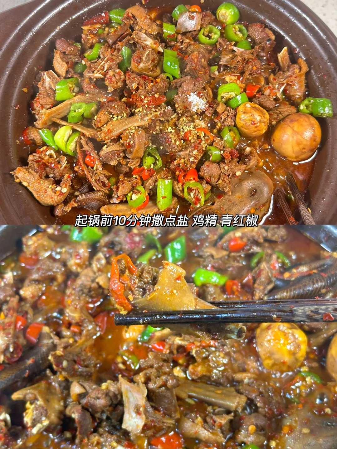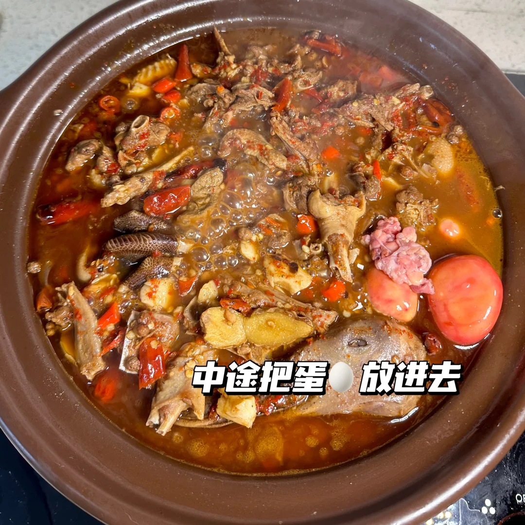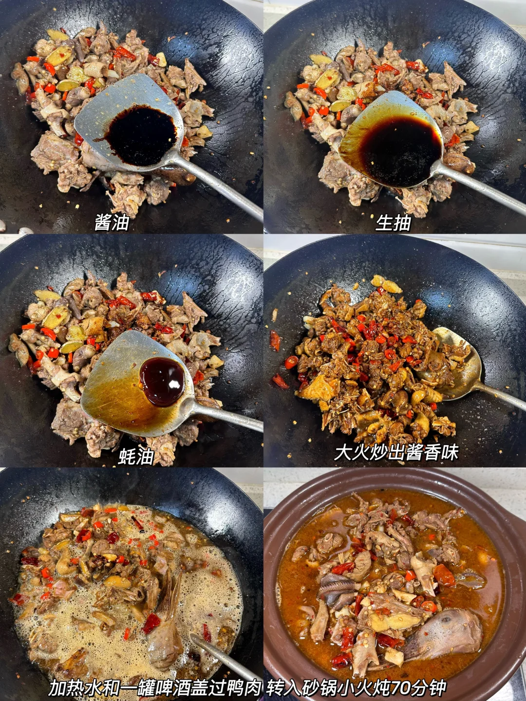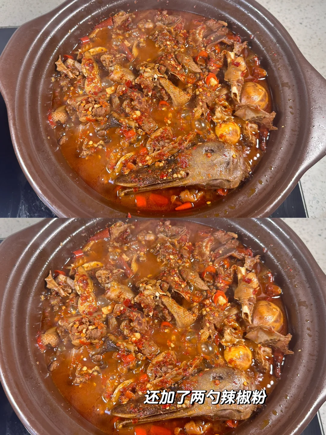 3️⃣:倒热水和一小罐啤酒盖过鸭肉 放一小块冰糖 大火煮开后转入砂锅小火炖70分钟(根据鸭龄来,这个鸭龄500天)中途把鸭里面的蛋放进去,我还放了两大勺辣椒粉,起锅前10分钟放青红椒 盐 鸡精调味。不方便用砂锅的可以用电压力锅或者高压锅[害羞R]时间至少减半哦。