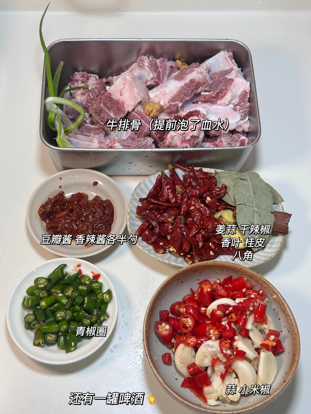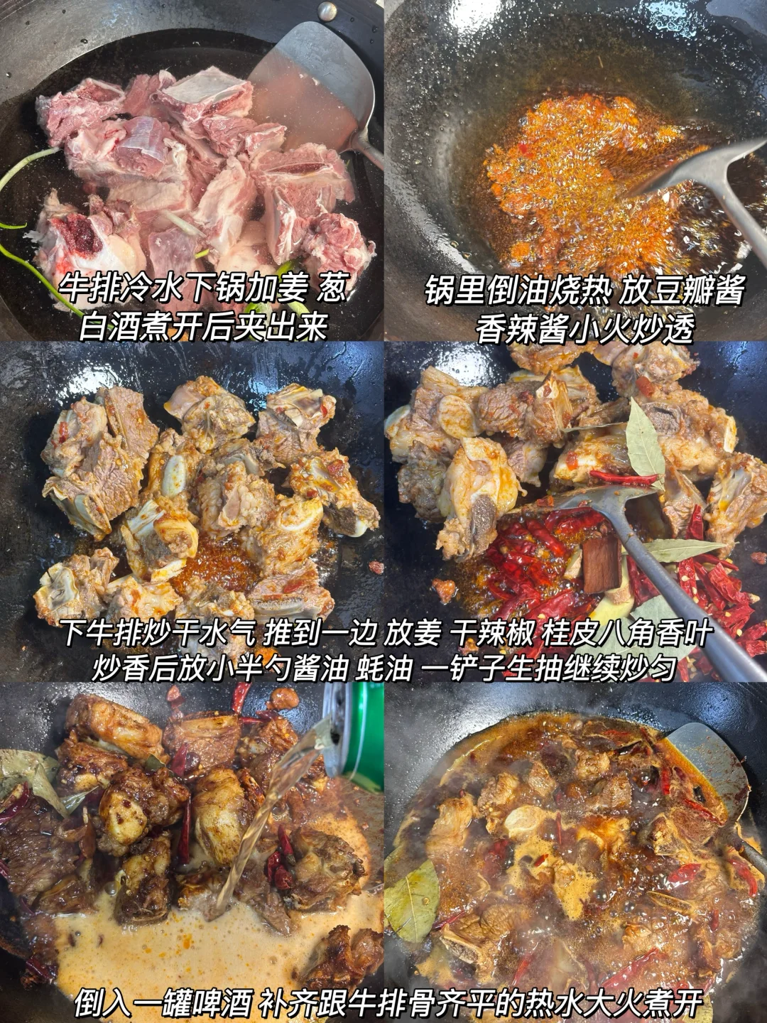 1️⃣:牛排骨冷水下锅加葱姜、白酒焯水,水开后夹出来。炒锅倒油 油热放豆瓣酱、香辣酱,小火慢慢炒透,放牛排炒干水汽,把牛排推到一边,放姜片干辣椒、香叶、桂皮、八角炒香,调味加半勺酱油点、蚝油 一铲子生抽炒出酱香味,加入一罐啤酒。再补足量的热水 大火煮开后转入电压力锅压30分钟。(高压锅15-20分钟)