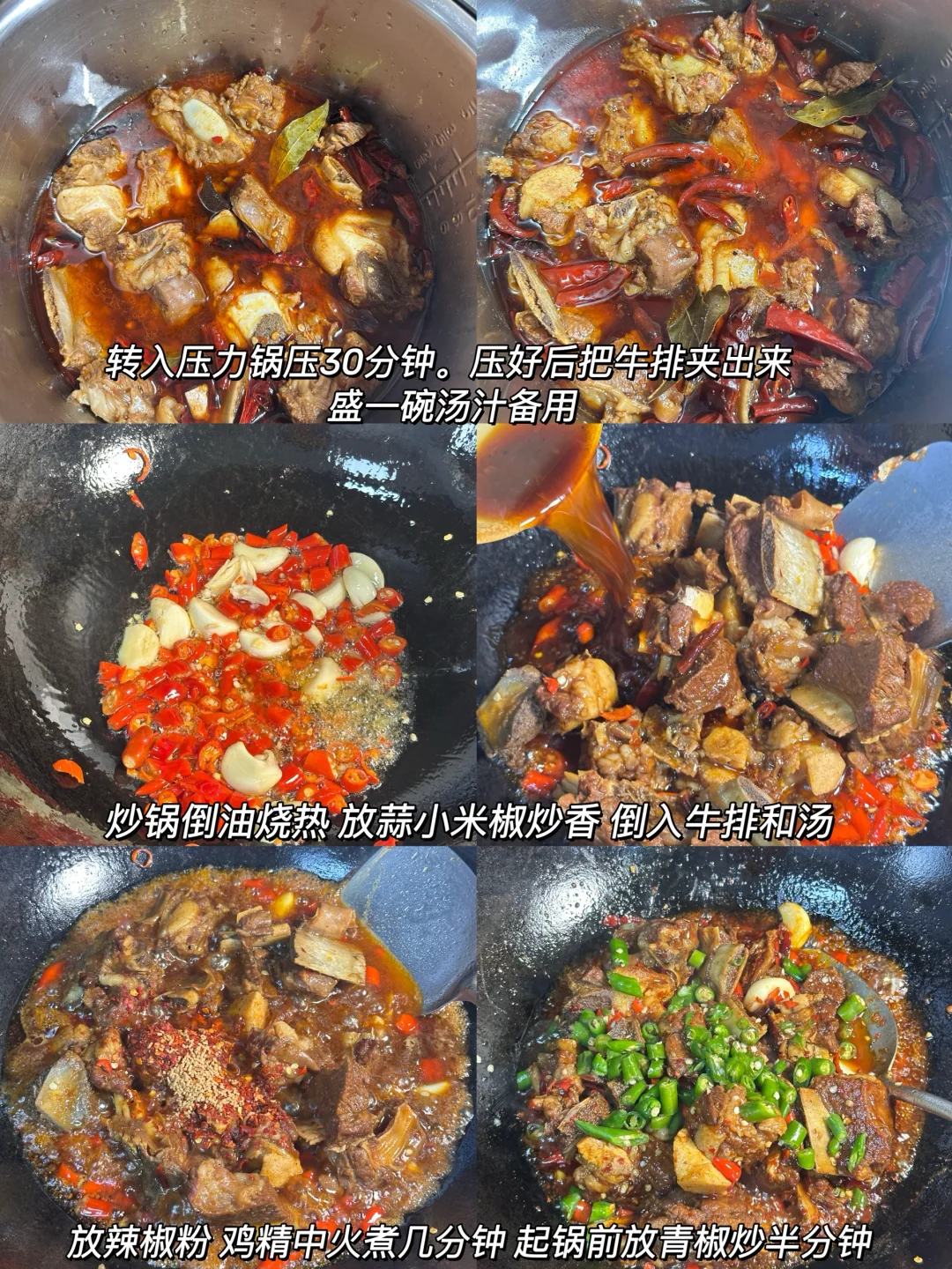 2️⃣:把压好的牛排夹出来、再盛出一碗汤汁备用,炒锅重新倒油。放蒜 小米椒炒出辣味。倒入牛排和汤汁,加鸡精 辣椒粉中火咕嘟几分钟,起锅前加青椒圈翻炒半分钟。