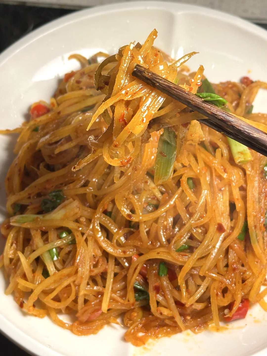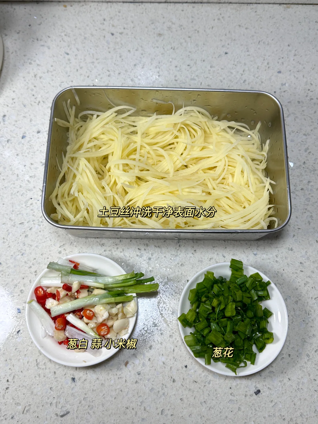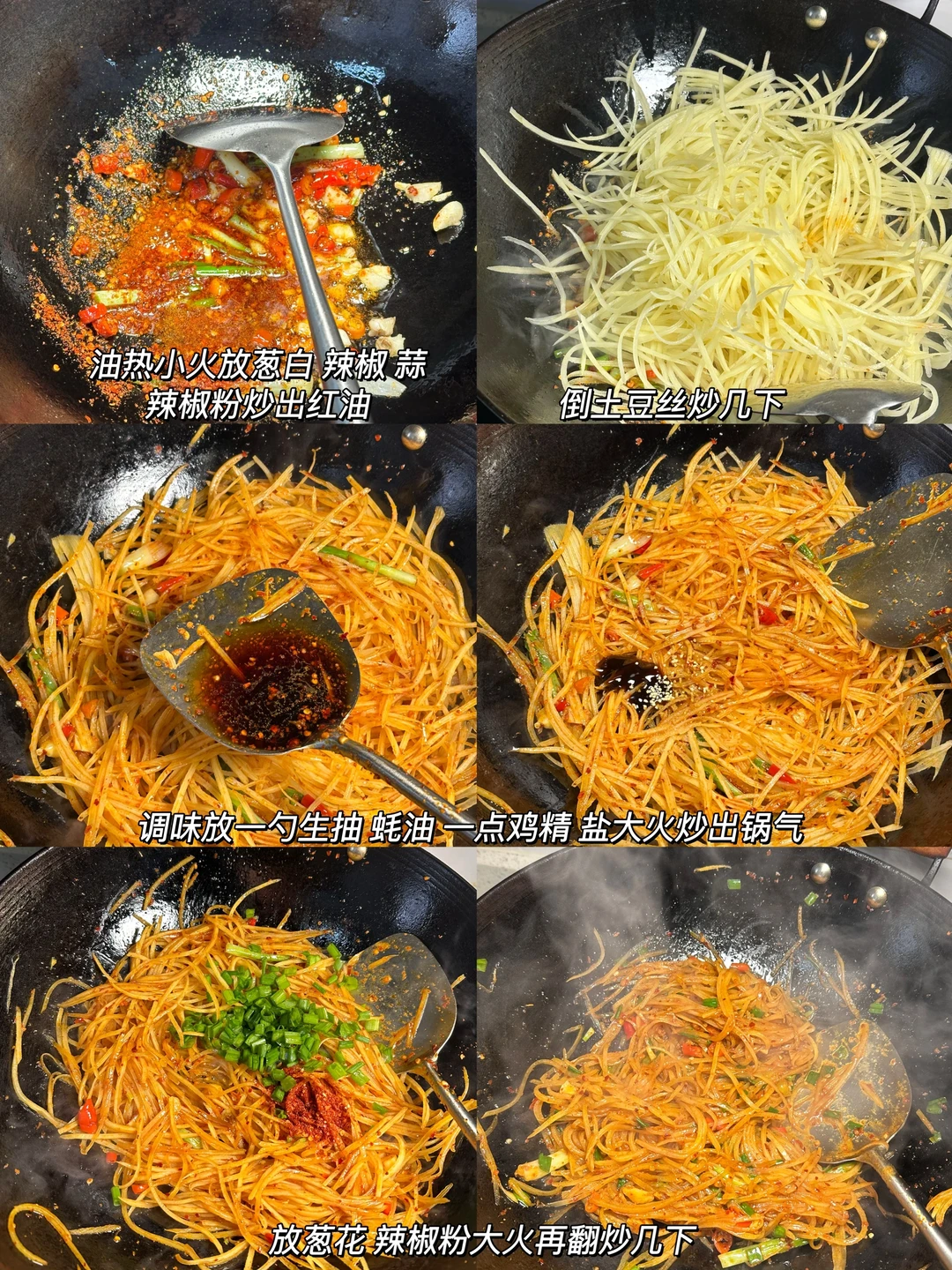 爆辣口的土豆丝拌米饭真的太太太好吃了 🥔真的怎么吃都不腻[哇R]的三餐四季 ✨食材:土豆 蒜 葱 小米椒 辣椒粉 1️⃣:土豆刨丝多冲洗几遍,把表面淀粉冲洗干净控干水分备用。 锅里倒油放蒜 小米椒 辣椒粉 葱白小火炒出红油,放土豆丝大火翻炒匀,调味放一勺生抽 半勺蚝油,一点鸡精 盐炒出锅气。 2️⃣:起锅前放葱 辣椒粉大火炒几下。 土豆丝清洗到水变清澈就不会粘锅哦 炒的时候大火。 好好吃饭呀🖖🏻