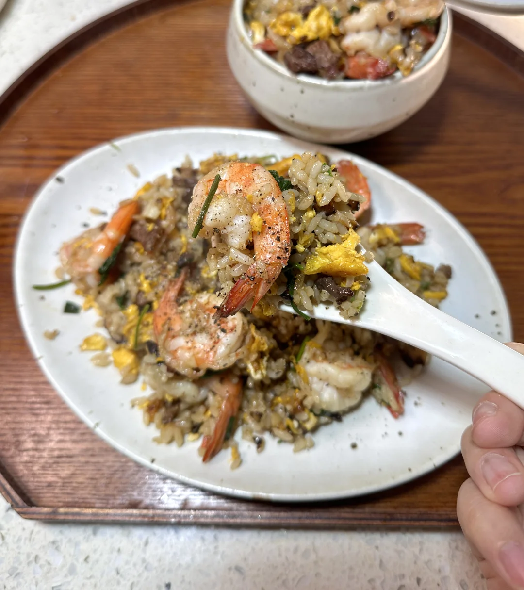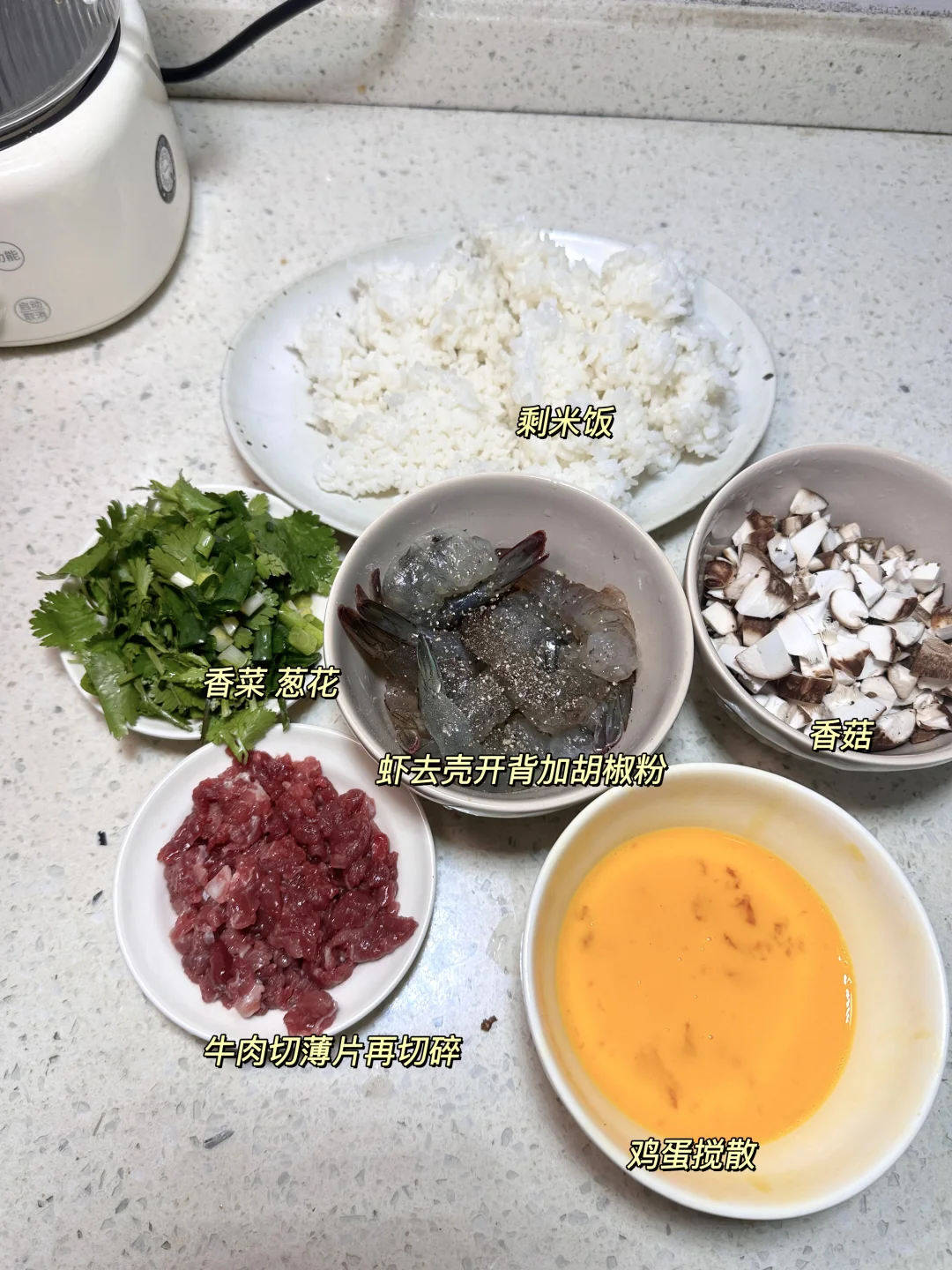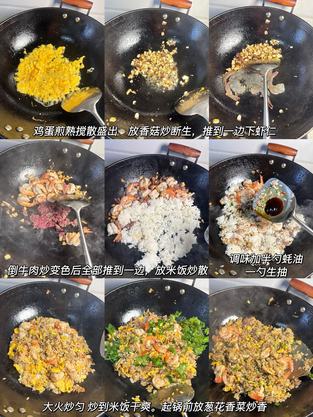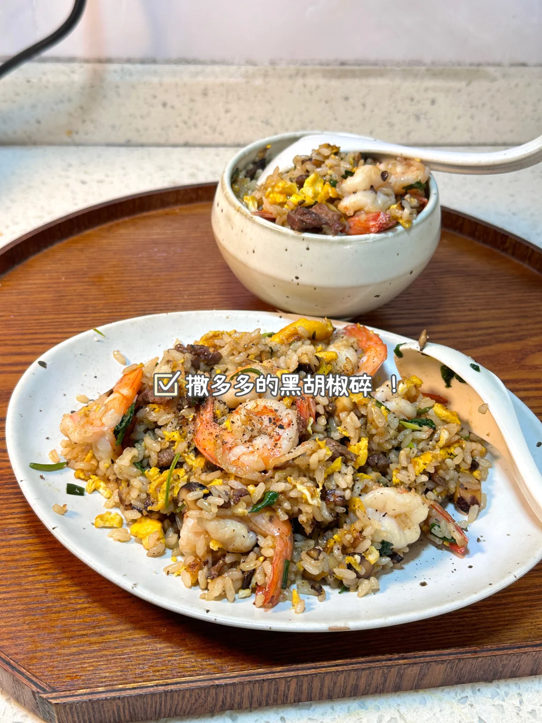 减脂期也合适[赞R] 小朋友难得主动要求添饭[赞R]超级香 一个人也要好好吃饭 ✨食材:剩米饭 牛肉 香菇碎 鸡蛋 虾仁 葱花 香菜 1️⃣:虾剥壳开背加黑胡椒碎,所有食材全部切好备用。 锅里倒油烧热在下鸡蛋煎(油热煎的鸡蛋蓬松真的更香)煎到定型后铲碎盛出,放香菇炒断生推到一边后下虾仁炒几下,扒拉到一边放牛肉炒变色后下米饭炒散。 2️⃣:调味加半勺蚝油 一勺生抽 ,大火把米饭炒干。起锅前撒香菜 葱花(根据个人口味加盐.鸡精)吃的时候研磨大量的黑胡椒碎~太香了[哇R]