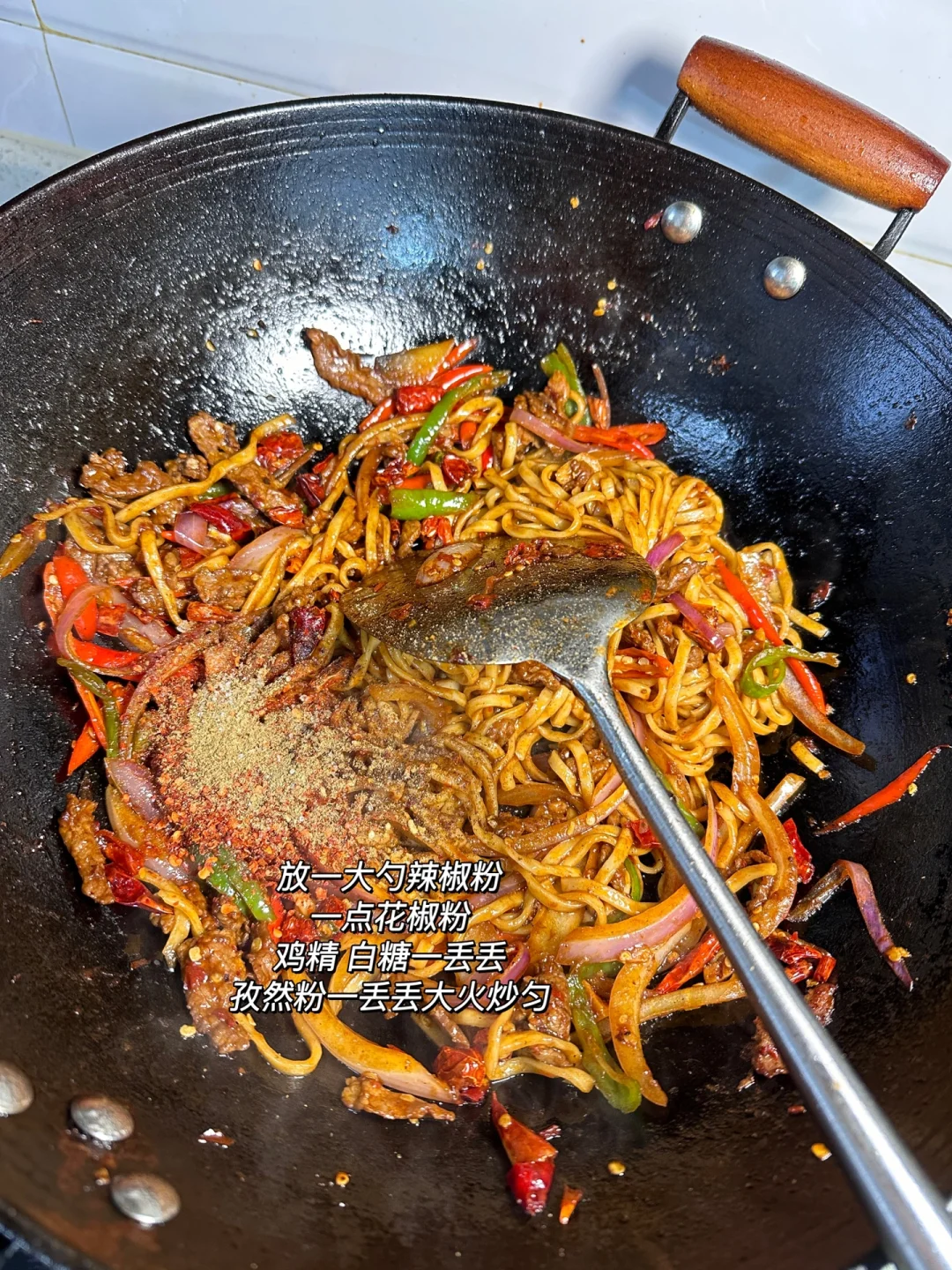 2️⃣:放牛肉 面条大火翻炒几下,加一勺生抽,蚝油 小半勺酱油大火炒出锅气,再加一大勺辣椒粉 一点孜然粉 鸡精,白糖 ,花椒粉大火炒匀就可以啦。