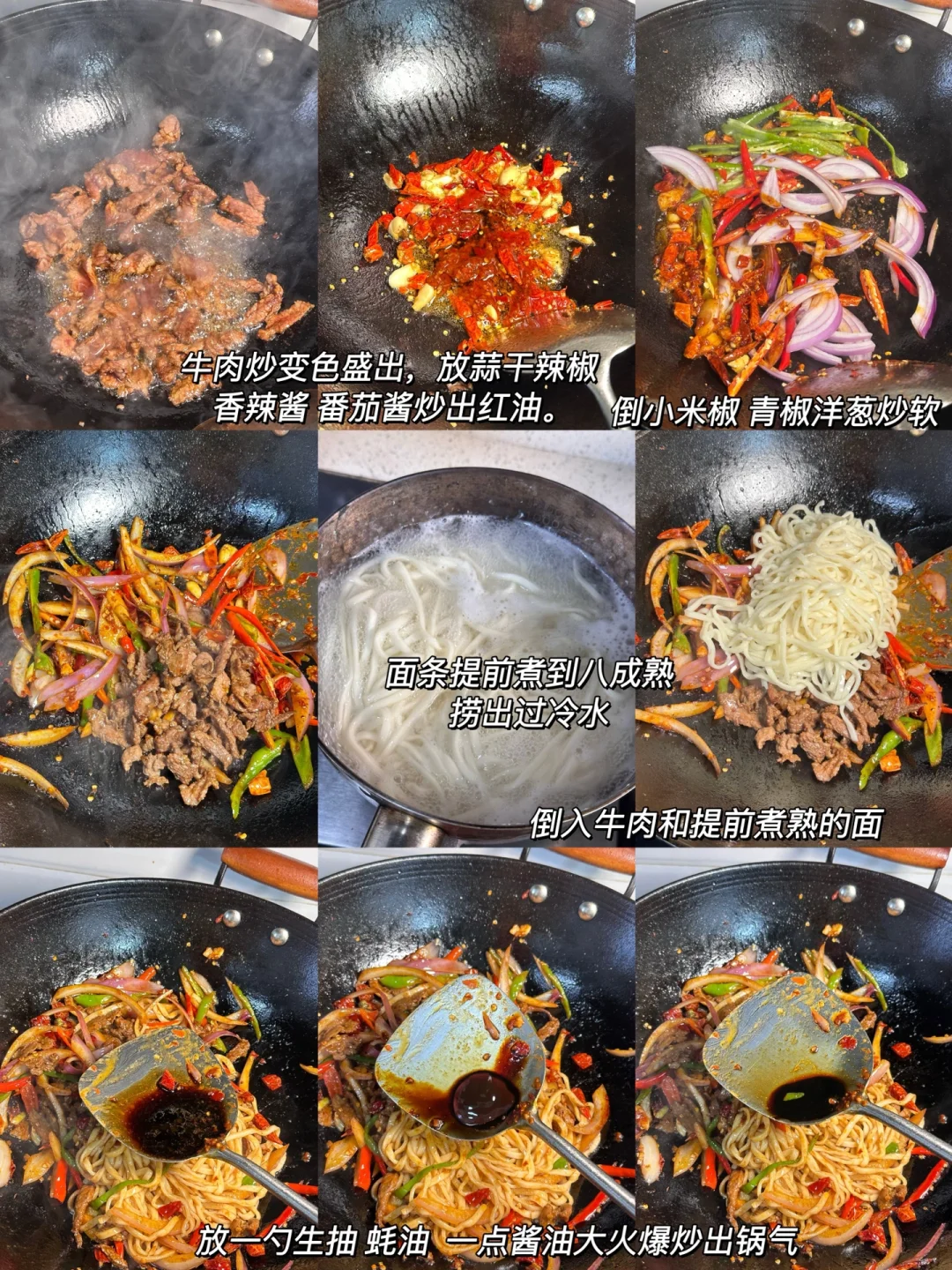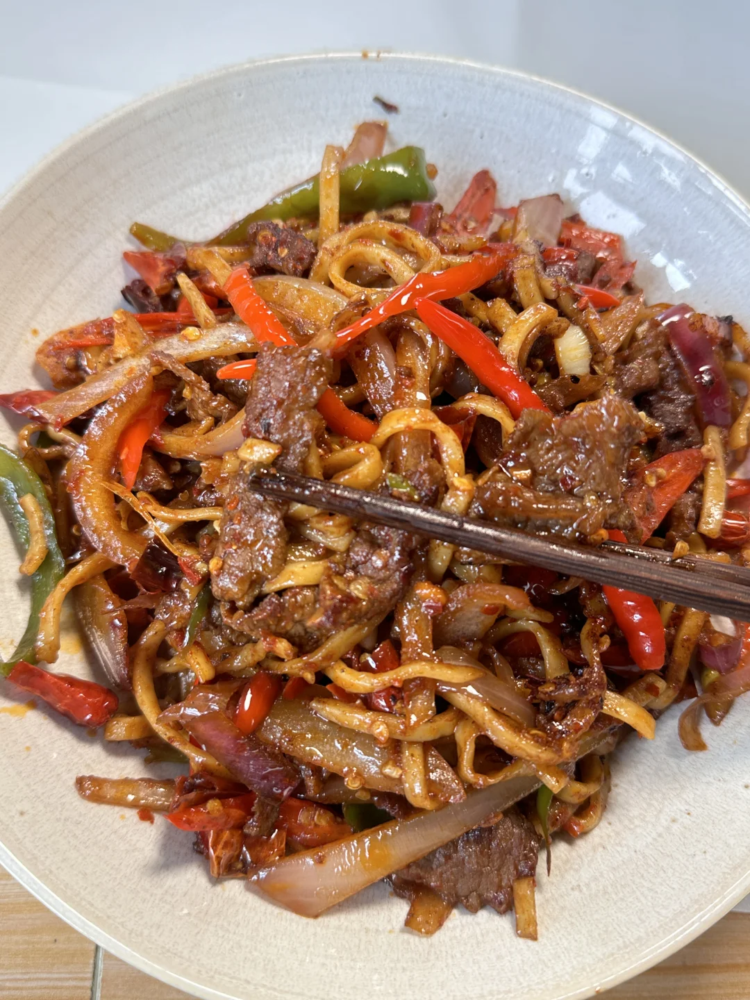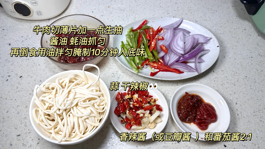 ✨食材:牛肉 鲜面条 洋葱 小米椒 青椒 蒜 干辣椒 香辣酱 番茄酱