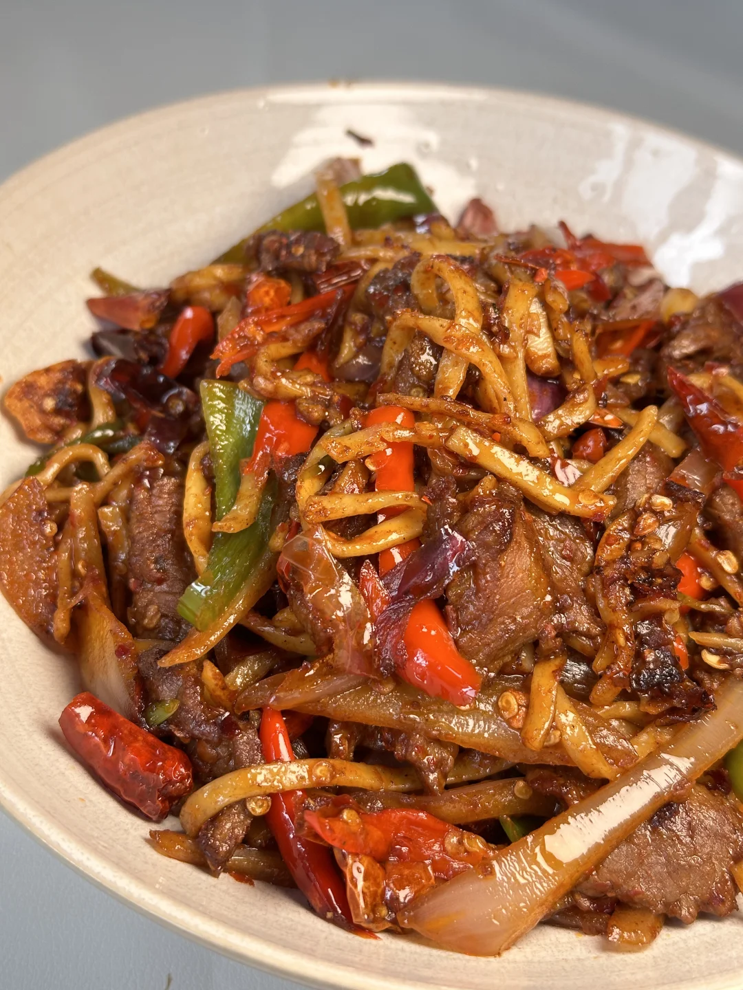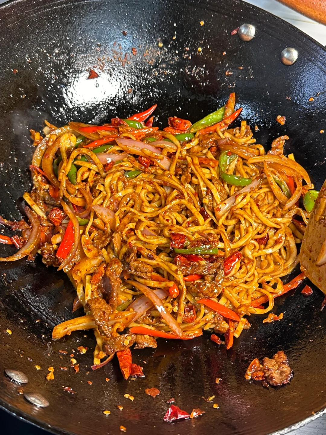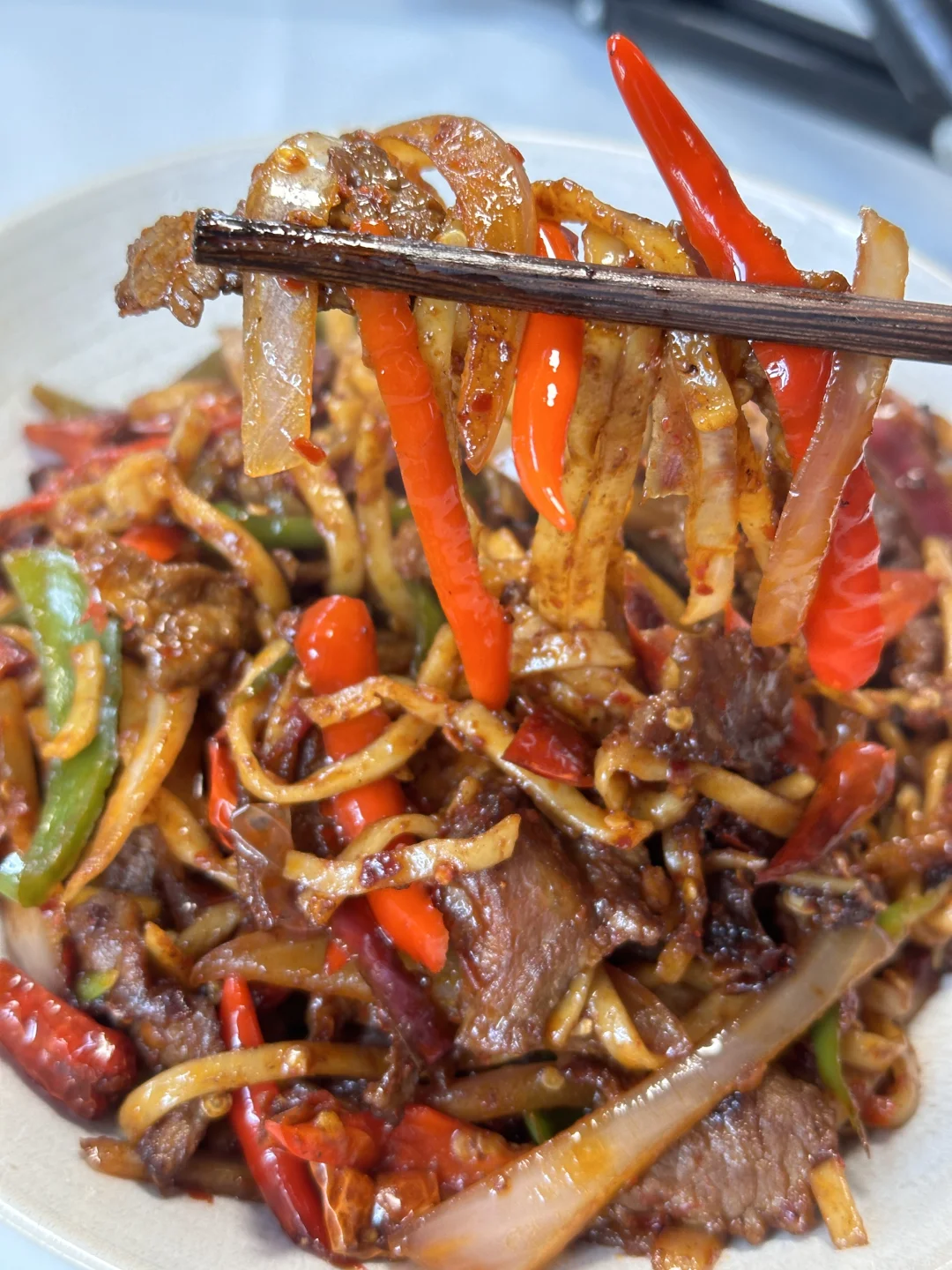 ✨食材:牛肉 鲜面条 洋葱 小米椒 青椒 蒜 干辣椒 香辣酱 番茄酱