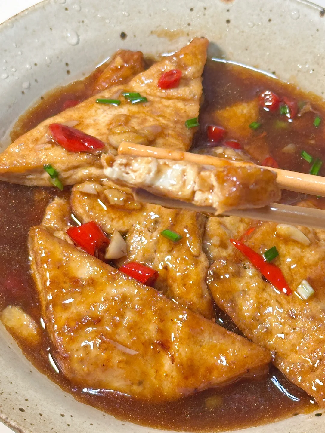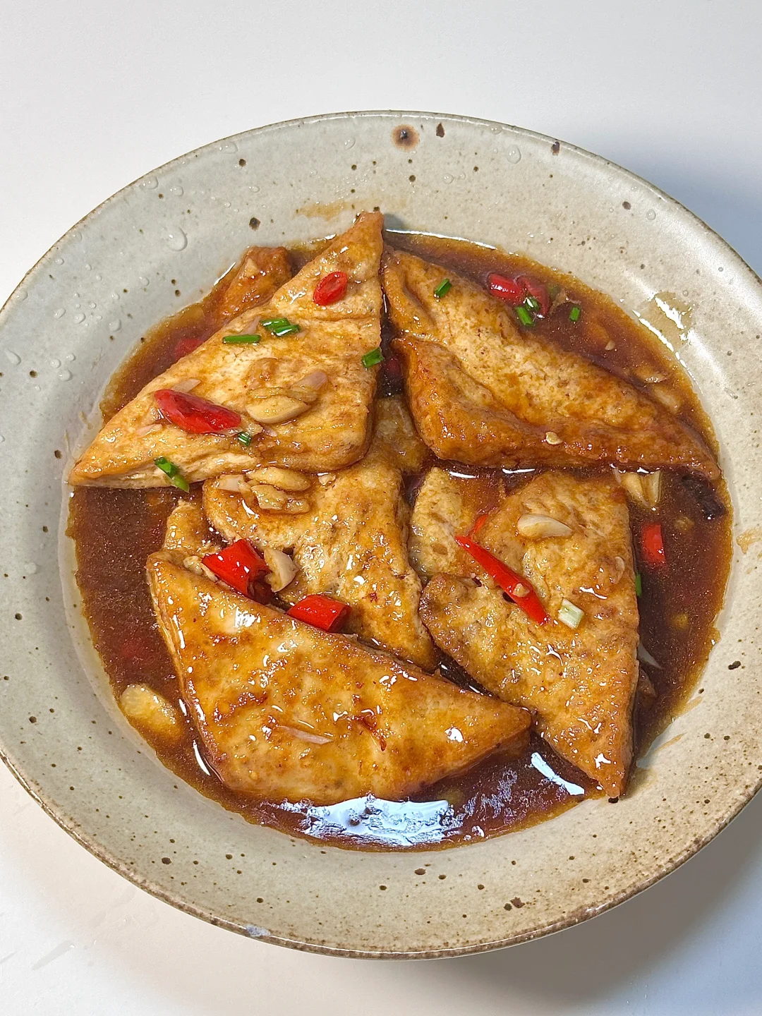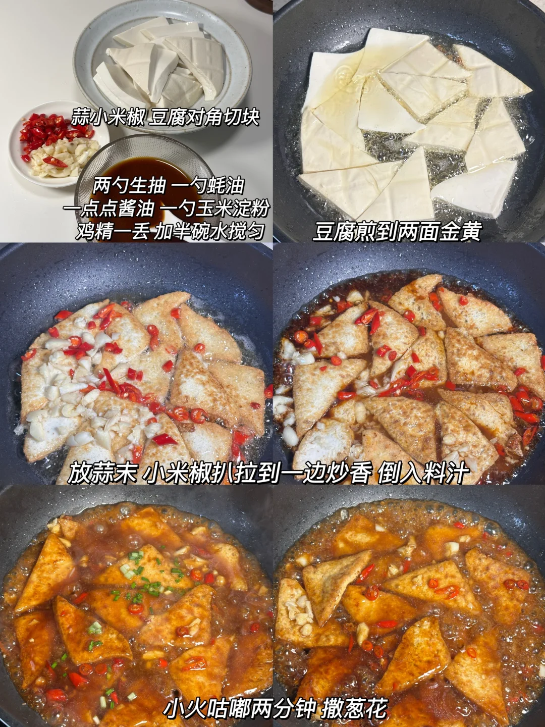 家常酱汁豆腐 外脆里嫩的豆腐 裹满酱汁好入味~ 超简单的下饭菜 一定试试,好吃😋在春天幸福地吃饭 ✨食材:嫩豆腐 蒜末 小米椒 葱 1️⃣:豆腐切块备用。调好酱汁:两勺生抽 一勺蚝油 一点点🤏酱油、一勺玉米淀粉、一丢鸡精加半碗清水搅匀。 不粘锅倒油 放豆腐煎到一面金黄再翻面 煎到两面金黄放蒜 小米椒炒香,倒入酱汁 小火咕嘟两分钟,中途用锅铲翻拌几下。起锅前撒葱花增香 好好吃饭呀🖖🏻
