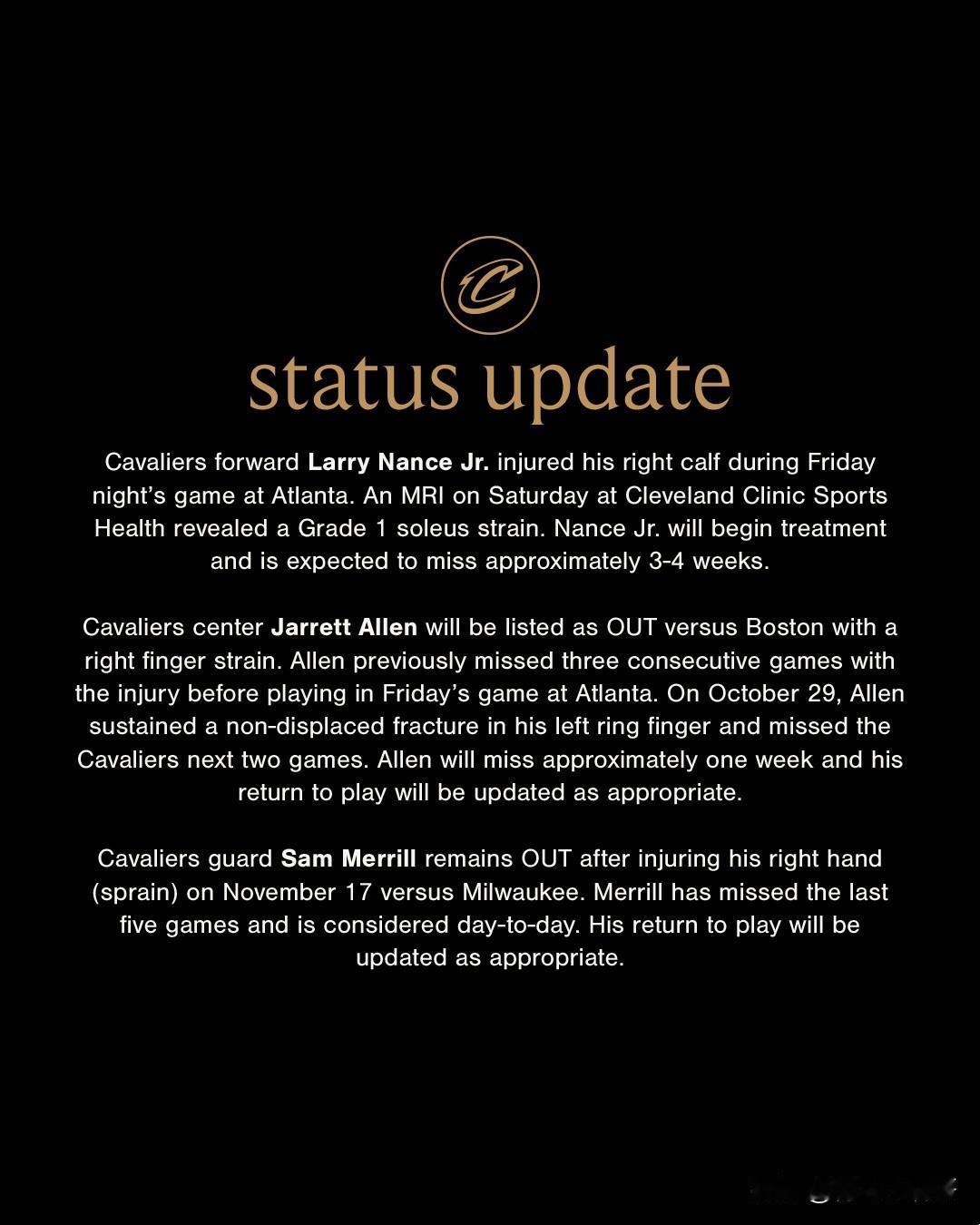 一下伤了三个!!!骑士小南斯、阿伦、梅里尔都进入伤病名单! 新赛季已经打了近20场比赛,四分之一过去了,不少球队都出现了不同程度的伤病困扰,每个赛季都是如此,伤病对于球队的影响是无法预测的。 今天,克利夫兰骑士队也更新了一波伤病报告,他们这一回就伤了三名球员,分别是首发中锋阿伦,以及角色球员小南斯和梅里尔。 其中阿伦最为严重,小腿拉伤,要缺阵3-4周,而小南斯手指拉伤预计一周左右,梅里尔则是右手扭伤,目前进入每日观察名单,他是受影响最小的。 骑士本赛季完全没有了上个赛季的风采,上赛季他们是东部第一,但是最终被以下克上淘汰出局,这个赛季他们似乎没有了上赛季的冲劲,加上球员的伤病影响,他们本赛季并不被十分看好。 骑士 克利夫兰骑士 职业球员伤病