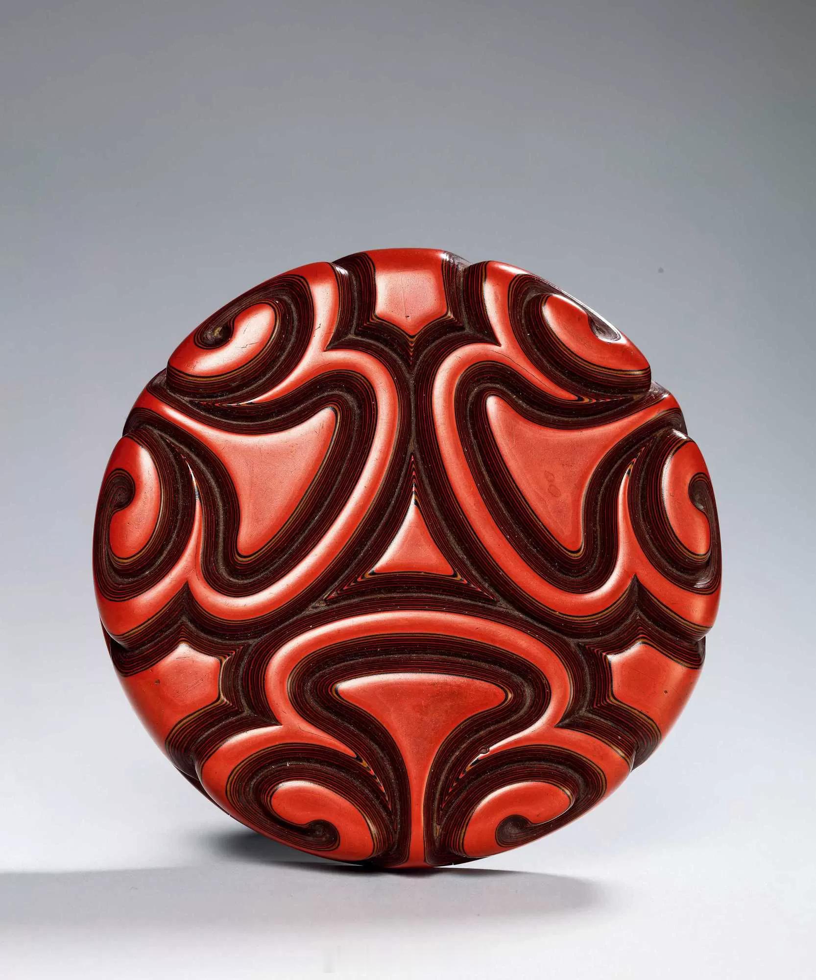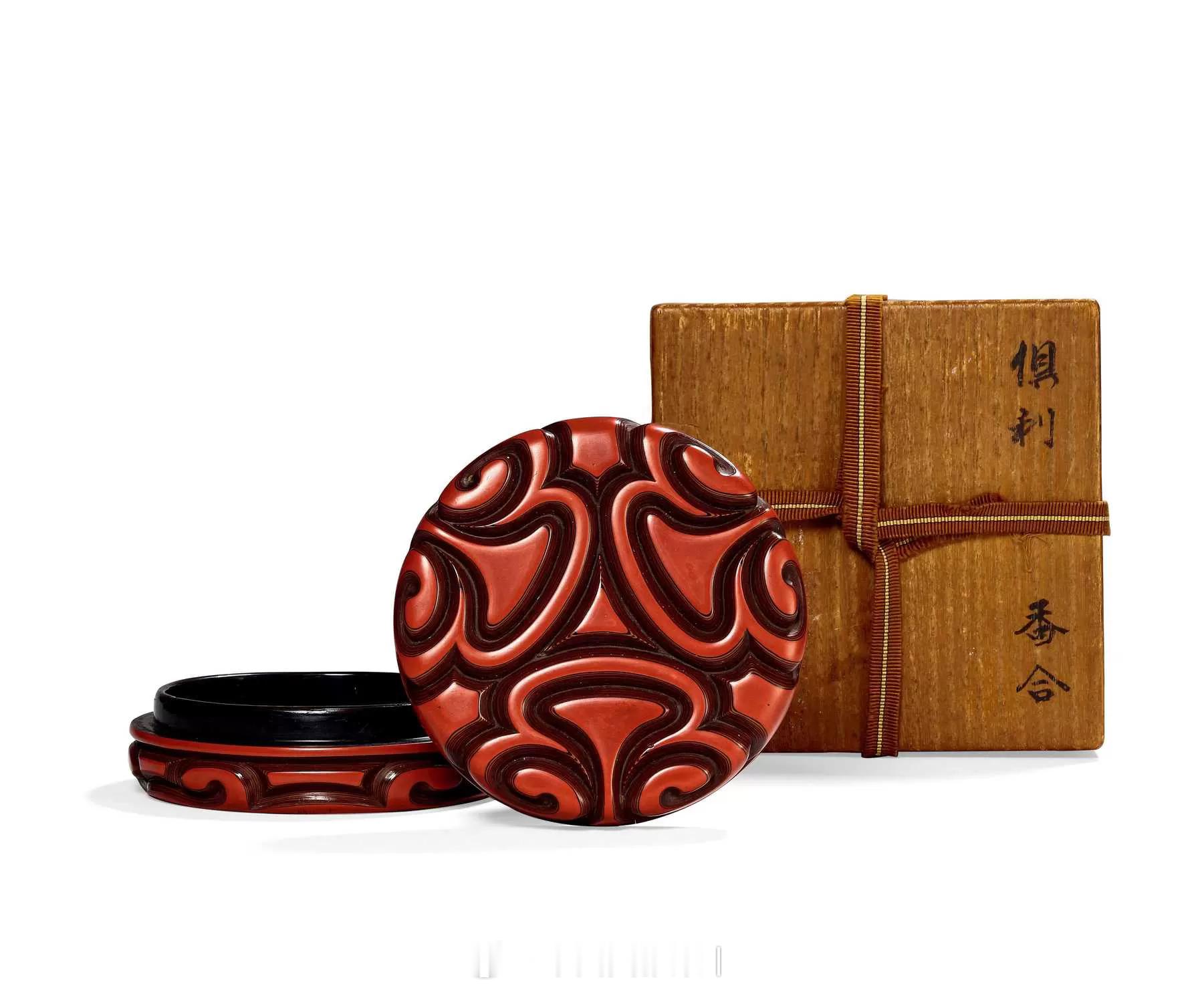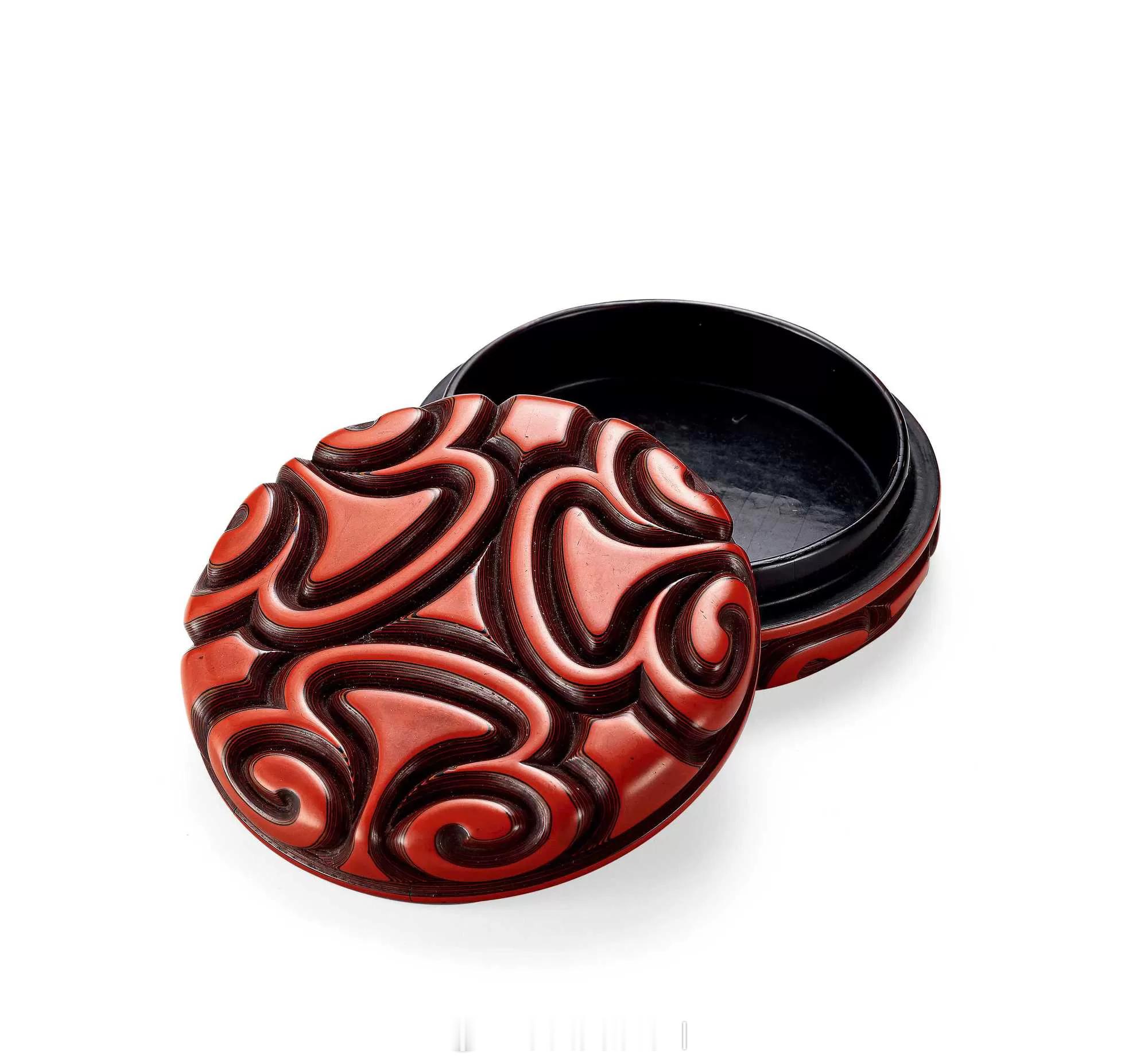 髹饰录 | 元末明初 剔犀如意云纹香盒圆形漆盒,子母口,盖面平,浅腹,平底。外面髹红漆,内面髹黑漆。盒底外髹褐色漆。盖面及腹外壁剔雕如意云头纹,纹饰立体,线条流转舒畅。盒底边缘线刻“张茂造”款识,字口浅细。剔犀,漆器工艺的一种,即在胎骨上以红黑色漆交替刷成若干层,再用刻刀以45度角雕刻出图案,刀口断面即显露出与犀牛角横断面层层环绕的肌理效果。此盖盒灿然成纹,流转自如,回旋生动。漆面细洁油亮,堆漆肥厚丰腴,色泽深沉稳重,打磨圆熟,不让同侪。所雕云纹层次分明且每层均厚度一致,刻工精细,漆色浓艳,云纹流畅,非高人不能为。元代是中国古代雕漆工艺发展的鼎盛时期,当时出现一批有名的雕漆匠师,杨茂、张成是其中最著名的代表。据《嘉兴府志》载:“张成、杨茂,嘉兴府西塘杨汇人,剔红最得名。”而在《日本国志》中亦提到:“江户有杨成者,世以善雕漆录于官。据称其家法,得白元之张成、杨茂”。备注:日本藏家旧藏尺寸:直径10cm来源:保利2025秋拍《醉花荫—海内外名藏漆器》
