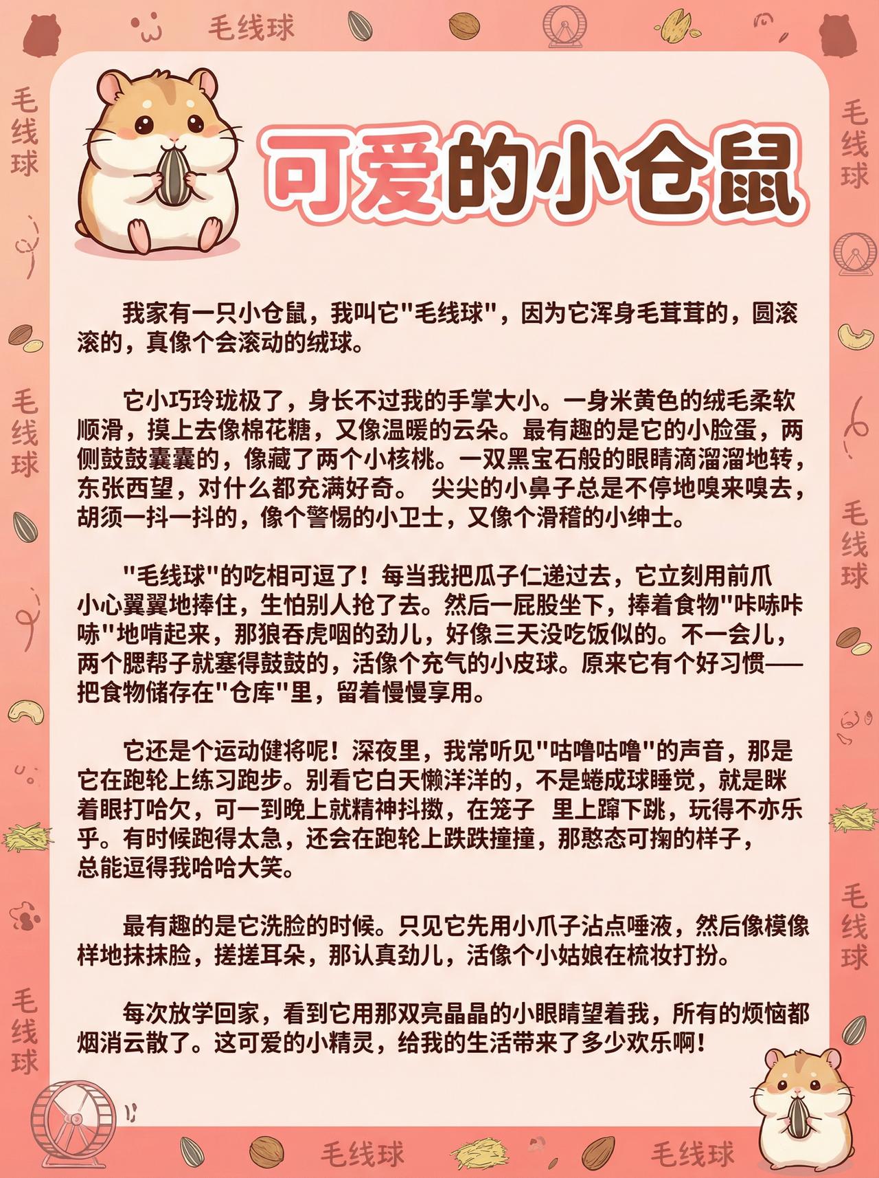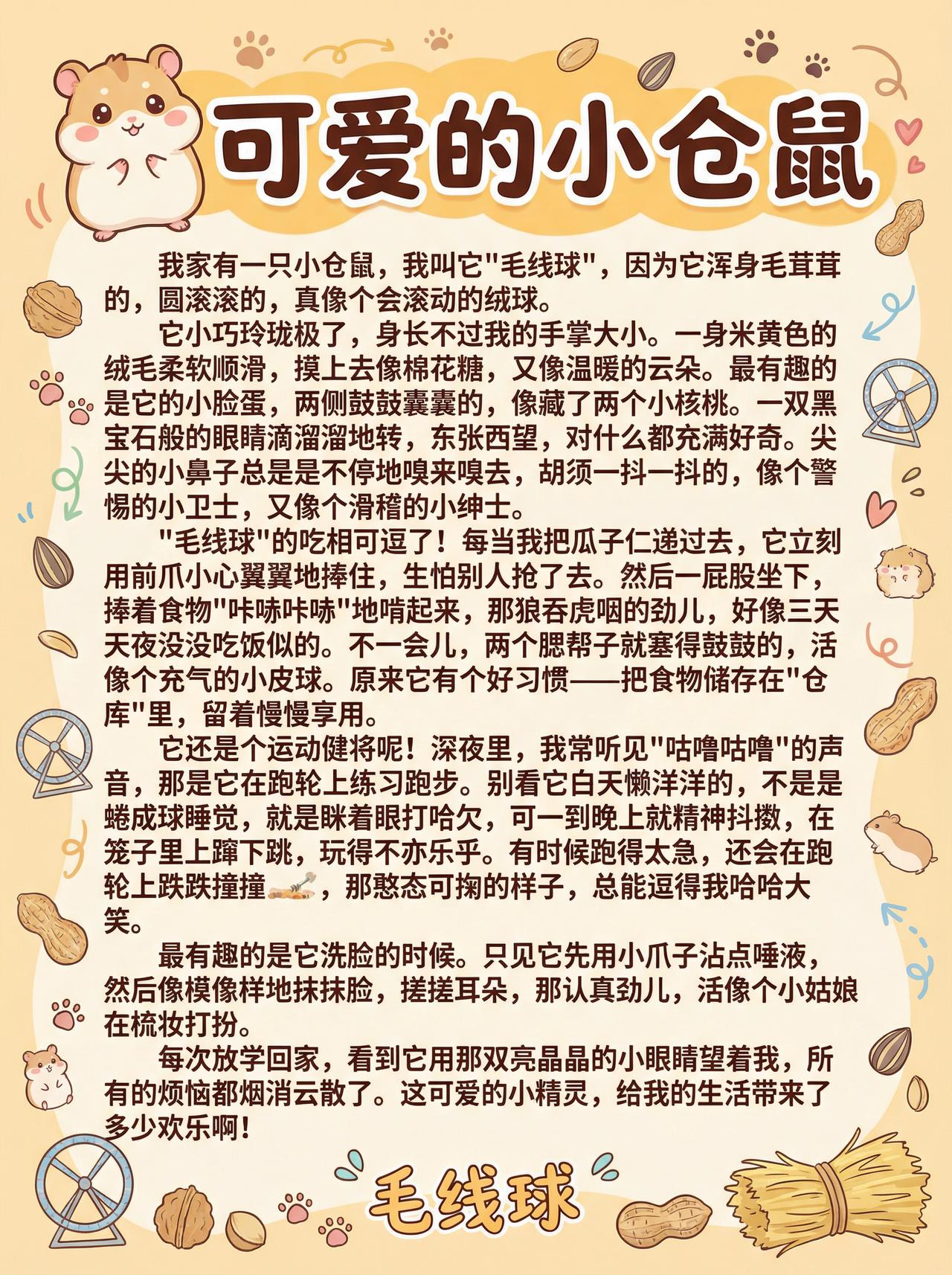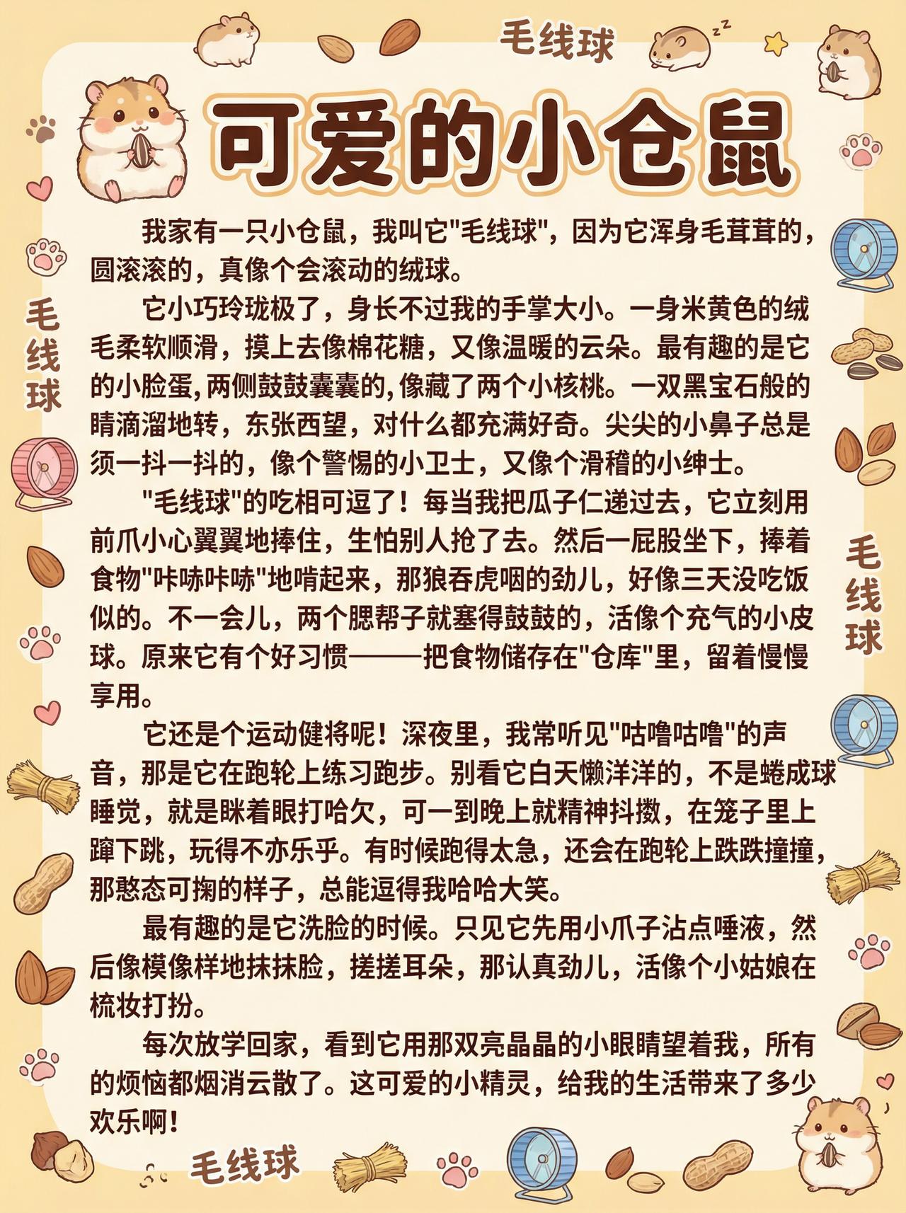 小学生晨读美文素材:《可爱的小仓鼠》 我家有一只小仓鼠,我叫它"毛线球",因为它浑身毛茸茸的,圆滚滚的,真像个会滚动的绒球。 它小巧玲珑极了,身长不过我的手掌大小。一身米黄色的绒毛柔软顺滑,摸上去像棉花糖,又像温暖的云朵。最有趣的是它的小脸蛋,两侧鼓鼓囊囊的,像藏了两个小核桃。一双黑宝石般的眼睛滴溜溜地转,东张西望,对什么都充满好奇。尖尖的小鼻子总是不停地嗅来嗅去,胡须一抖一抖的,像个警惕的小卫士,又像个滑稽的小绅士。 "毛线球"的吃相可逗了!每当我把瓜子仁递过去,它立刻用前爪小心翼翼地捧住,生怕别人抢了去。然后一屁股坐下,捧着食物"咔哧咔哧"地啃起来,那狼吞虎咽的劲儿,好像三天没吃饭似的。不一会儿,两个腮帮子就塞得鼓鼓的,活像个充气的小皮球。原来它有个好习惯——把食物储存在"仓库"里,留着慢慢享用。 它还是个运动健将呢!深夜里,我常听见"咕噜咕噜"的声音,那是它在跑轮上练习跑步。别看它白天懒洋洋的,不是蜷成球睡觉,就是眯着眼打哈欠,可一到晚上就精神抖擞,在笼子里上蹿下跳,玩得不亦乐乎。有时候跑得太急,还会在跑轮上跌跌撞撞,那憨态可掬的样子,总能逗得我哈哈大笑。 最有趣的是它洗脸的时候。只见它先用小爪子沾点唾液,然后像模像样地抹抹脸,搓搓耳朵,那认真劲儿,活像个小姑娘在梳妆打扮。 每次放学回家,看到它用那双亮晶晶的小眼睛望着我,所有的烦恼都烟消云散了。这可爱的小精灵,给我的生活带来了多少欢乐啊! 【荣恒】25新版1-6年级 337主题晨读美文每天半小时 养成阅读好习惯
