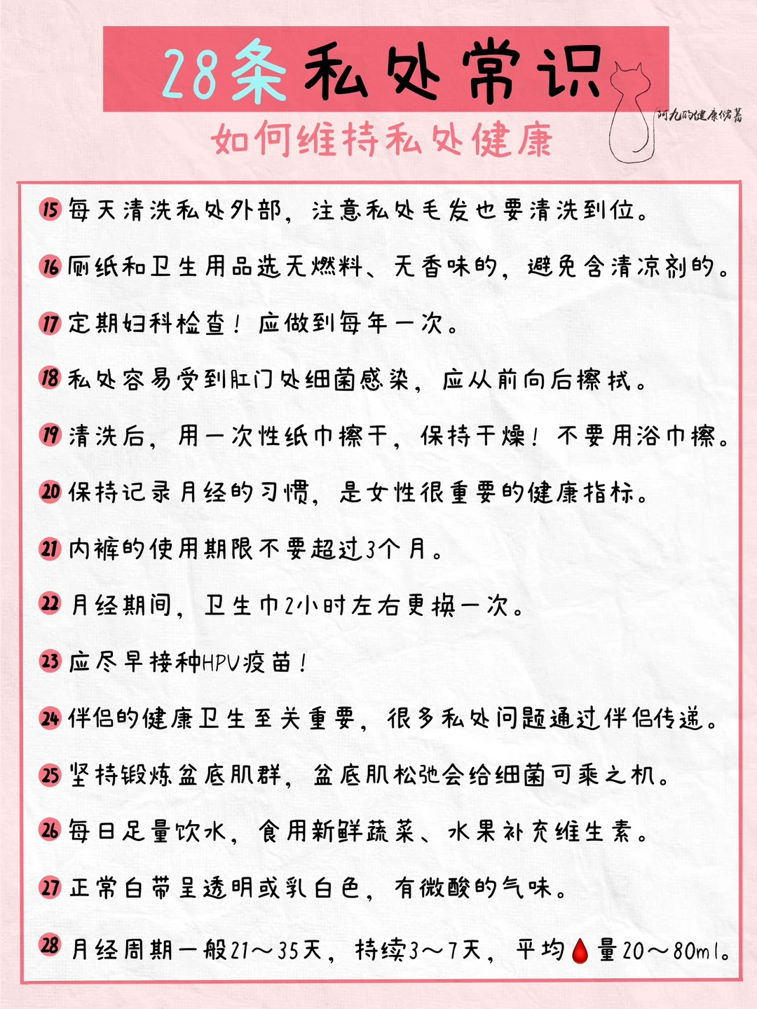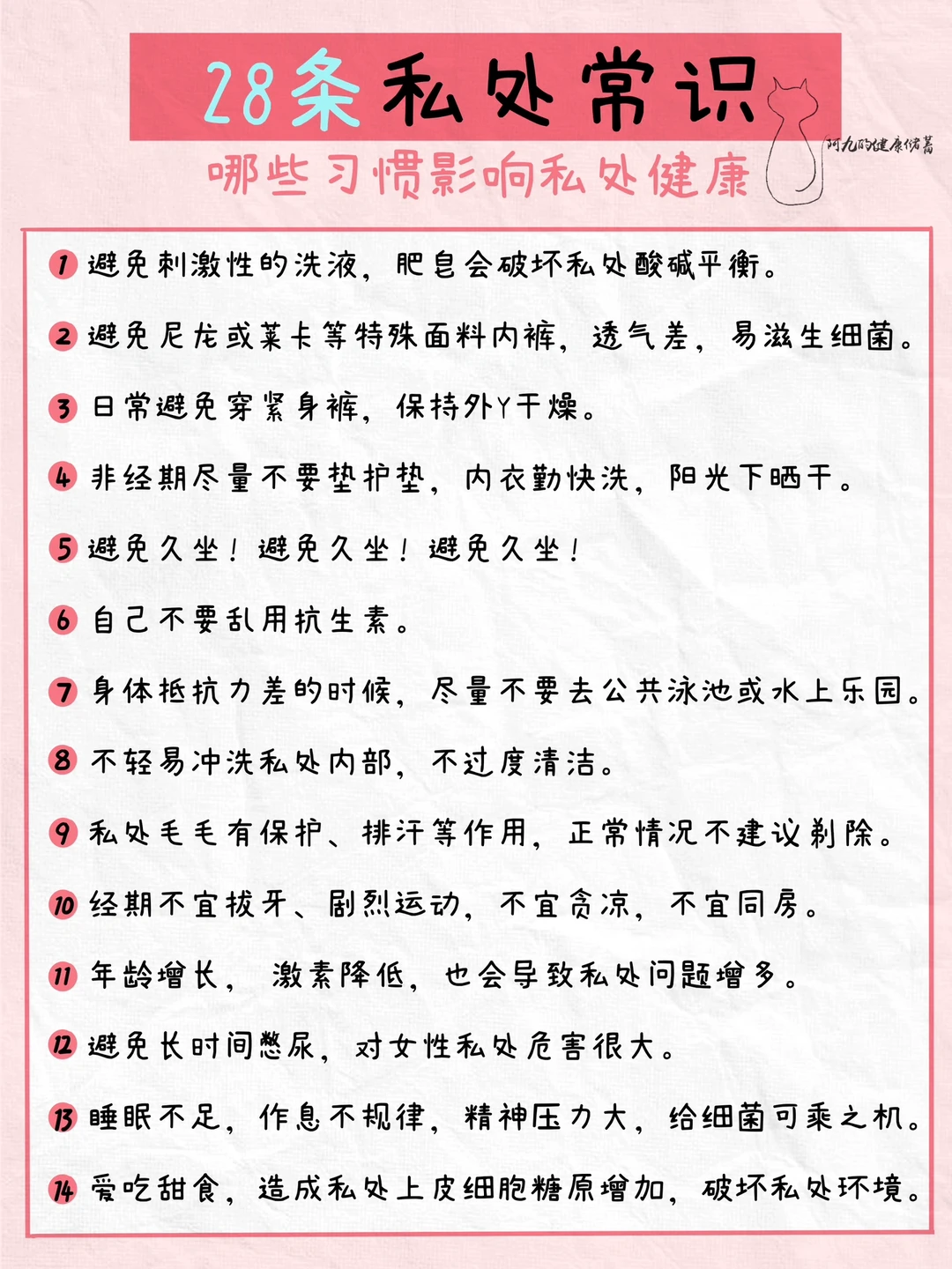 这2️⃣8️⃣条算是私处养护很全面的干货,如果对照去做,会从中受益良多!有些看似很简单,但容易被大家忽视,坏习惯经年累月,就会引发各种问题了。