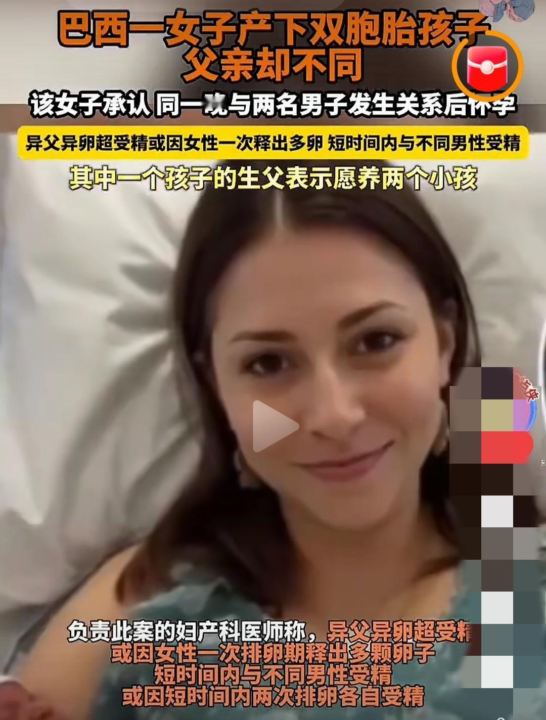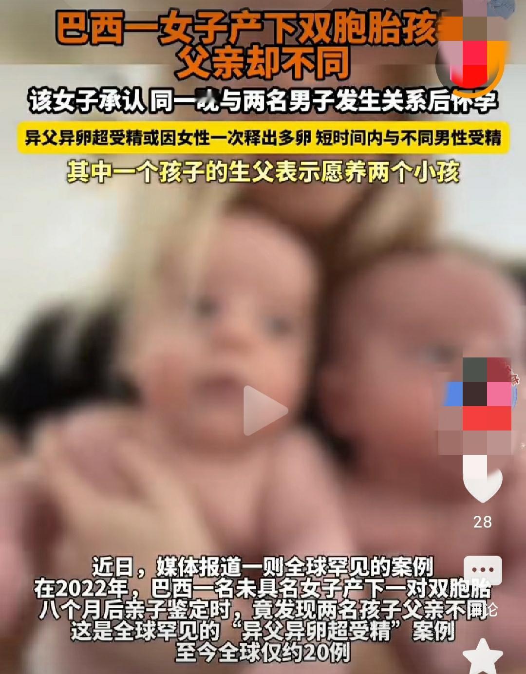 看她骄傲自豪的模样,是发自内心的,异父异卵双胞胎母亲高兴得合不拢嘴。 据报道,2022年巴西一名女子产下一对双胞胎。经亲子鉴定,双胞胎的生父不是同一个人。据悉,这样的情况至今全球仅约20例。后该女子承认,同一晚上她与两名男子发生关系后怀孕。 这种情况不知道让人说什么好,这也可能就是文化差异。对巴西这名女子来说,一次生个双胞胎,不管父亲是谁,总是他的子女,当然高兴。也让人看到这名女子的性行为、生育能力不是一般女子可以比拟的。还有她的思维倾向,不感觉有什么丢人或者不好意思,大概率有一个向世人炫耀之意。 这样的情况,世界仅约20例。这20例是发现的,没有发现、没有鉴定的可能远不止这个数字。但总的来说,这样的情况和概率还是非常低的。 不管怎么说,孩子是无辜的。祝愿小孩在父母的呵护下,健康成长。 巴西现全球第20例异父异卵双胞胎 如何看待巴西现全球第20例异父异卵双胞胎