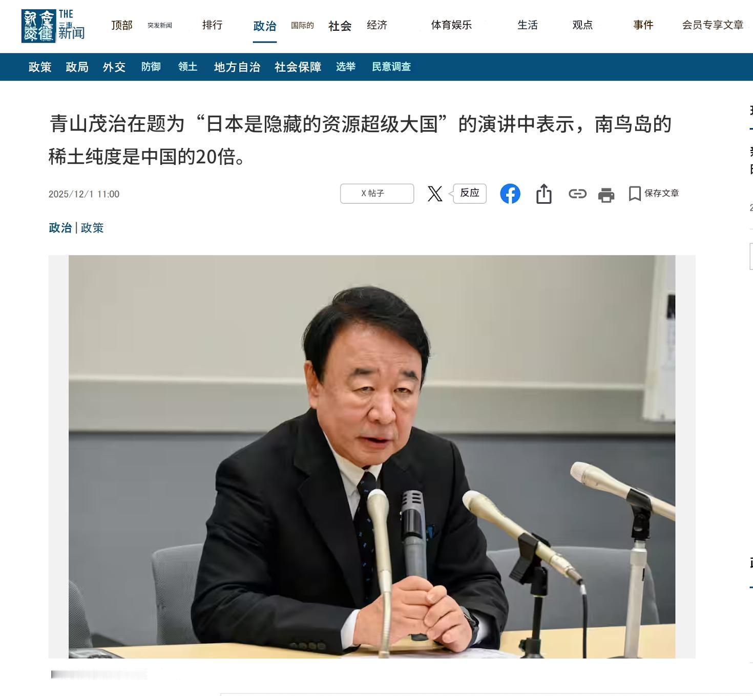 小日子自民党参议员表示,日本是隐藏的资源超级大国,南鸟岛附近海域的稀土泥浆,其纯