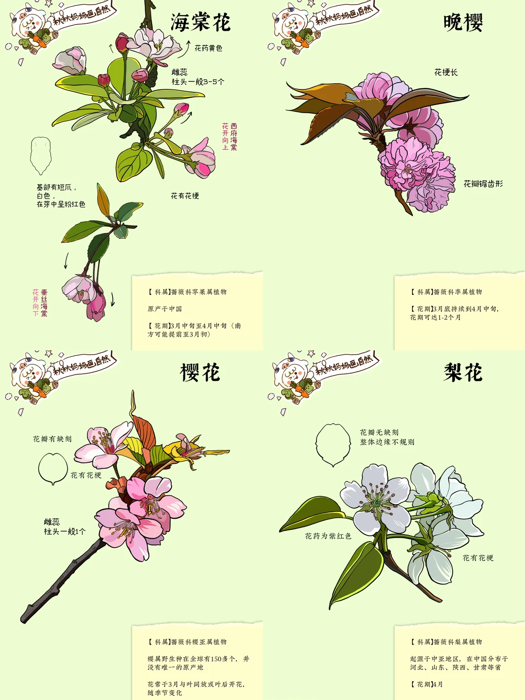 🌸 梨花、西府海棠、晚樱:它们的花期大致在4-5月。梨花成簇开放,花蕊带点红色,花和叶子都比较大,边开花边长叶,花瓣洁白如雪,花蕊略带粉红;西府海棠成簇开放,开花同时长叶,花瓣具有由红到粉、粉到白的层次渐变;晚樱的叶片为椭圆状卵形,小枝灰白色或淡褐色,花瓣粉色,倒卵形,花瓣先端下凹。