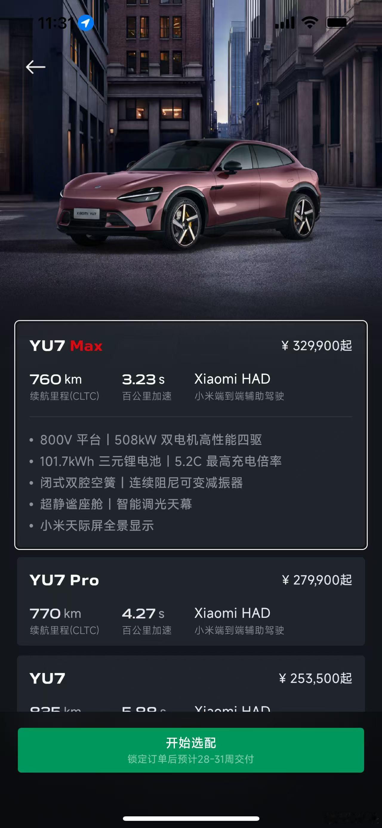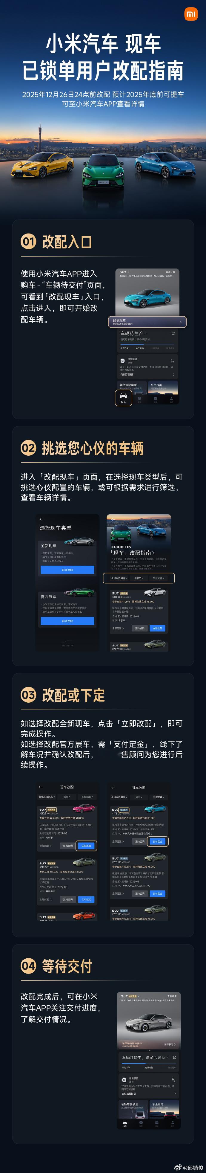 小米官方微博推出了现车销售政策,包括全新现车、官方展车和准新车。这招有点意外。一般来说,各车企都有大量这种情况,但是,都是在线下悄悄的干,不会大张旗鼓的,毕竟这会有点引起猜忌,是卖不动了?要变相降价?从定单看,小米交付周期进一步缩短:SU7 MAX 和PRO:上周:6-9周,现在:3-6周。SU7标准版:上周:29-32周,现在:26-29周。SU7 ULTRA:上周:6-9周,现在:4-7周。YU7 MAX:上周:32-35周,现在:28-31周。YU7 PRO:上周:32-35周,现在:32-35周。YU7 标准:上周:32-35周,现在:35-38周。---消息--据小米汽车官微消息,小米汽车「现车选购」即将开启,现车包含全新现车、官方展车、准新车。所有现车都已通过严格质检,部分车型经官方修复,都是没有登记过的车辆。官方称,购买现车,可享快速提车、完整原厂质保和售后,部分车型可享优惠。2025 年 12 月 26 日 24 点前锁单,预计 2025 年底前可提车。如因小米汽车的原因导致 2026 年完成开票交付,可享跨年购置税补贴。