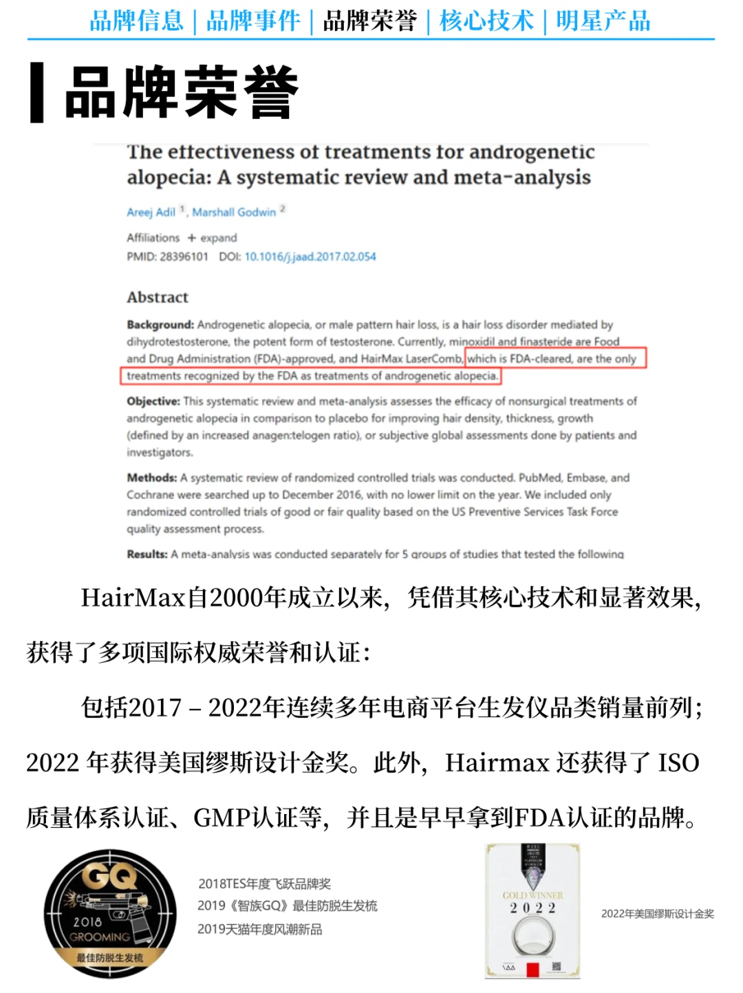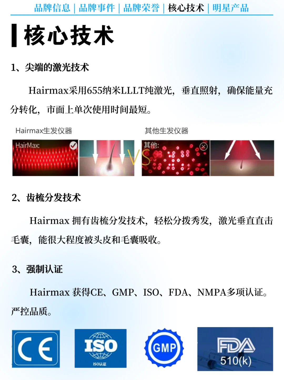 🥇 品牌荣誉:HairMax自2000年成立以来,凭借其核心技术和显著效果,获得了多项国际权威荣誉和认证:包括2017 – 2022年连续多年电商平台生发仪品类销量前列;2022 年获得美国缪斯设计金奖。此外,Hairmax 还获得了 ISO 质量体系认证、GMP认证等。