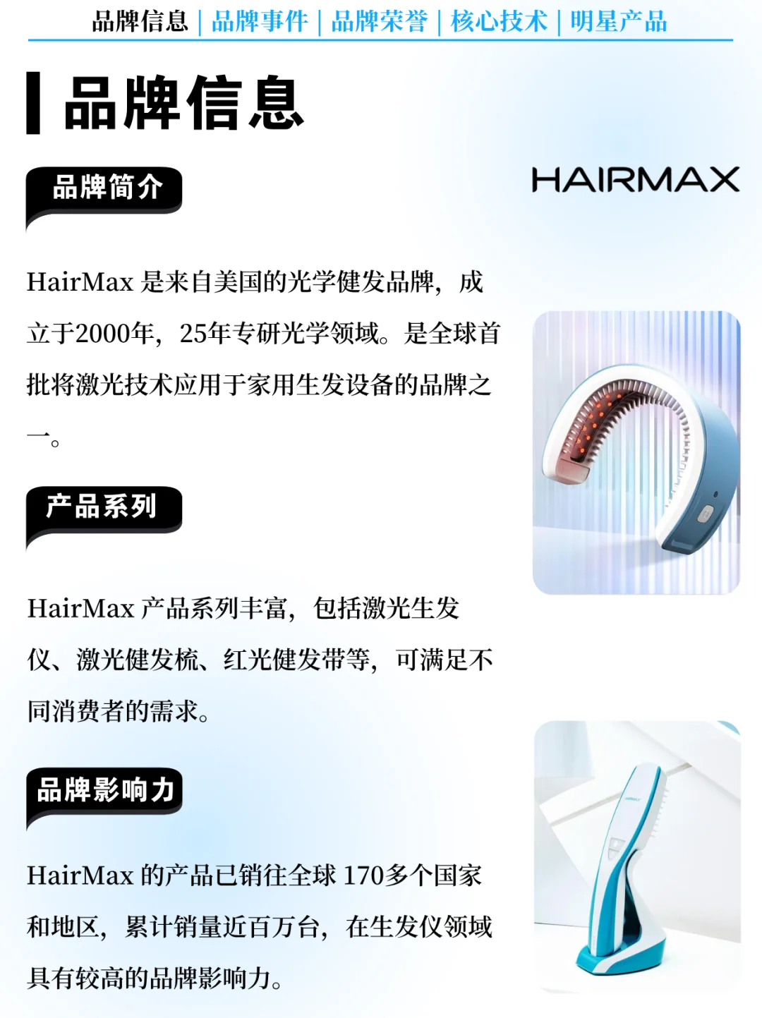 [火R] 品牌影响力:HairMax 的产品已销往全球 170多个国家和地区,累计销量近百万台,在生发仪领域具有较高的品牌影响力。