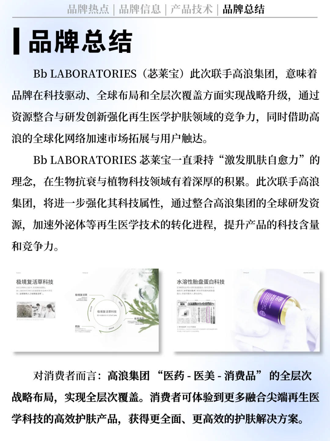 [三R] 在产品层面,高浪集团全面实行 “医药 - 医美 - 消费品” 的全层次战略布局,将助力 BbLAB苾莱宝实现从医疗级技术到消费级产品的有效转化,构建覆盖更多元需求和场景的科技护肤产品生态。