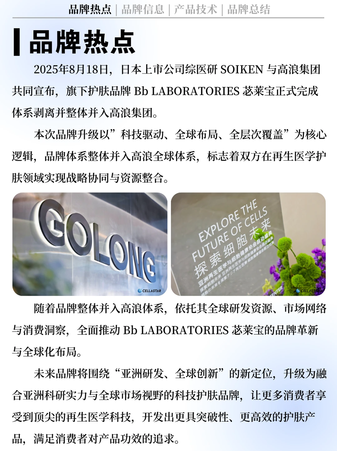 ⏰2025年8月18日,日本上市公司综医研SOIKEN与高浪集团共同宣布,旗下护肤品牌Bb LABORATORIES苾莱宝正式完成体系剥离并整体并入高浪集团。[烟花R] 本次品牌升级以“科技驱动、全球布局、全层次覆盖”为核心逻辑,并深度融合8月11日首届“亚洲再生医学与细胞健康启航峰会”的前沿共识,彰显了高浪集团通过整合尖端技术与全球资源,构建从医疗级到消费级全层次产品生态的战略突破。
