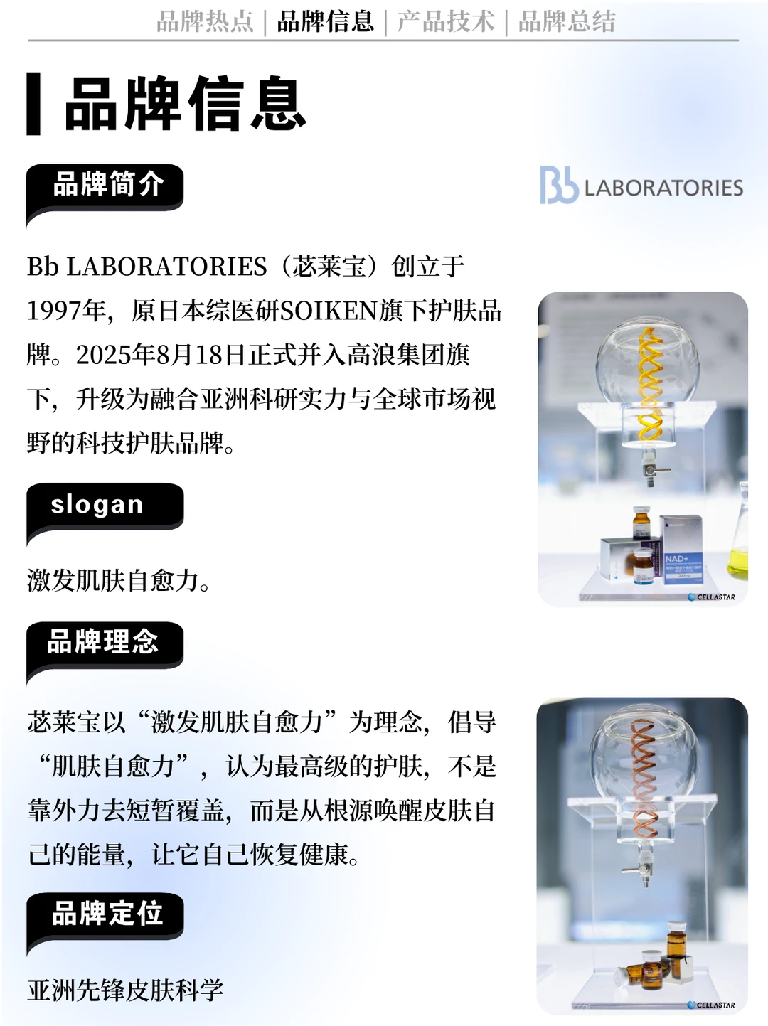 [向右R] Bb LABORATORIES苾莱宝秉持“激发肌肤自愈力”的品牌理念,已有28年研发与市场积淀,凭借综医研CELLASTAR干细胞研究中心的技术资源和对前沿再生医学的科研掌握,不断进行研究创新。