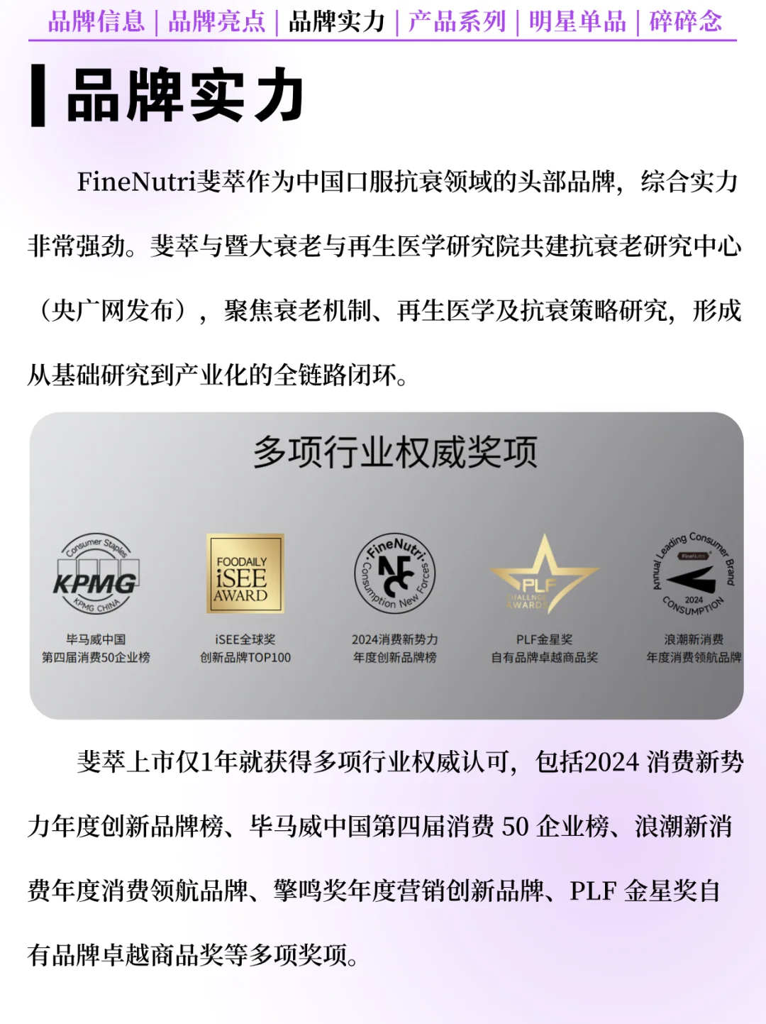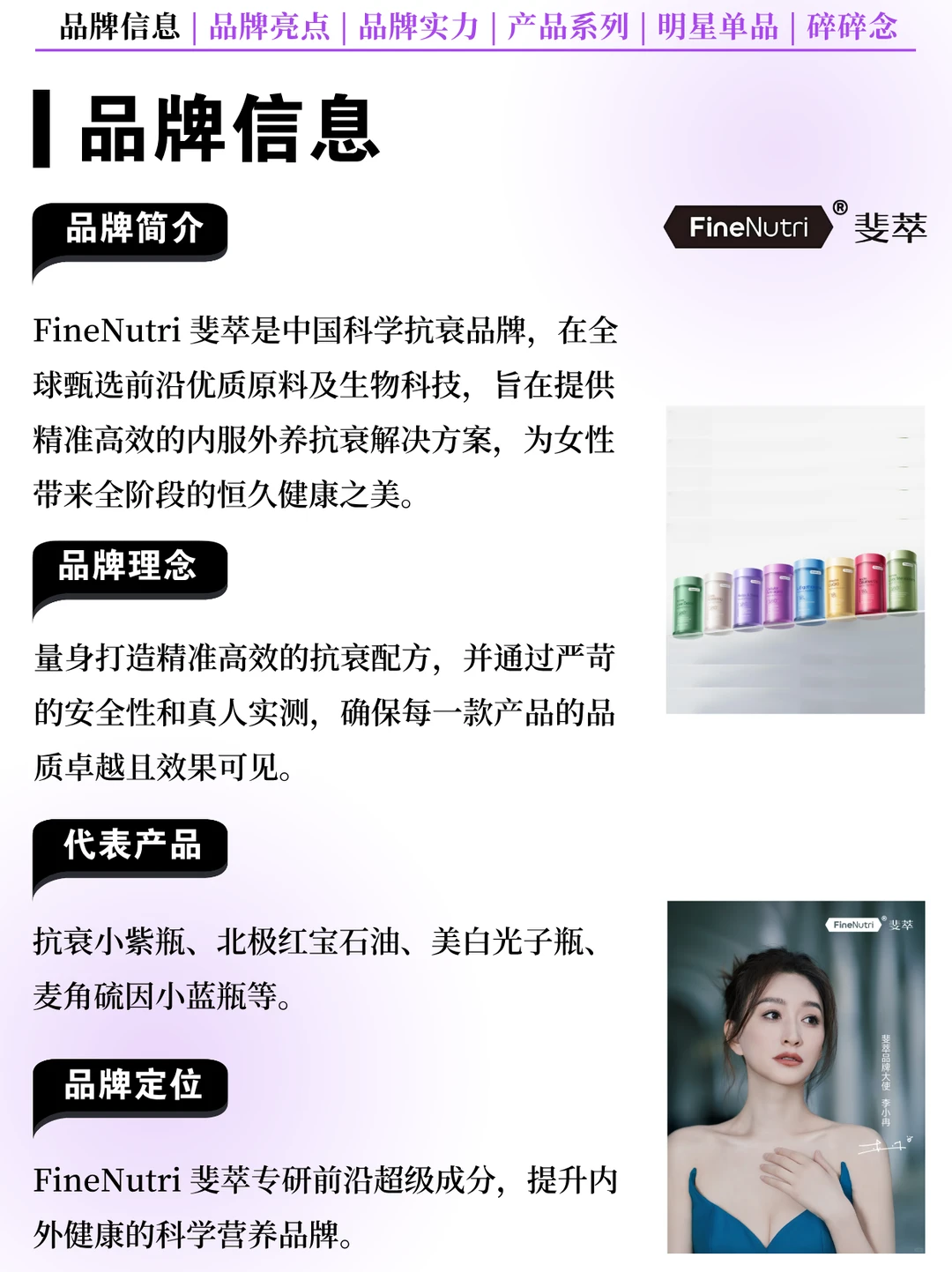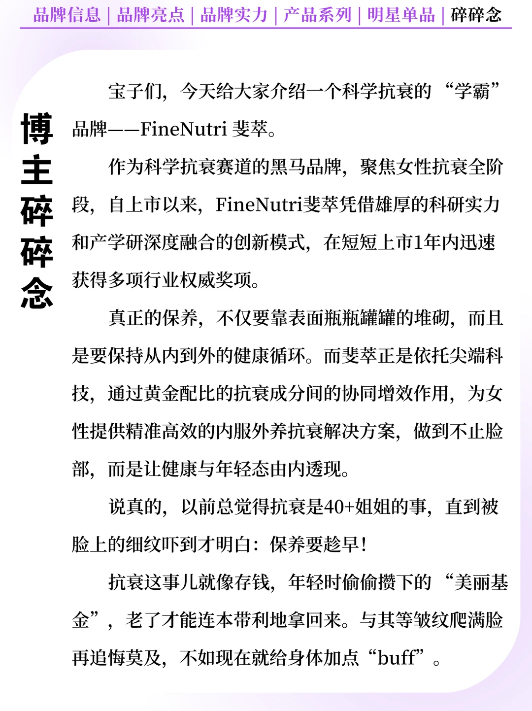[向右R] 品牌简介:FineNutri 斐萃是中国科学抗衰品牌,在全球甄选前沿优质原料及生物科技,旨在提供精准高效的内服外养抗衰解决方案,为女性带来全阶段的恒久健康之美!