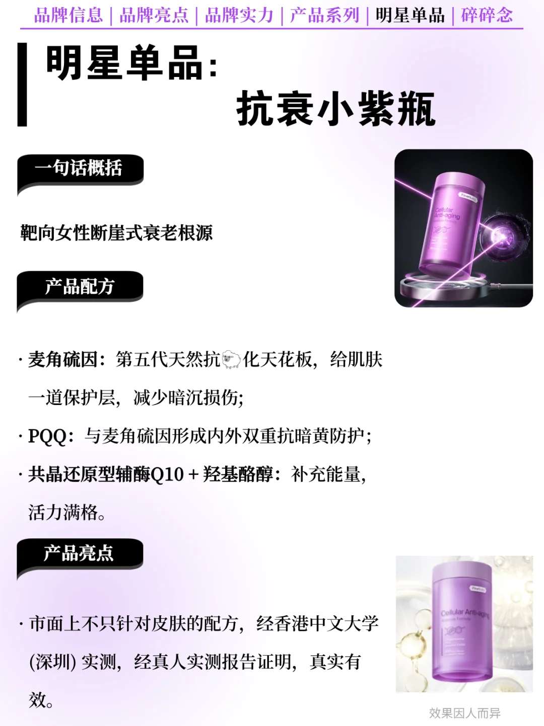 麦角硫因小紫瓶:配方优势——4大抗衰成分:保鲜因子麦角硫因+能量因子辅酶Q10+ 焕能因子PQQ+羟基酪醇,是市面上唯一不只针对脸部皮肤的全面抗衰配方,经真人临🛏️实测报告证明,真实有效