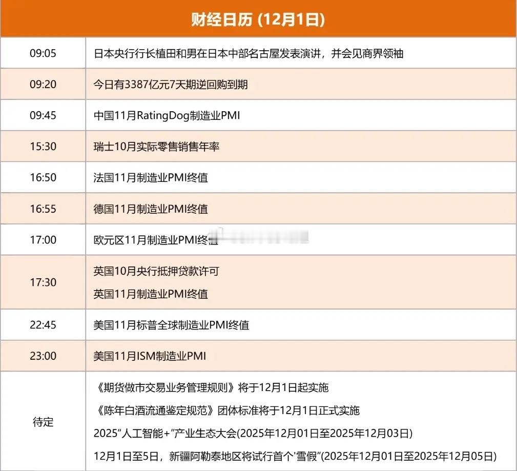 12.1股市早知道:1、外盘汇总:还是涨,如图一。 2、交易提示:无。 3、财经日历:如图二。 4、三大指数:1)大盘:继续看涨2)创指:继续看涨3)科创50:继续看涨 5、重要新闻:1)国家发展改革委:进一步拓宽市场准入空间、强化要素支持保障、加强合法权益保护等,不断激发民间投资活力;2)证监会就《证券期货市场监督管理措施实施办法(征求意见稿)》公开征求意见;3)市场监管总局会同国家网信办制定《直播电商监督管理办法》;4)央行等十部门联合发布《关于进一步防范和处置虚拟货币交易炒作风险的通知》要求;5)国家统计局:11月份制造业PMI为49.2%,非制造业商务活动指数为49.5%。 6、市场动态:1)上海印发《上海市海洋产业发展规划(2026—2035年)》;2)深交所:调整深证成指、创业板指、深证100、创业板50等指数样本股;3)上证50、上证180、上证380、科创50等指数样本调整,12月12日收市后生效;4)安徽证监局严肃查处立方数科严重财务造假案件;5)湖南:深入推进数字湖南建设,大力实施“人工智能+”行动。 7、公司公告:1)峨眉山A:开展股东回馈活动,持500股及以上股东可免景区门票;2)东方财富:三名高管拟合计减持不超334.99万股;3)长安汽车:拟以自有资金出资2.25亿元参与设立长安机器人公司;4)中国巨石:振石集团拟5.5亿元—11亿元增持公司股份;5)天风证券:因涉嫌信息披露违法违规、违法提供融资被立案;6)晶科能源:明年储能系统发货目标翻倍增长;7)ST立方:因2021-2023年年报存在虚假记载可能触及重大违法强制退市情形;8)恩捷股份:拟购买中科华联100%股权,股票停牌。(关注点赞+评论,陪你一起到牛市)财经今日看盘股票